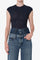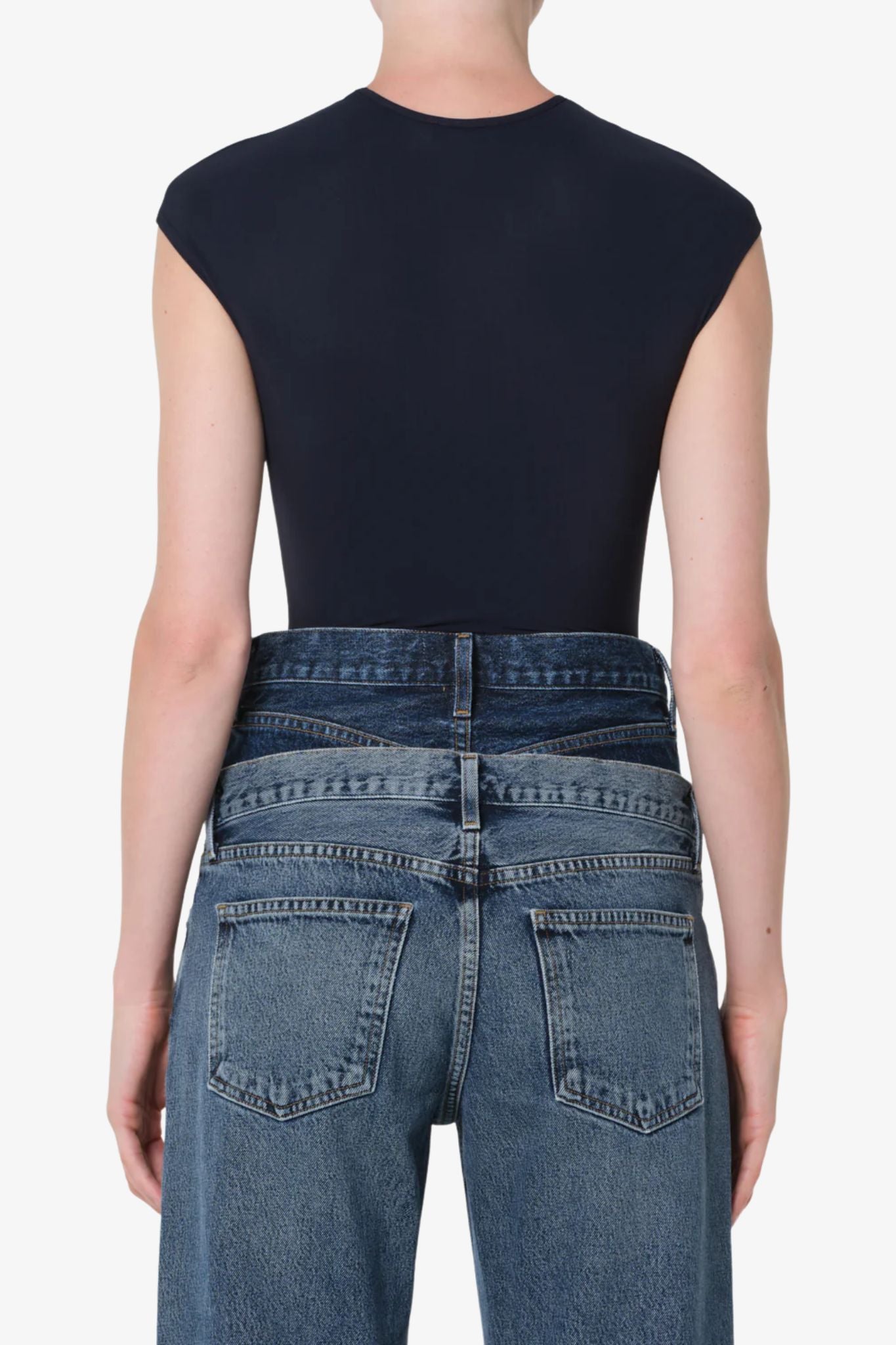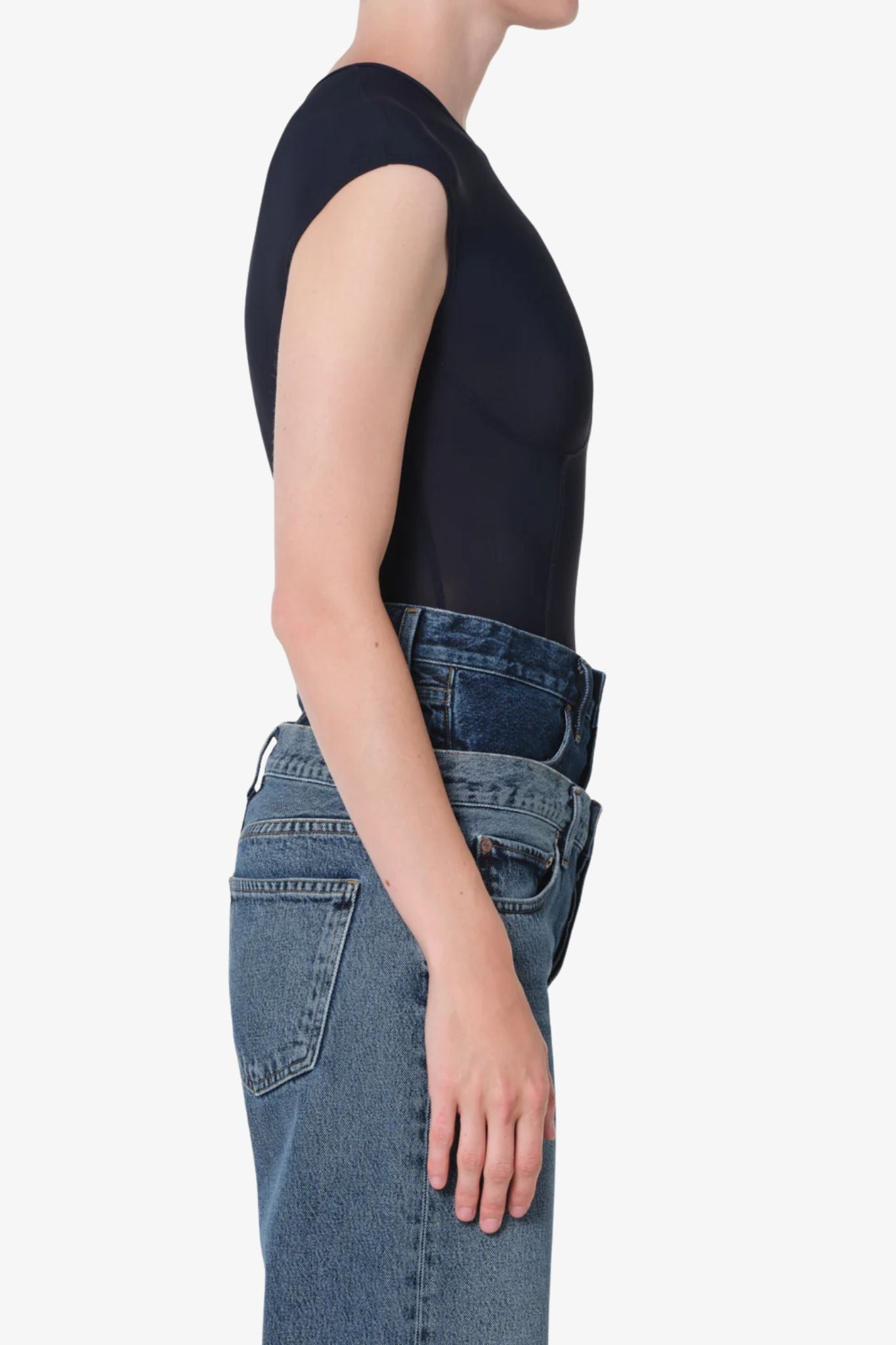 Deep navy cap sleeve bodysuit with corset detailing, cut from a lightweight, second-skin elastane blend. Fitted and flexible, it sculpts the body while allowing effortless movement for a sleek, modern silhouette.