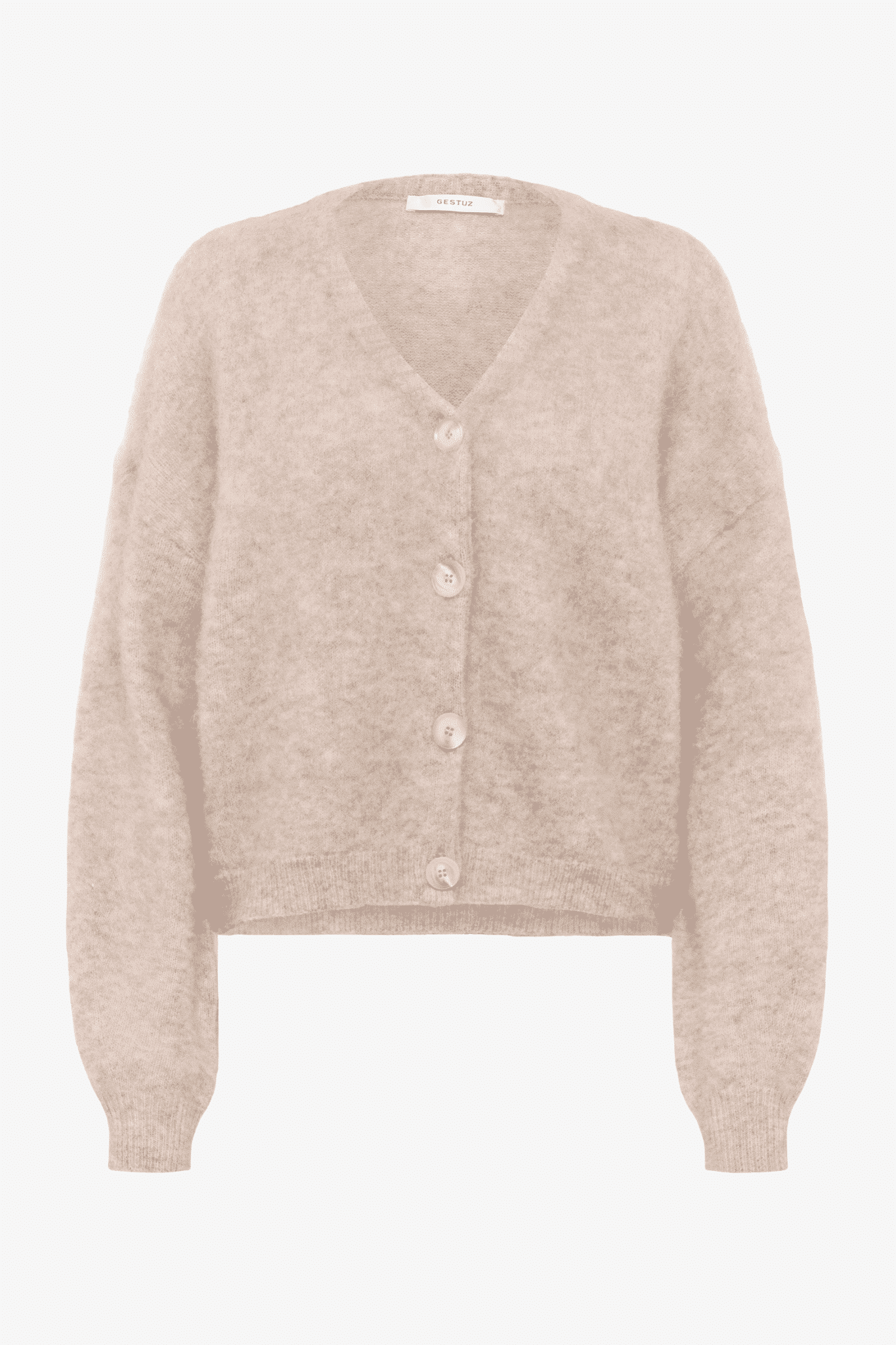 Zachte cardigan voor dames - Ontdek de perfecte aanvulling op je garderobe met deze beige cardigan van Gestuz. Gemaakt van hoogwaardige materialen, biedt deze cardigan een comfortabele en warme fit dankzij de zachte stof en korte pasvorm. De stijlvolle V-hals en knoopsluiting geven het ontwerp een moderne twist. Details zoals de ribboorden bij de mouwen en zoom zorgen voor een verfijnde afwerking.
