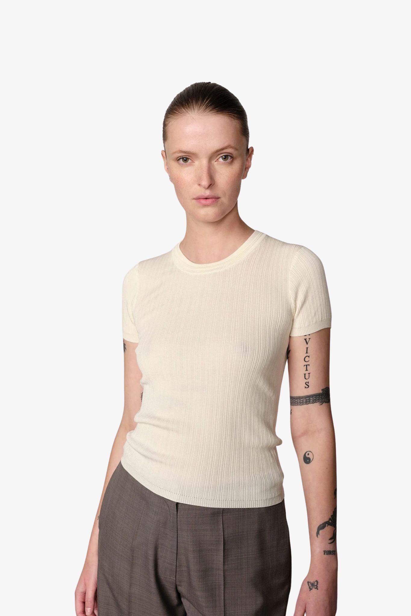The Herskind Rib-Knit Tee is a polished wardrobe essential, crafted from a luxurious blend of 69% Lyocell, 25% Cotton, and 6% Silk. Its fine rib-knit structure offers natural stretch, a soft sheen, and a refined drape, combining comfort with elevated style.