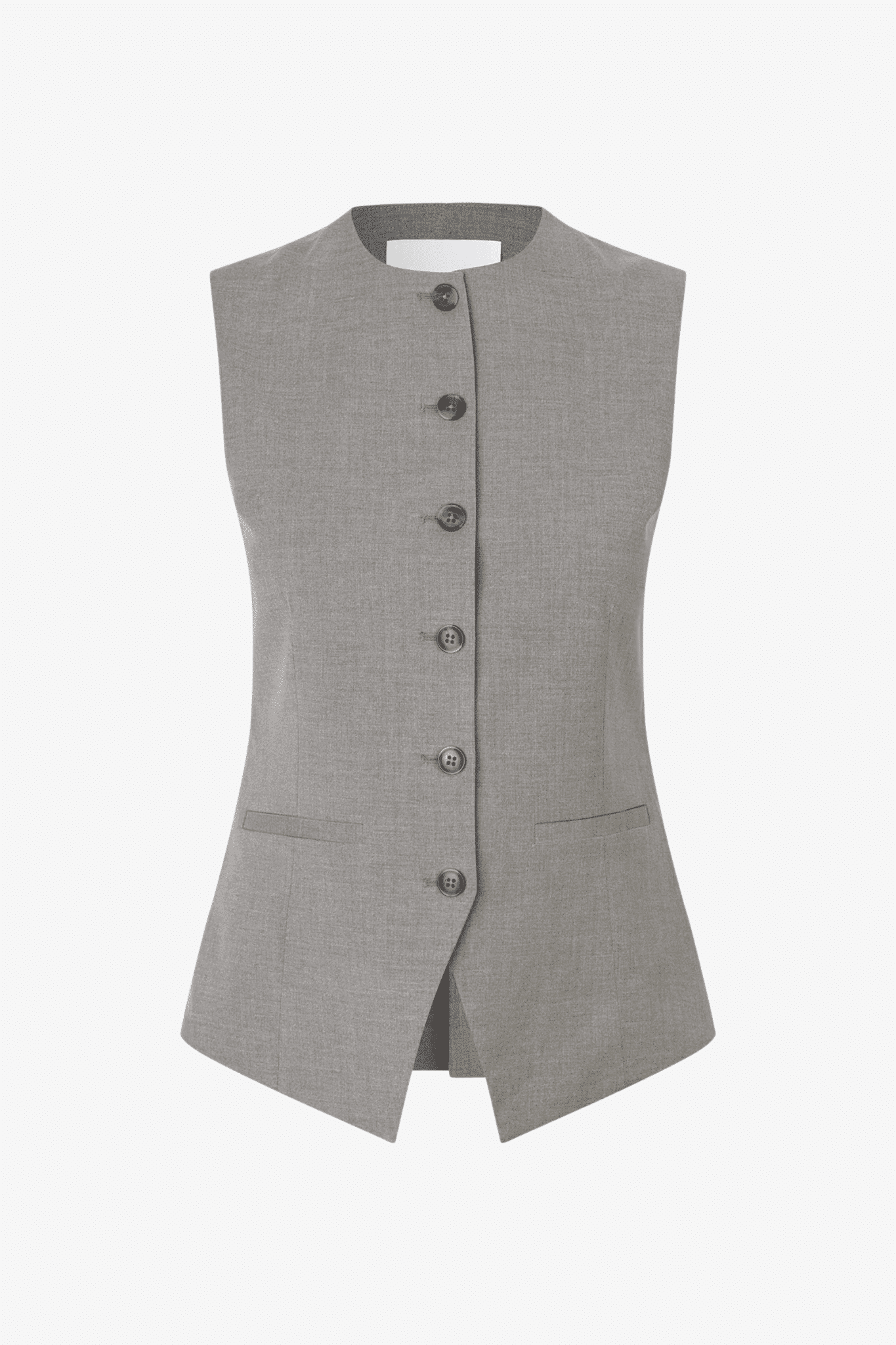 Ontdek het stijlvolle en duurzame grijze vest voor dames van Samsoe Samsoe, ontworpen met een normale pasvorm voor een comfortabele en klassieke look. Dit mode-item beschikt over een elegante knoopsluiting aan de voorkant, wat het vest makkelijk aanpasbaar maakt naar jouw gewenste stijl. De ronde halslijn en de subtiele imitatie paspelzakken voegen verfijnde details toe, terwijl de ventilatieopening aan de achterkant zorgt voor extra draagcomfort. Dit vest is vervaardigd uit een elastische mix van gerecycled polyester, wat bijdraagt aan een duurzame garderobe.