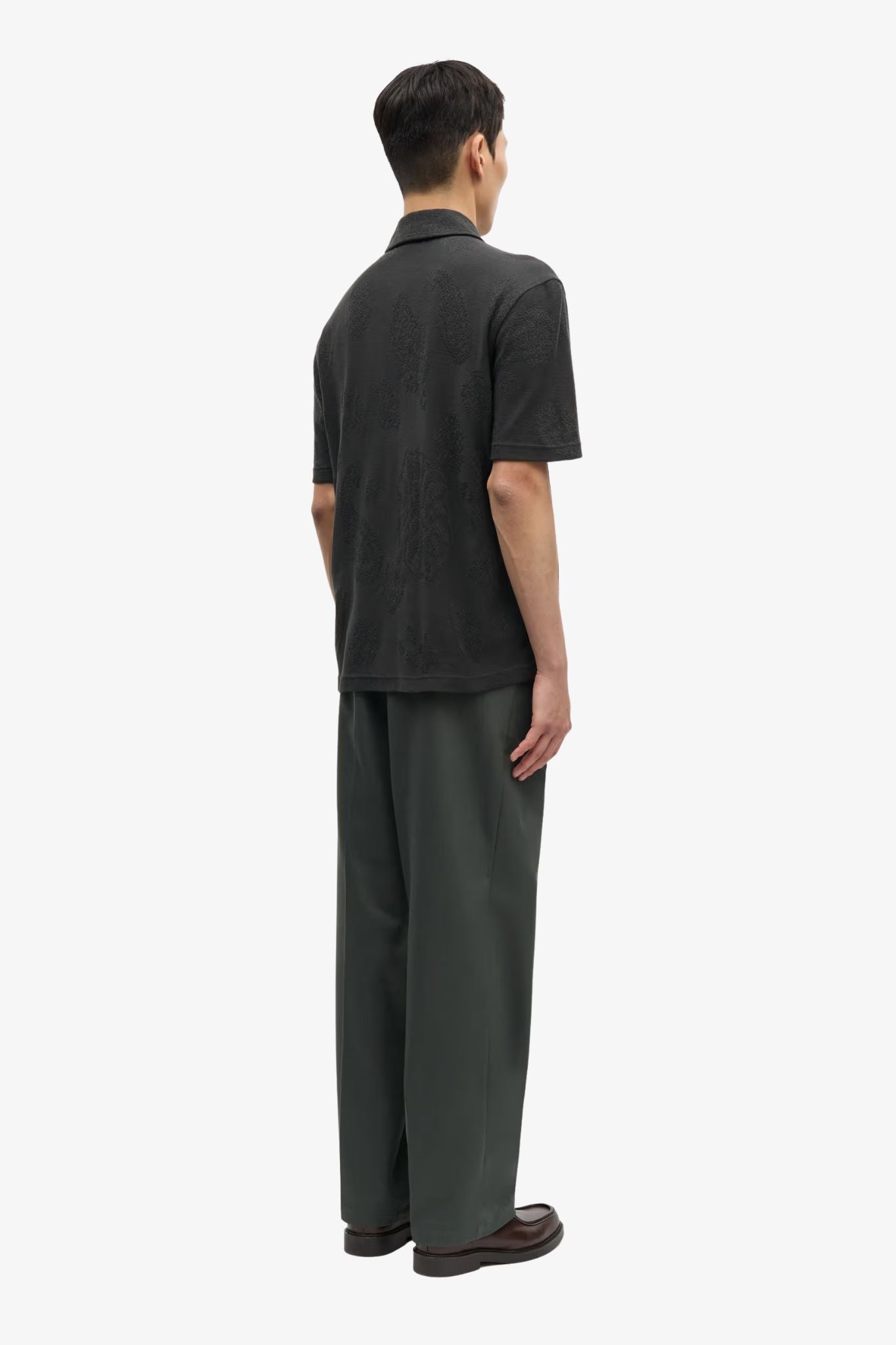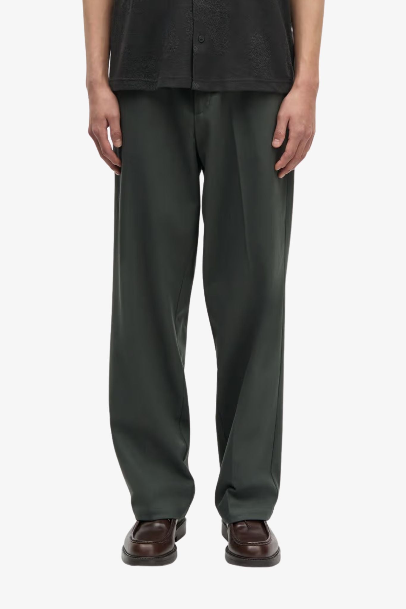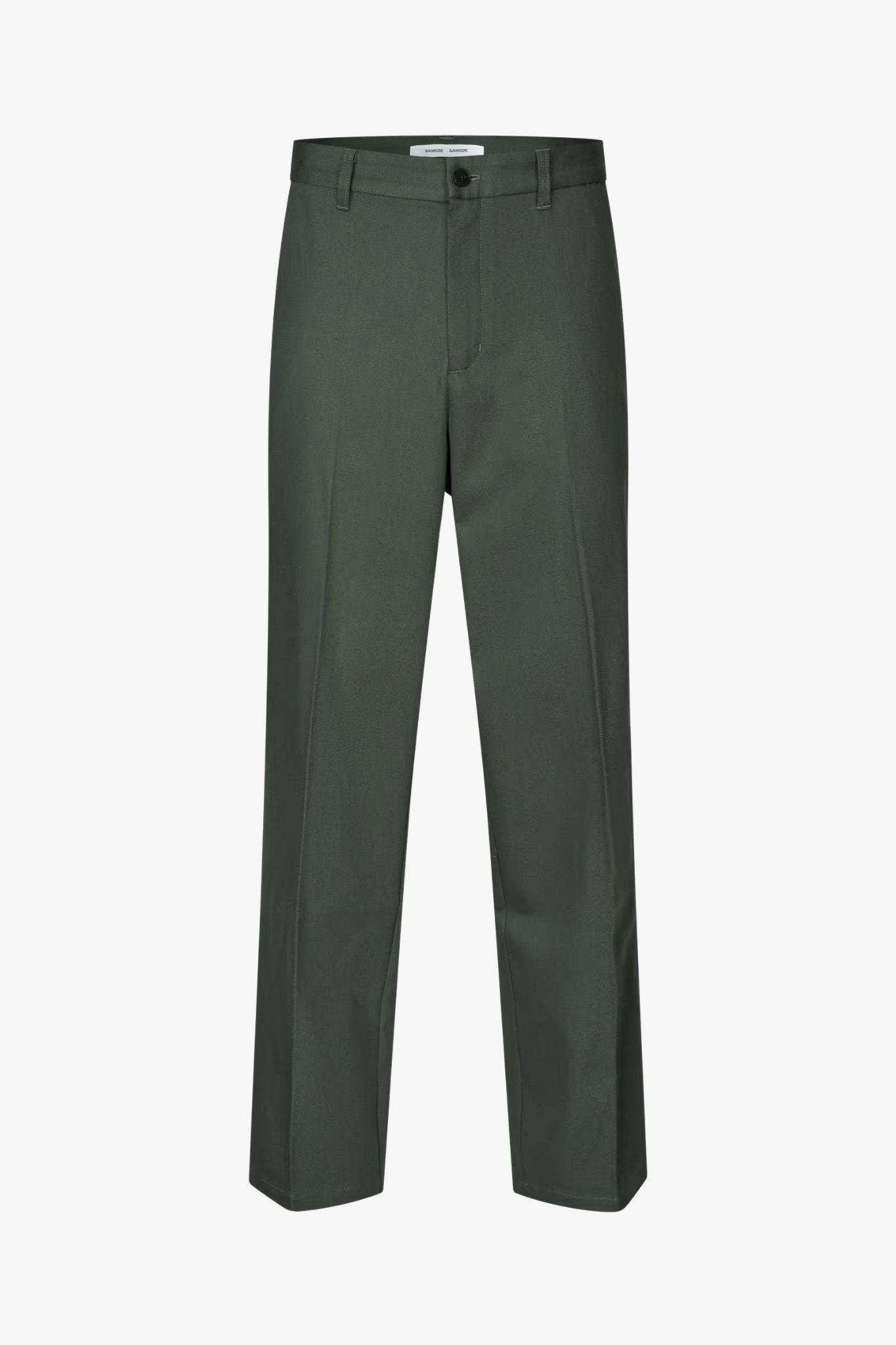 Broek met middelhoge taille, normale pasvorm en rechte pijpen. Elastische tailleband met knoop- en ritssluiting, trekkoord aan de binnenkant. Steekzakken aan de voorkant en paspelzakken aan de achterkant. Enkele plooien aan de voorkant. Riemlussen. Hoofdmateriaal: een wolmix.