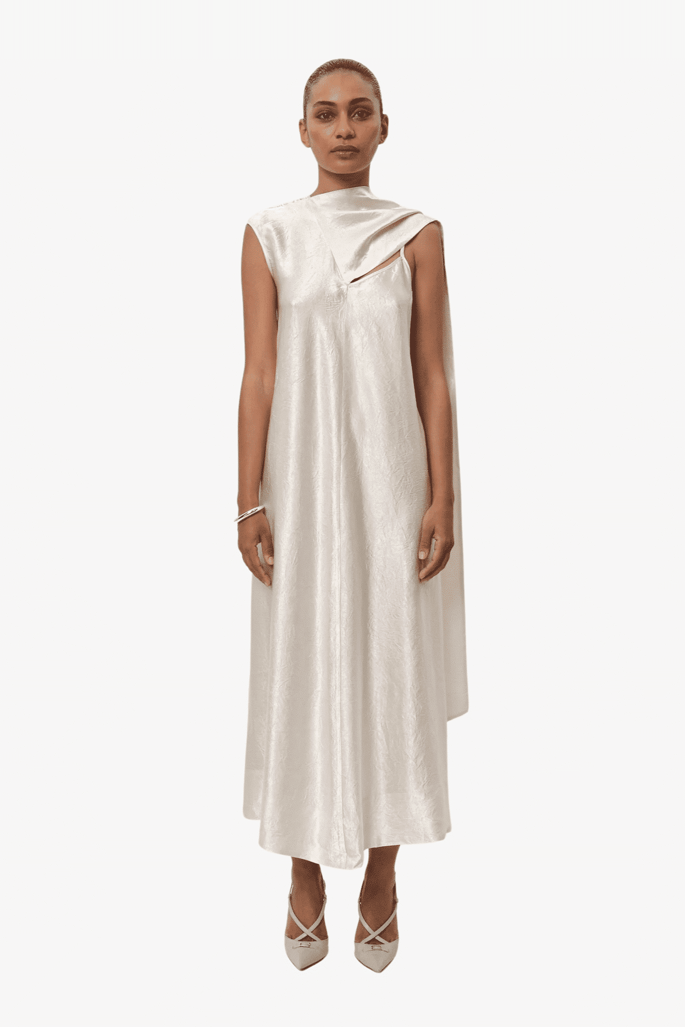 Asymmetrische jurk voor dames - Ontdek de unieke charme van deze enkellange jurk met een lage rug. Gemaakt van 100% Naia Acetate, biedt deze jurk niet alleen een prachtige glans maar ook een zijdezachte ervaring die comfortabel aanvoelt op de huid. Het opvallende asymmetrische design wordt perfect aangevuld door het extra stoffen detail. Drapeer dit elegant over je schouder of wikkel het om je nek voor een veelzijdige en persoonlijke look.