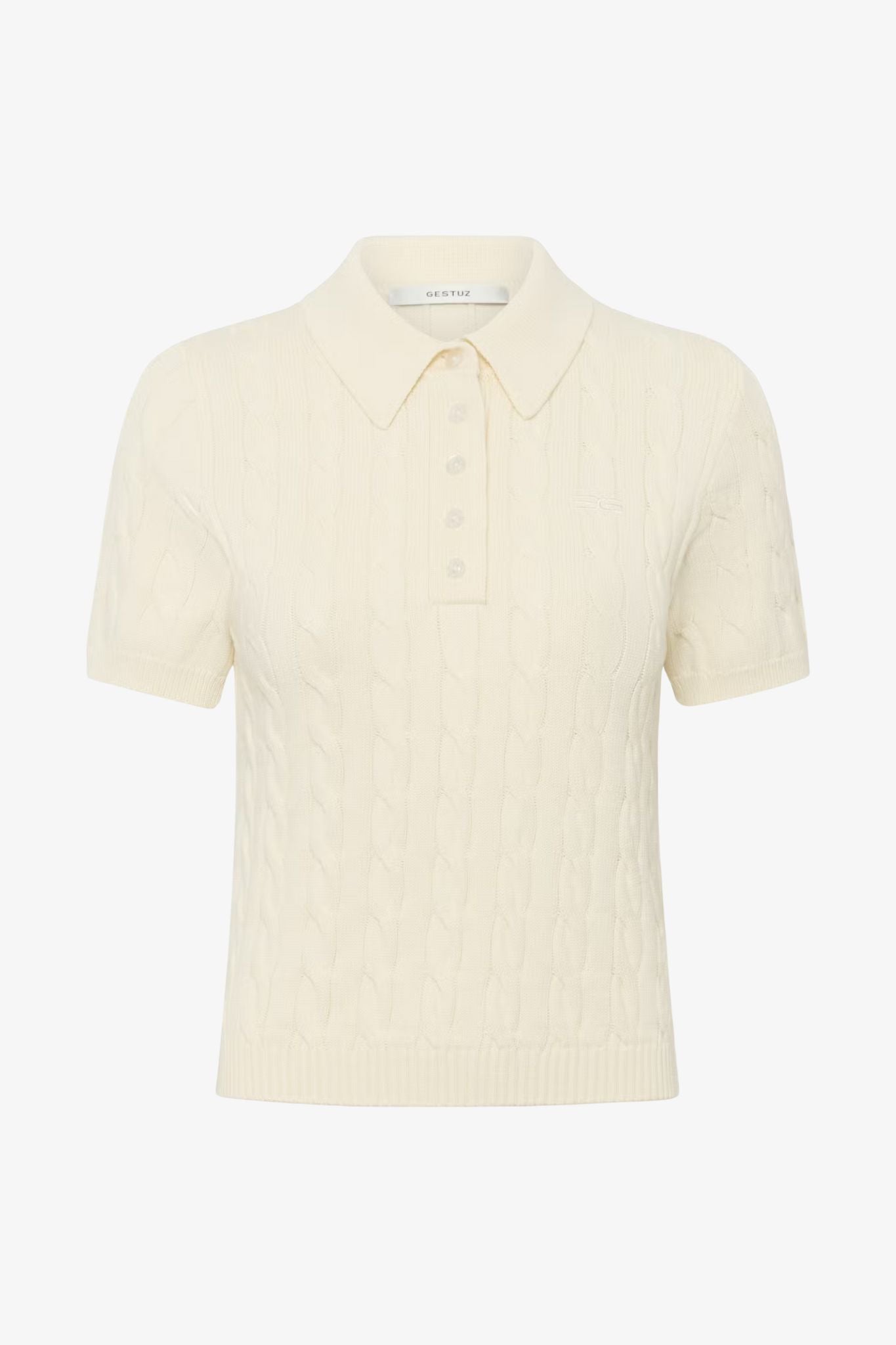 Perfect for those searching for women’s polo knit, short-sleeve sweater, cable knit polo, versatile layering piece, Gestuz fashion, and everyday knitwear essential.