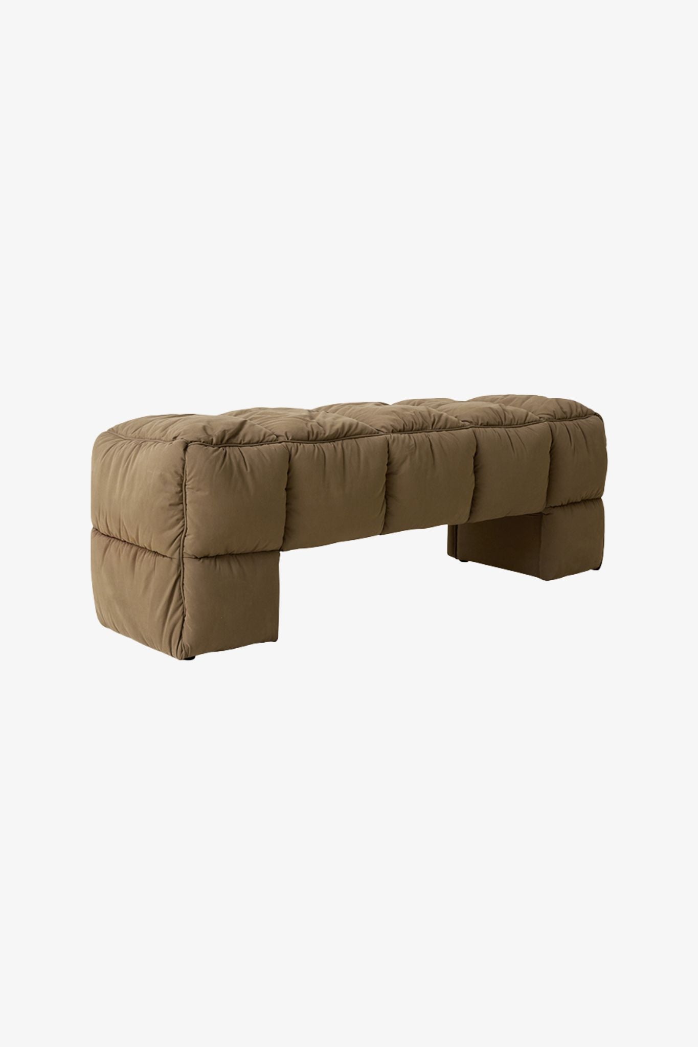 The voluminous shape of this bench creates a warm, inviting feel, while the rich olive tone introduces a natural yet contemporary accent. Whether placed at the end of a bed, along an empty wall, or used as a modern dining bench, it stands out while blending effortlessly into design-led spaces. Crafted from a thoughtful mix of cotton, foam, PP cotton, MDF, and fir wood, it provides a supportive yet soft seating experience with a durable internal structure, perfect for daily use without compromising on style. The bench features a playful, puffy silhouette with stitched detailing, a trend-forward olive colour, and measures 140 x 40 x 45 cm with a seating height of 45 cm, depth of 40 cm, and width of 140 cm, weighing 15 kg.