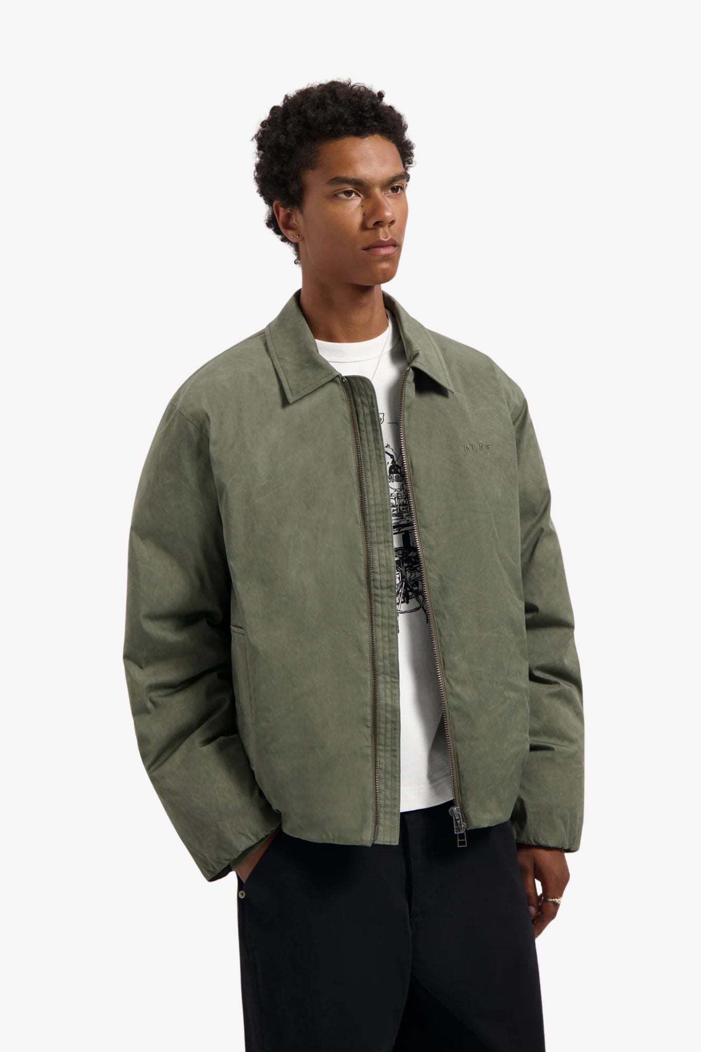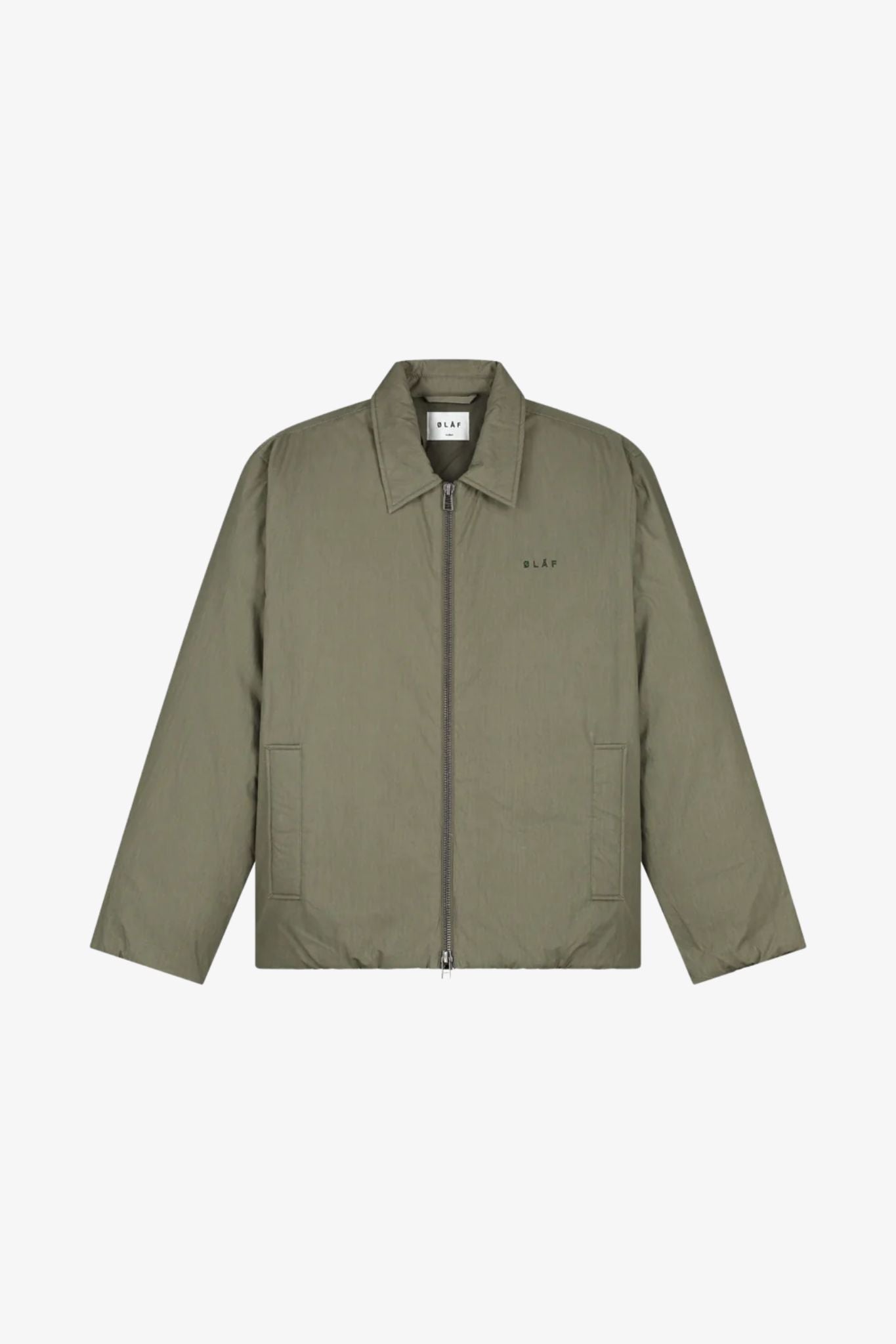 The Medium Padded Jacket in Olive Night is an upgraded seasonal outerwear piece with a double-way zipper and an almost crinkled 100% cotton fabric. Finished with ØLÅF logo embroidery at the chest, it delivers warmth, comfort, and utility in equal measure.