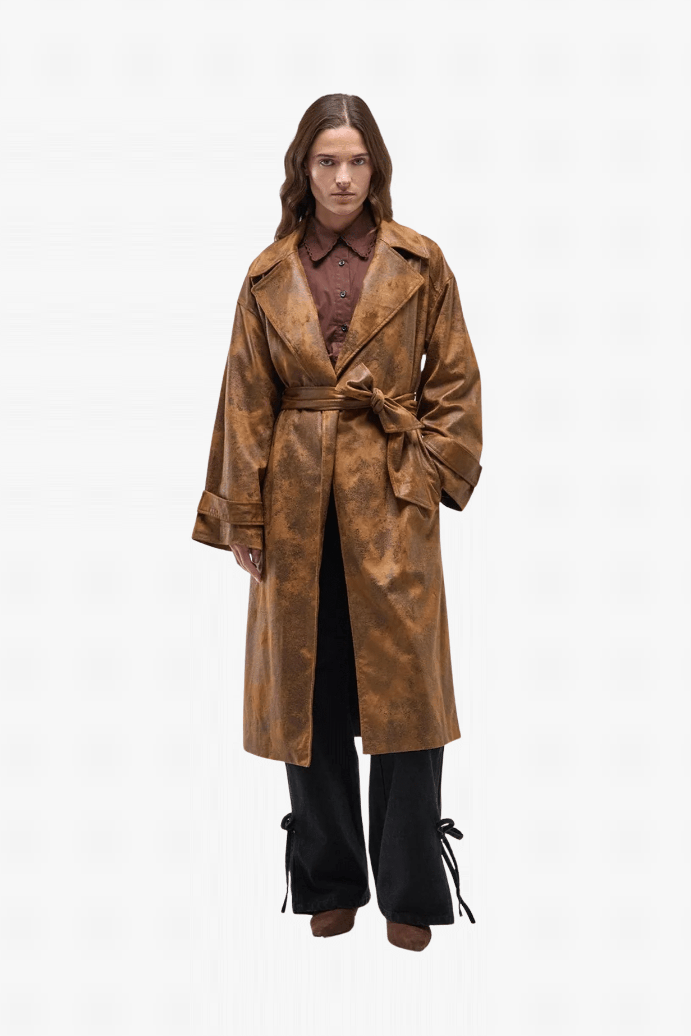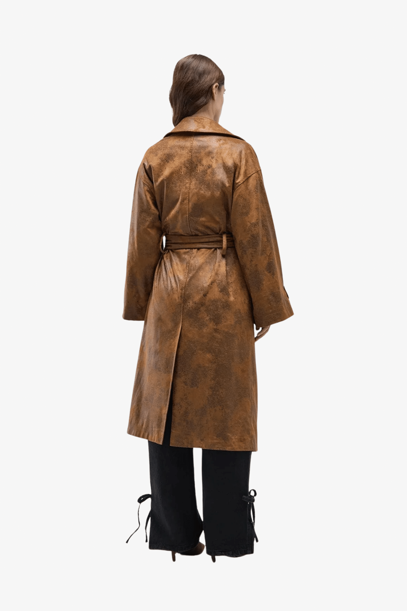 De jas heeft een klassieke reverskraag en lange mouwen, en beschikt over twee onzichtbare zijzakken voor discretie en functionaliteit. De verstelbare riem van hetzelfde suède materiaal en het split aan de achterkant bieden flexibiliteit in pasvorm en bewegingsvrijheid.