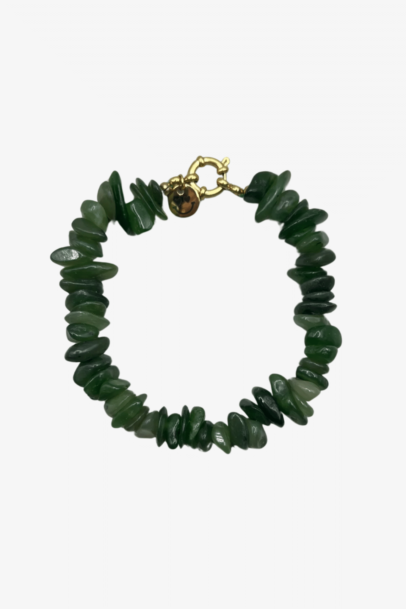 Ontdek de unieke charme van de Yuyu armband van Bonnie Studios. Deze opvallende armband combineert natuurlijke schoonheid met elegantie door het gebruik van groene agaatkralen. Met hun organische textuur en onregelmatige vormen vormen de kralen een echt kunstwerk, met een expressieve en onderscheidende uitstraling. De armband is afgewerkt met een 14-karaats vergulde roestvrijstalen sluiting, wat een vleugje verfijning toevoegt aan dit tijdloze sierstuk.