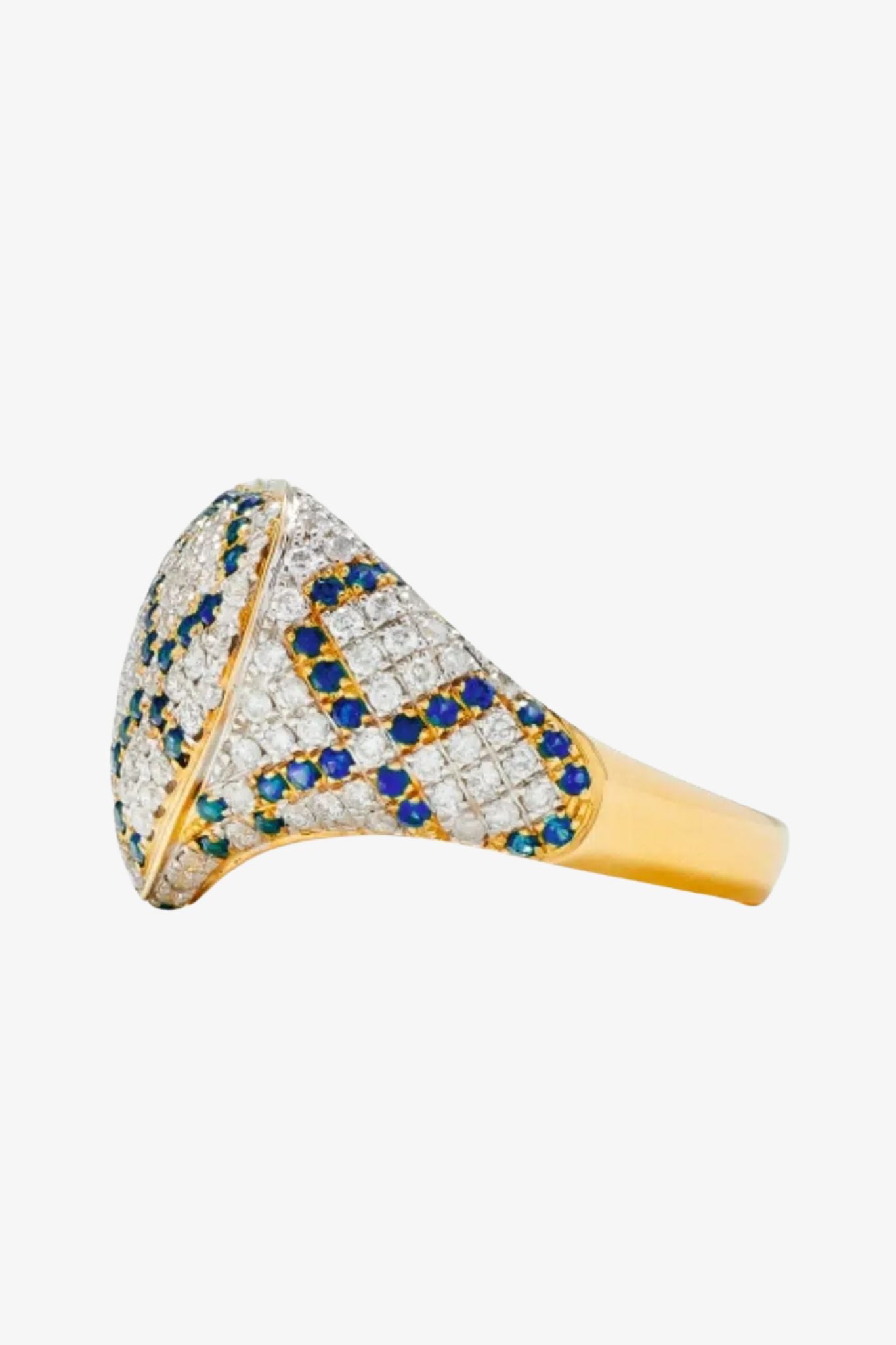 Voeg een vleugje luxe toe aan je sieradencollectie met de blauwe saffier diamanten hart zegelring van Yvonne Léon. Deze verfijnde ring combineert een stevige 9-karaats geelgouden basis van 4,1 gram met prachtige blauwe saffieren van 0,51 karaat en betoverende grijze diamanten van 0,65 karaat. Met zijn iconische hartvorm biedt deze ring een elegante en tijdloze uitstraling voor elke stijlvolle outfit.