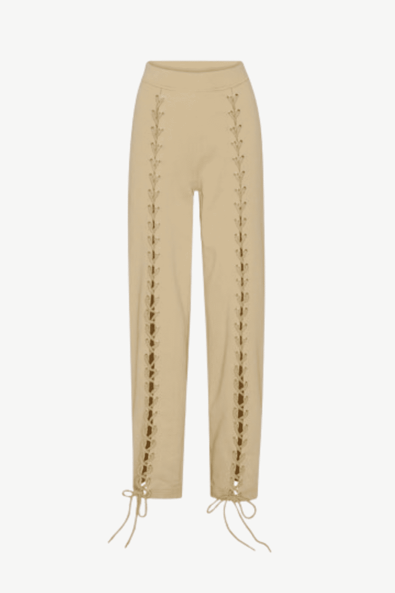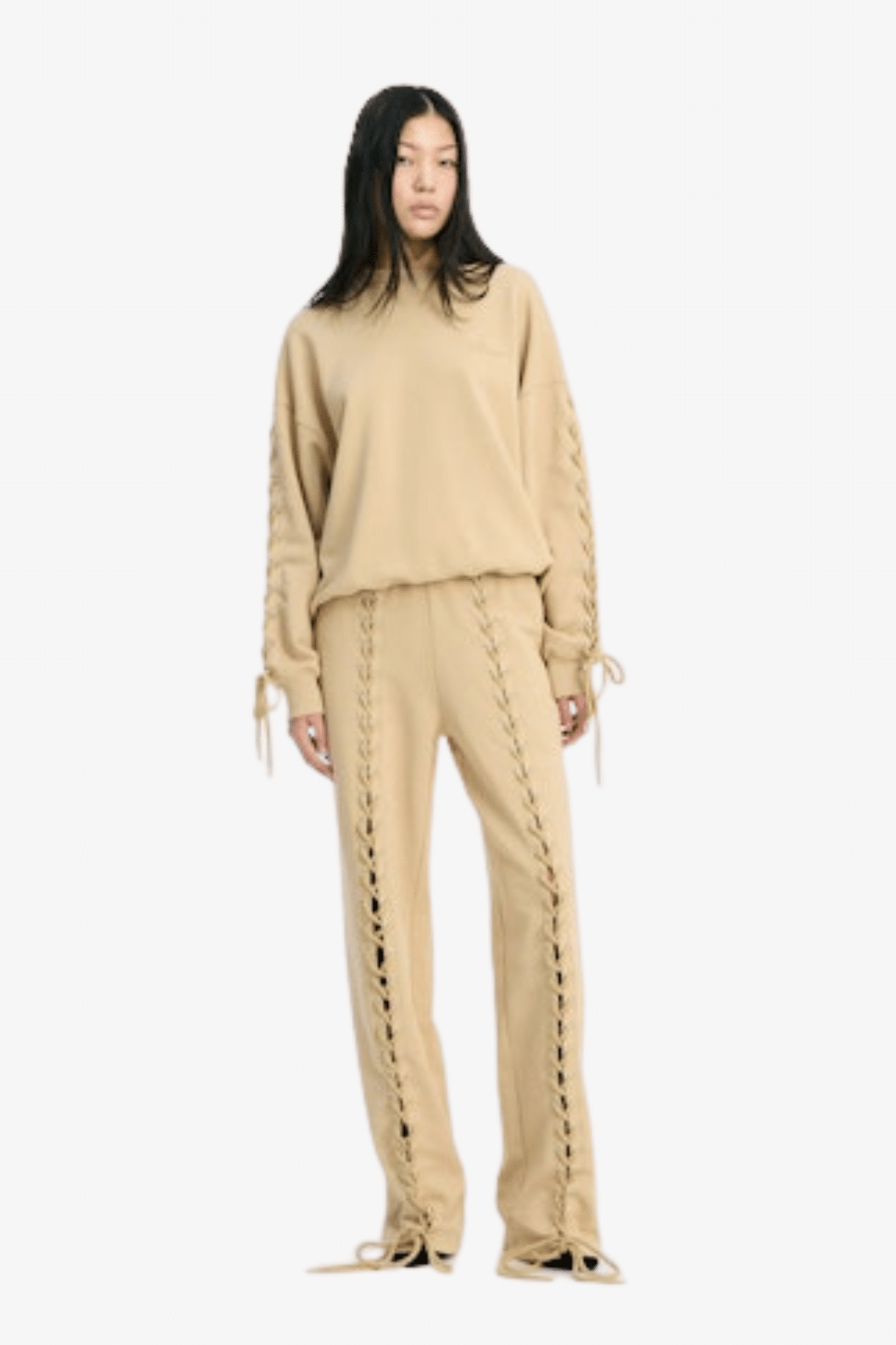 De Rotate Lacing Sweatpants is een unieke bruine damesbroek die zich onderscheidt door zijn hoge taille en veterdetails aan de voorkant van beide pijpen. Deze elementen geven de broek een gedurfd en gestructureerd uiterlijk, terwijl de zachte jersey ervoor zorgt dat het comfort behouden blijft.