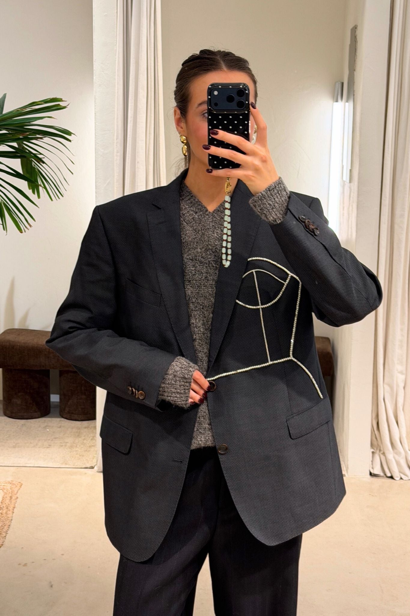 A striking vintage blazer that commands attention with its beaded corset detailing and generous silhouette. Thoughtfully upcycled, this one-of-a-kind piece breathes new life into timeless tailoring while delivering an effortlessly dramatic shape. Broad shoulders and refined construction make it the ultimate statement layer—equally at home in boardroom settings or elevated casual wear.