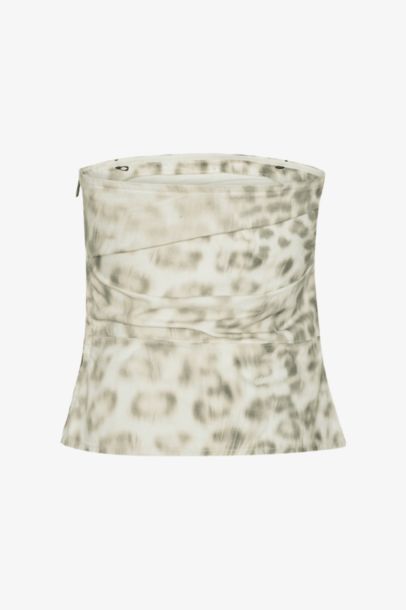 Ontdek de bedrukte denim top met luipaardprint, een stijlvol statementstuk van Rotate dat direct de aandacht trekt. Deze trendy top is ontworpen met een moderne strapless design en heeft een gripvoering langs de bovenrand voor een veilige en comfortabele pasvorm. De ritssluiting aan de zijkant en de lichte drapering voegen extra verfijning toe aan dit modieuze item.