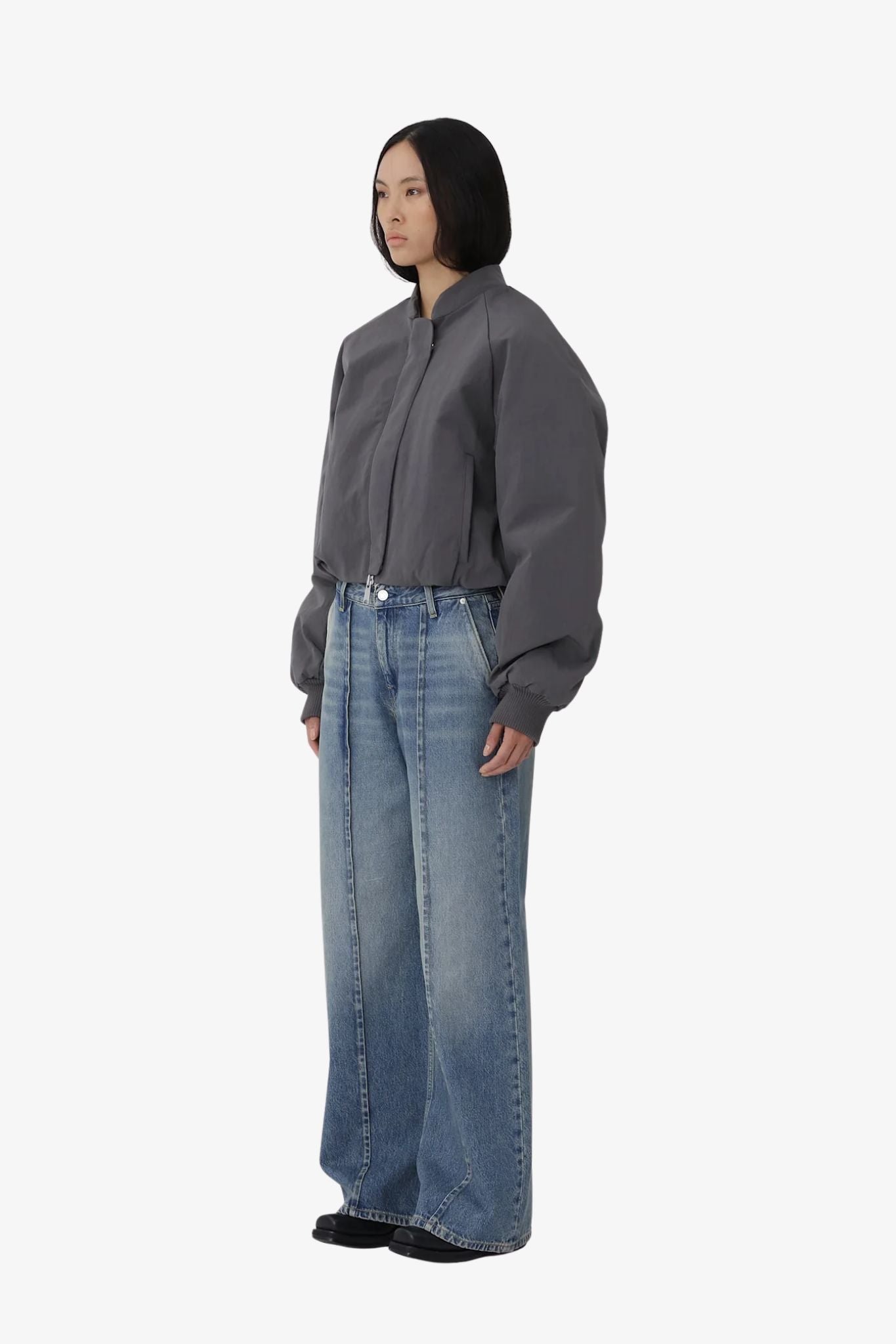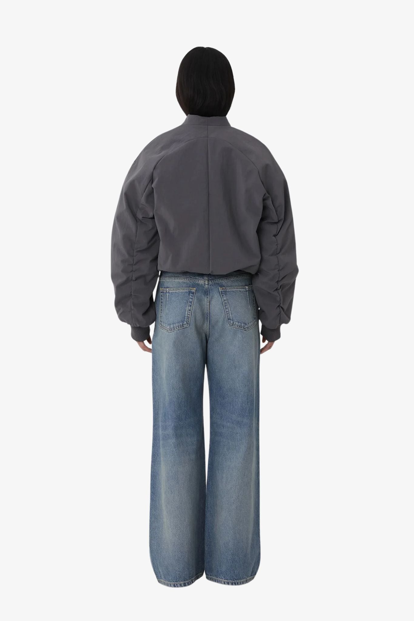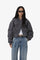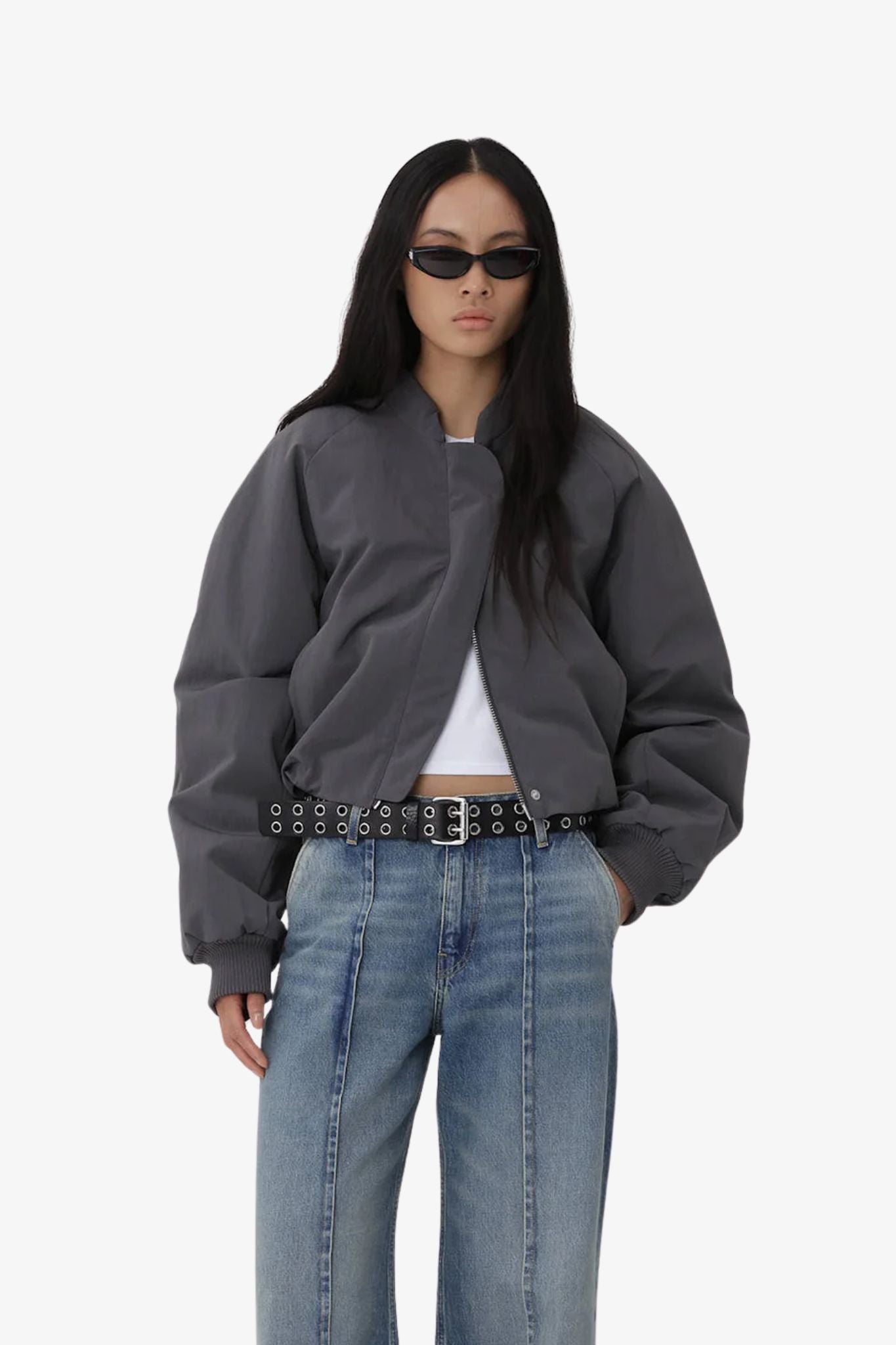 The Ola Bomber Jacket is a cropped style made from crisp recycled nylon. It features a two-way metal zipper, front pockets, padded construction, and heavy ribbed cuffs for structure and volume.