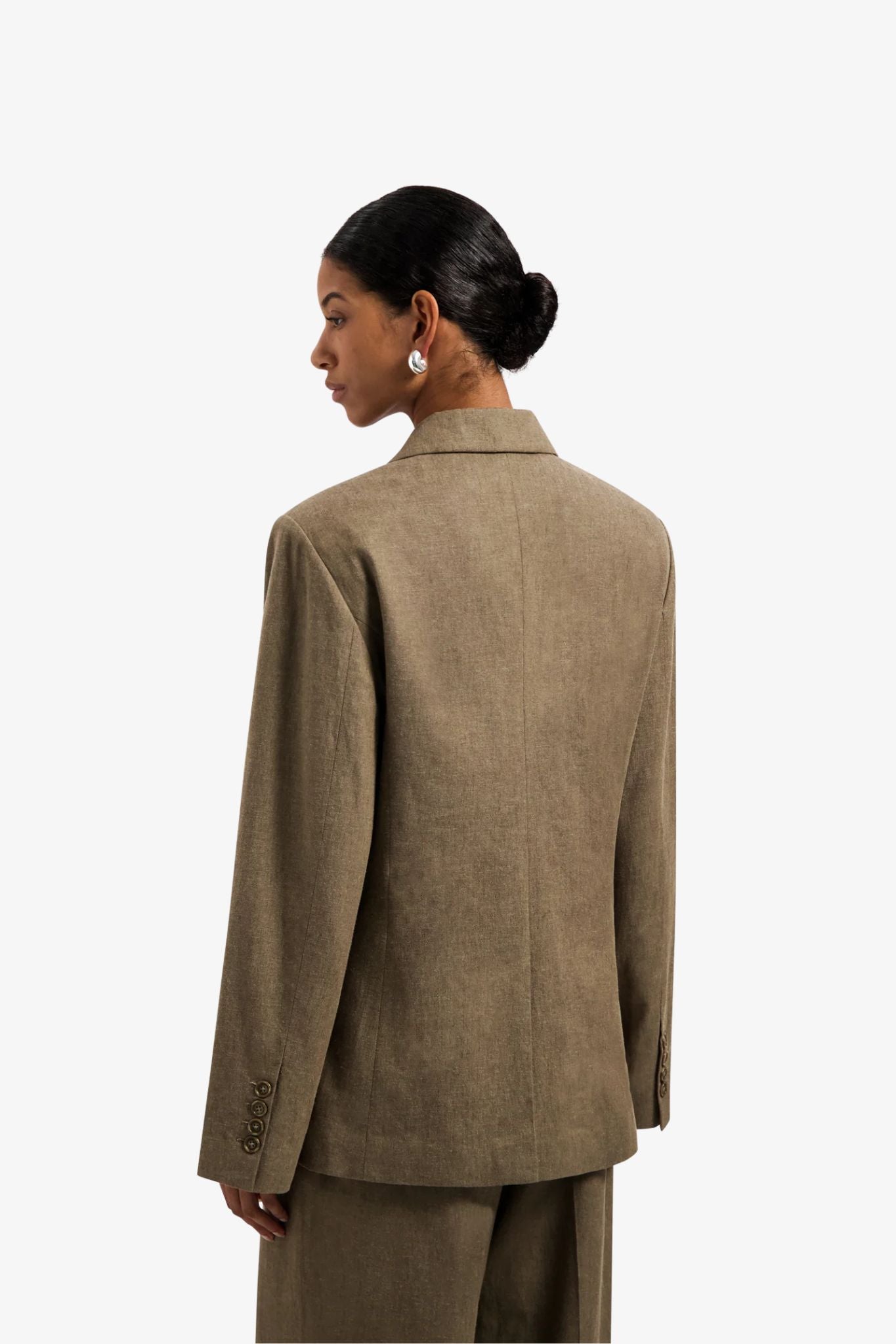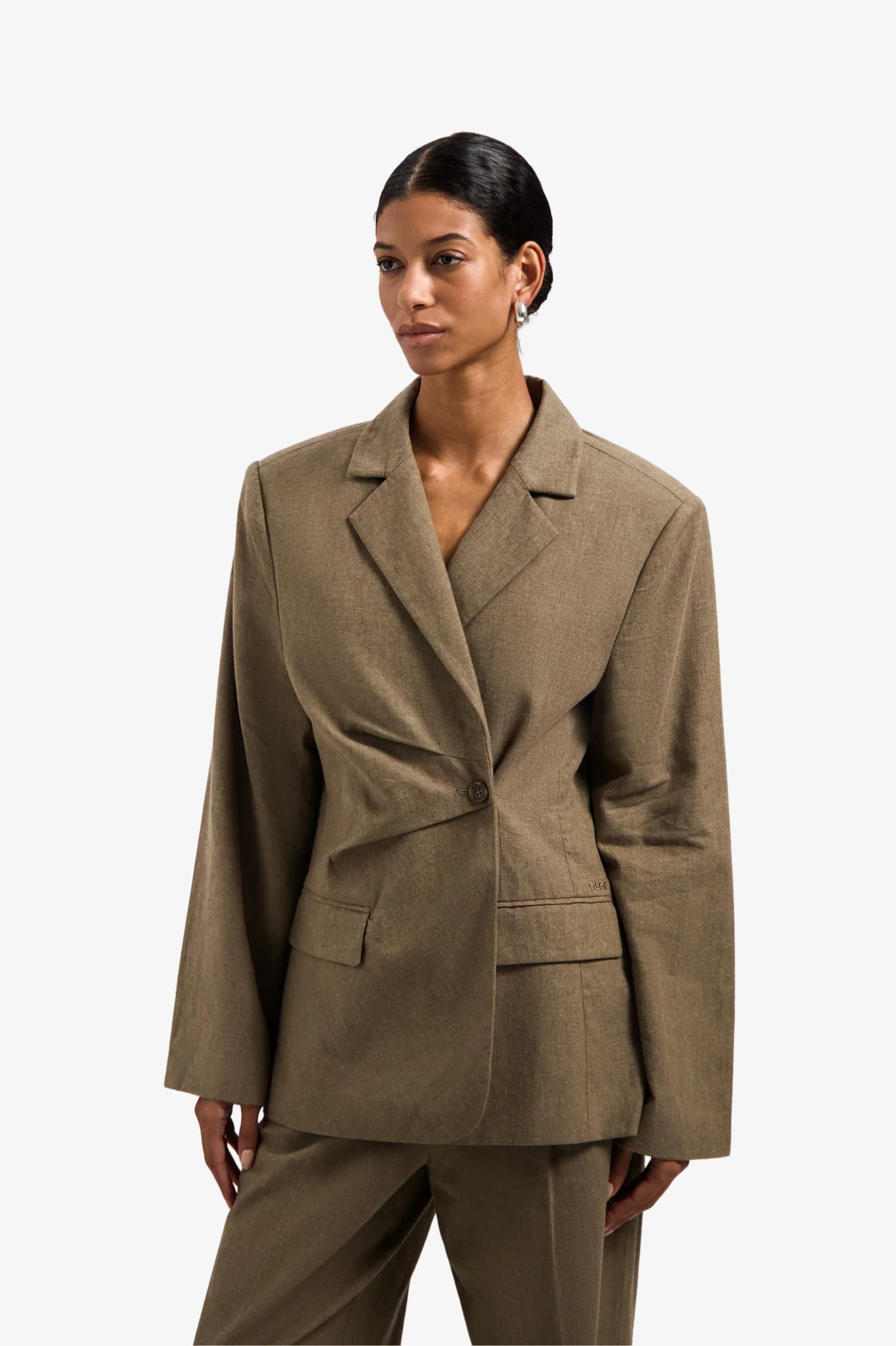 An asymmetrical blazer that you can wear in 2 ways, the blazer has 2 buttons you can close in a normal way but if you want to create more waist there is a 2nd button on the side of the blazer.