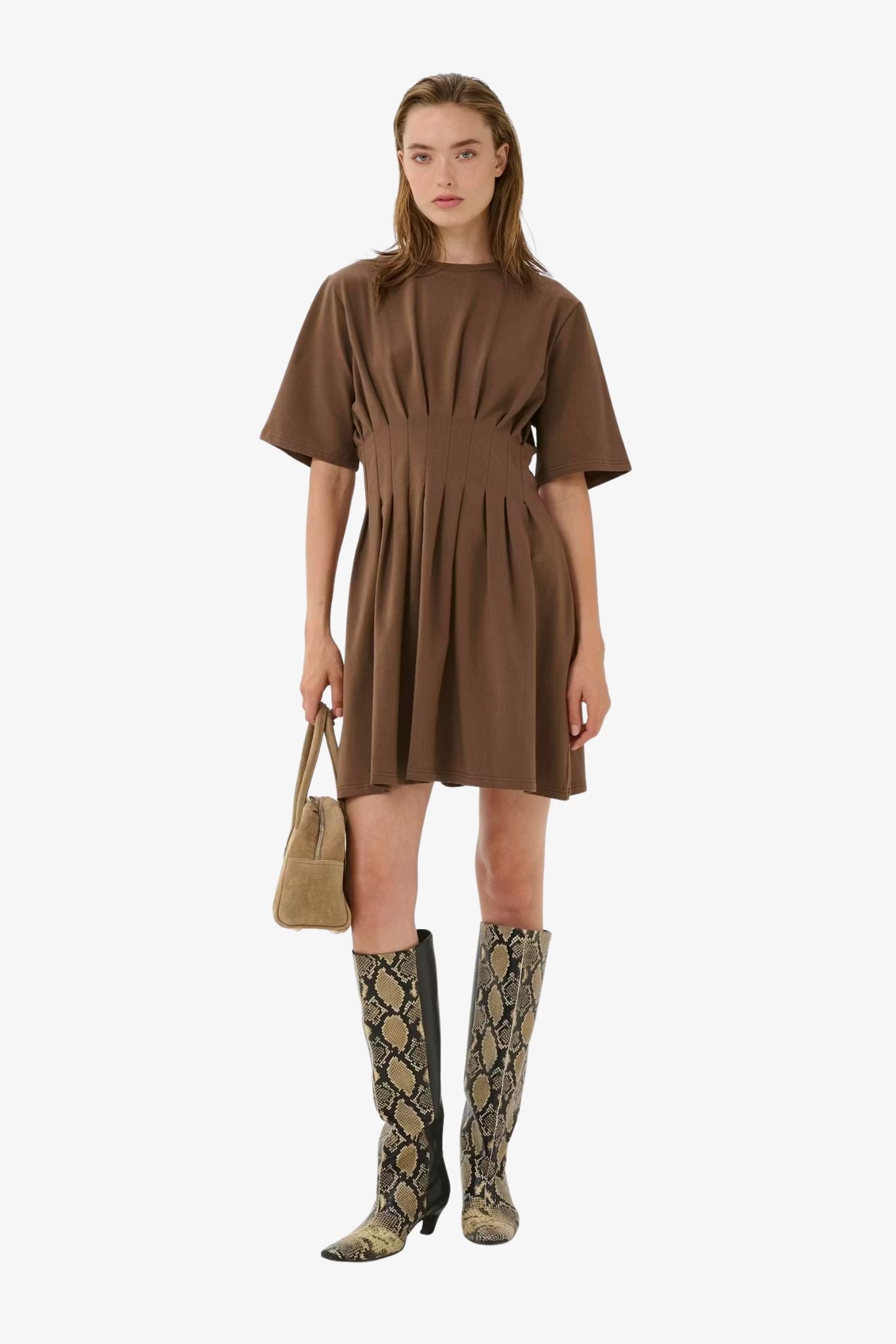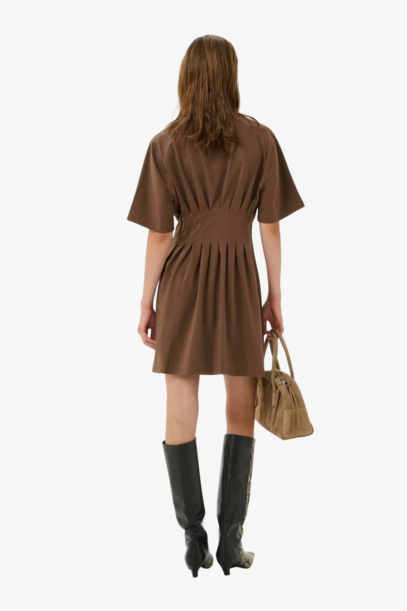 This short dress is designed with a relaxed fit, a round neckline and short sleeves, creating an easy and effortless silhouette.