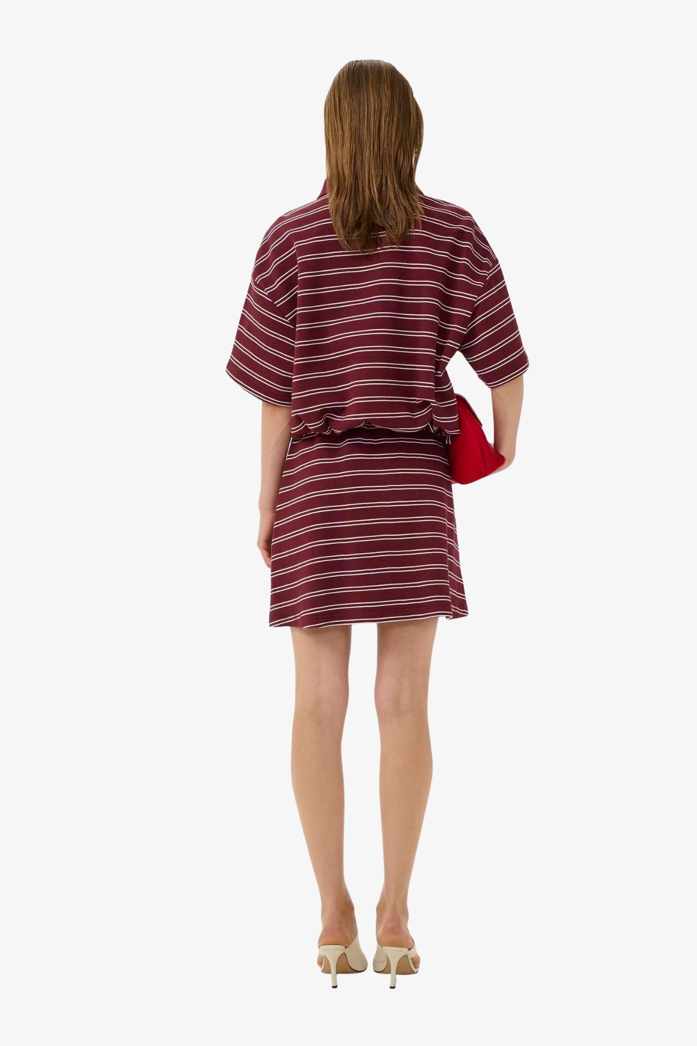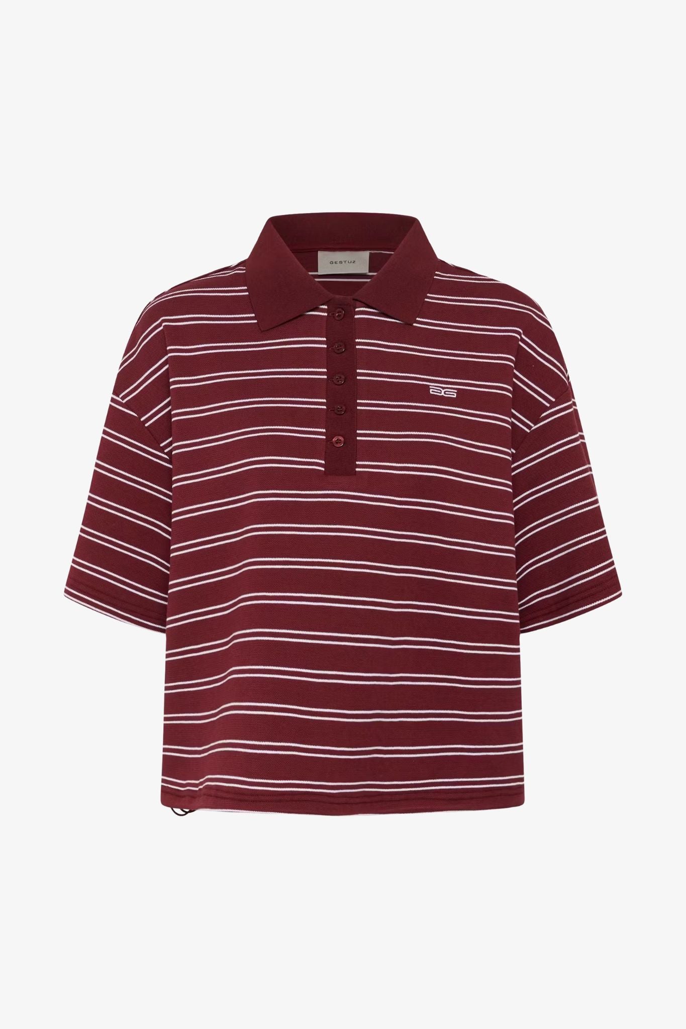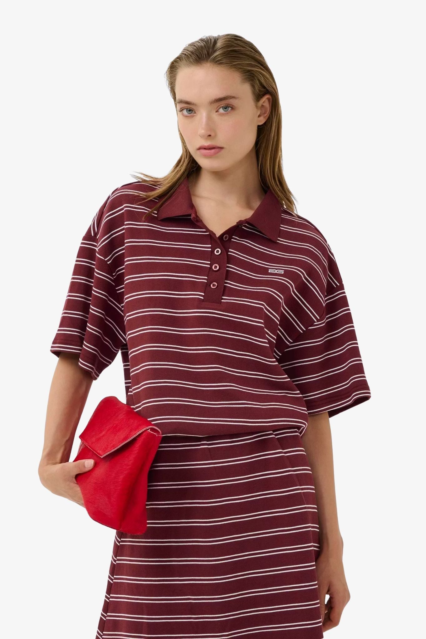 This striped polo shirt is designed with a boxy fit, combining a structured collar and button placket with a relaxed, modern silhouette.