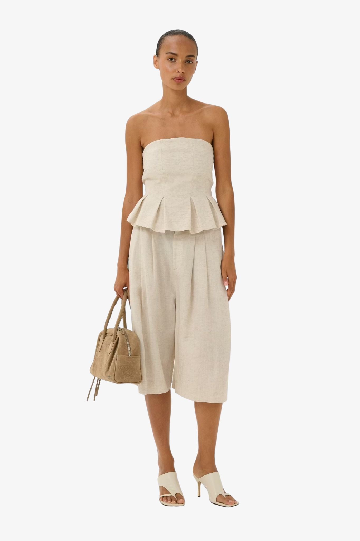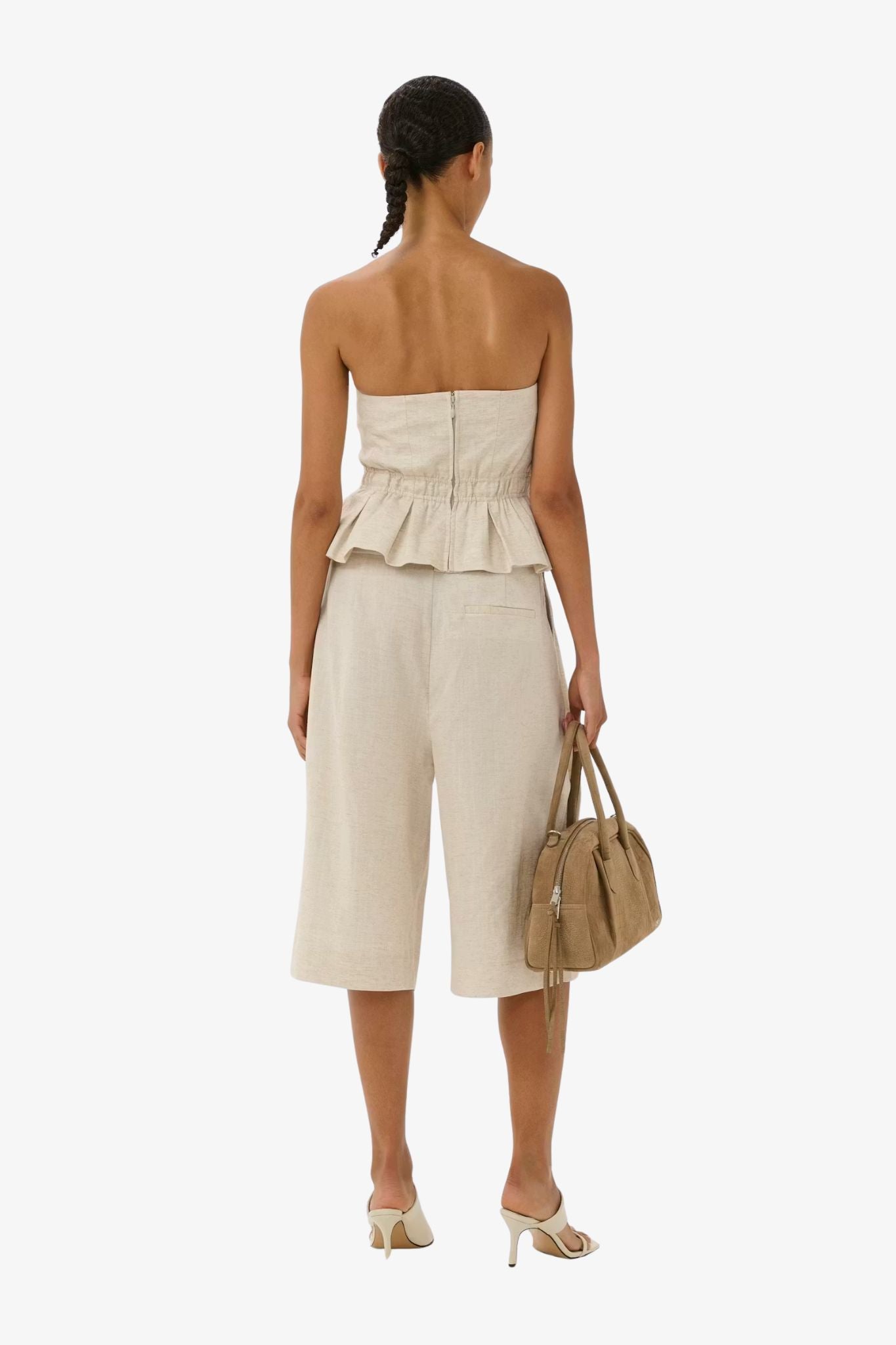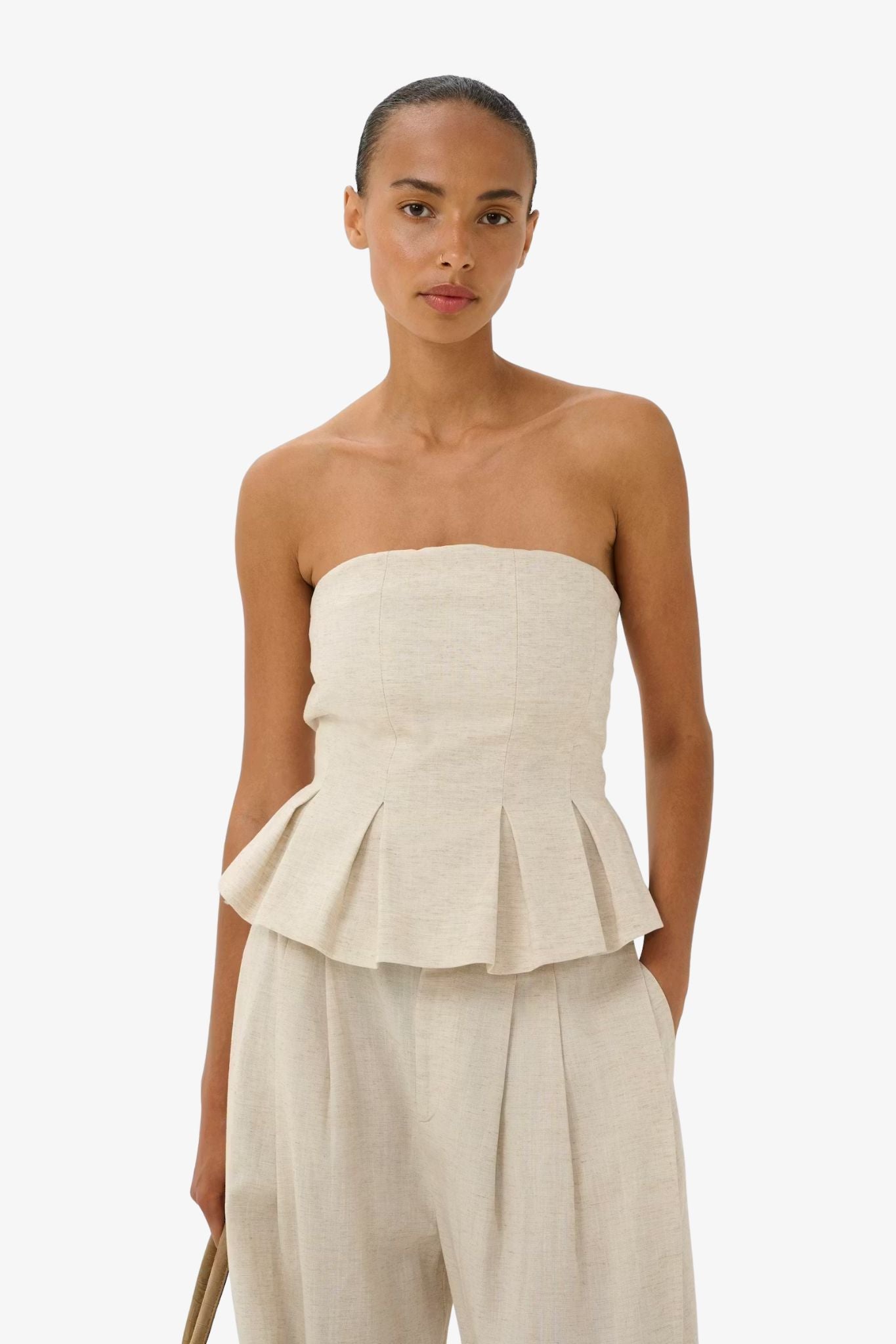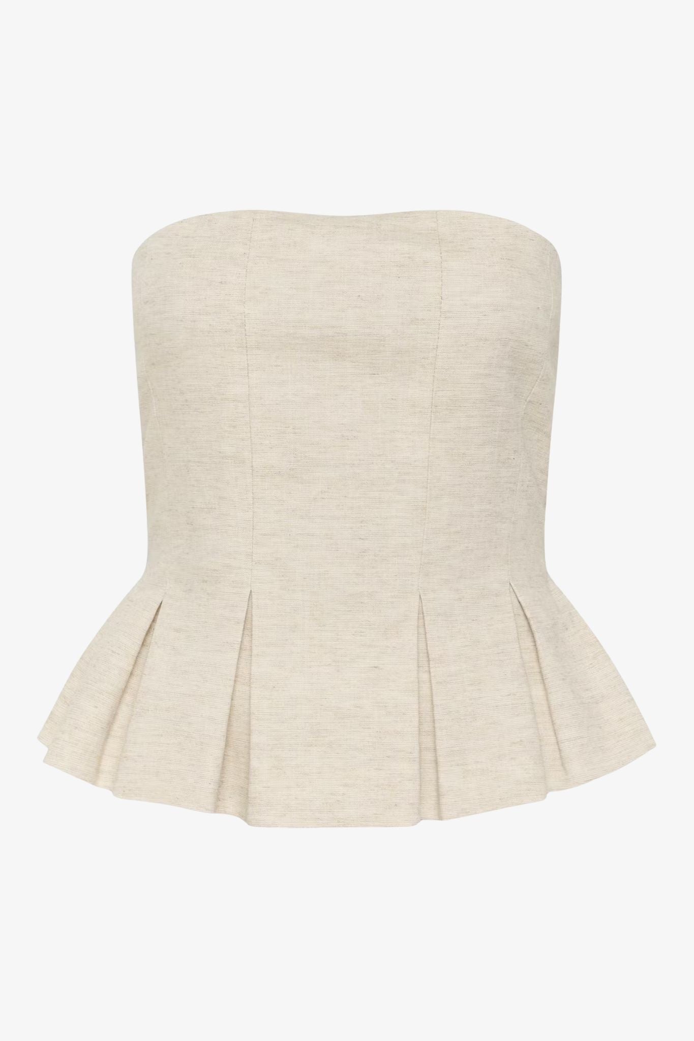This strapless peplum top features a fitted bodice with a soft-textured finish, creating a refined and feminine silhouette.