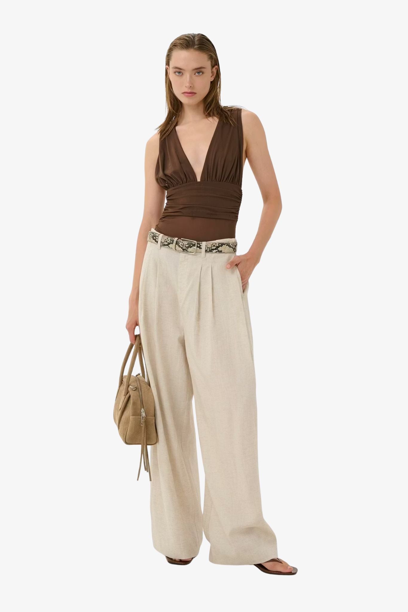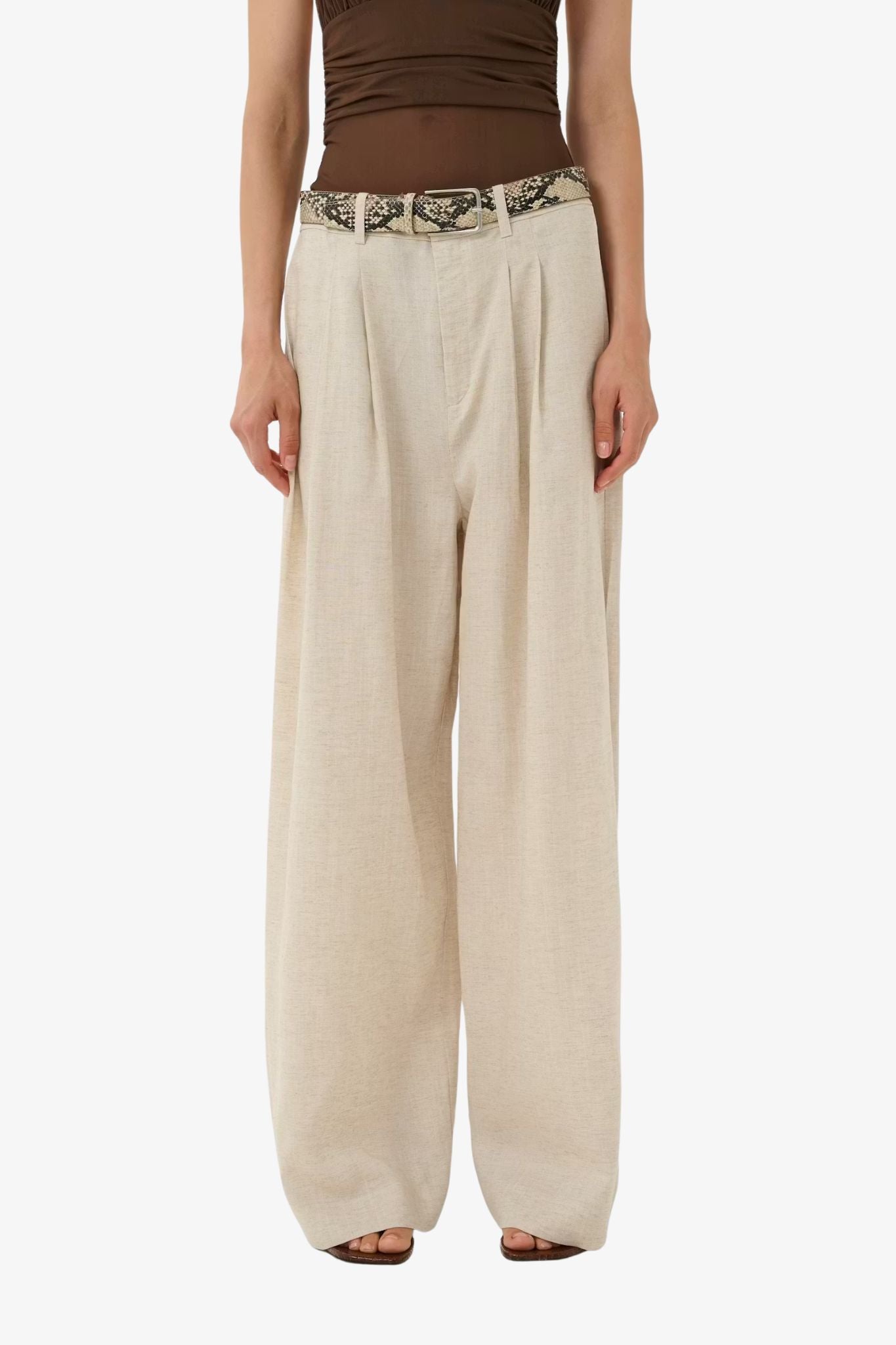 These wide-leg trousers feature a high-rise waist and front pleats, creating a relaxed yet refined silhouette.