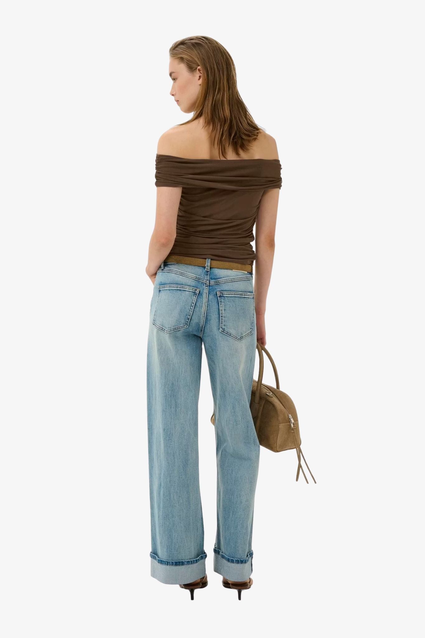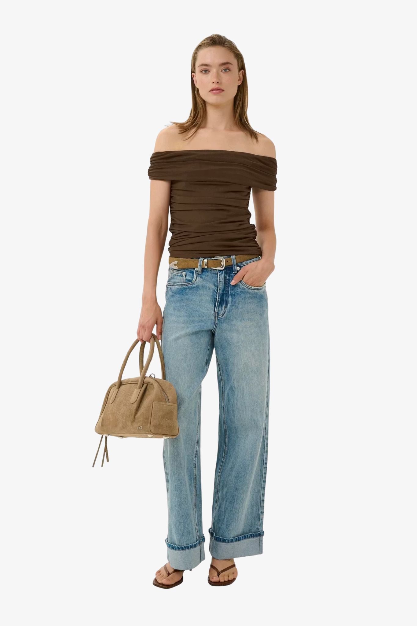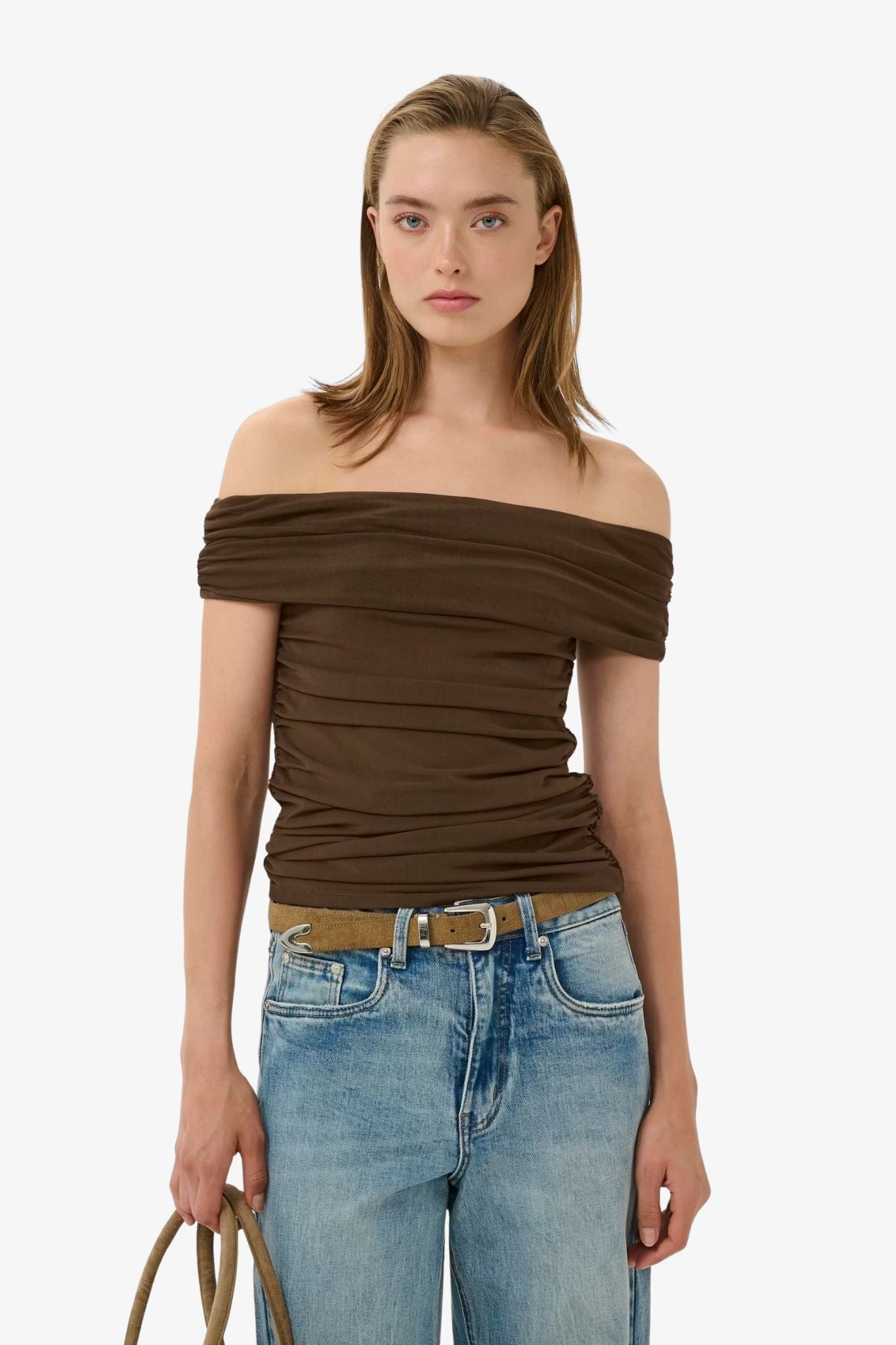 This off-shoulder top features delicate pleated detailing and a close, fitted silhouette, creating a refined and feminine look.