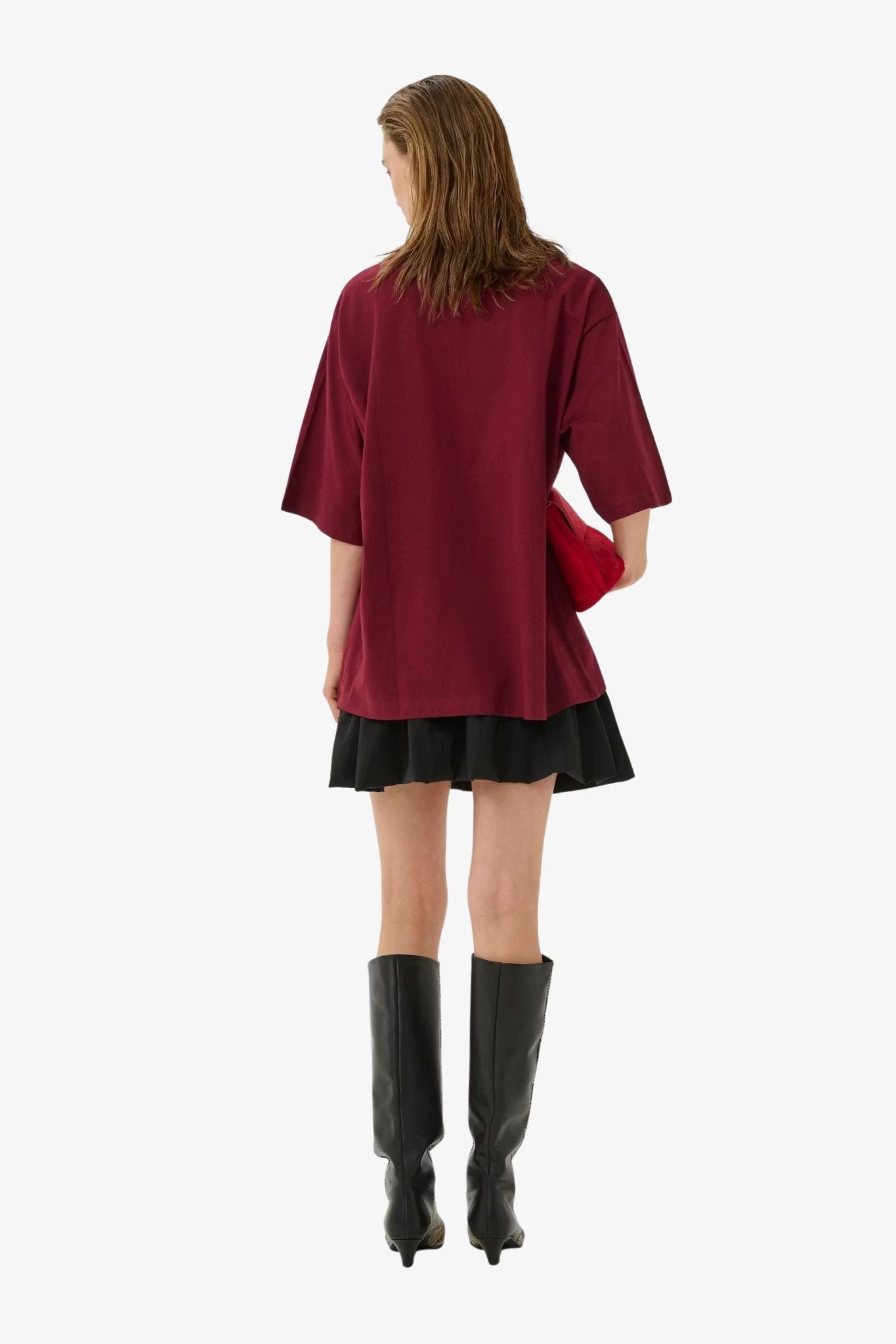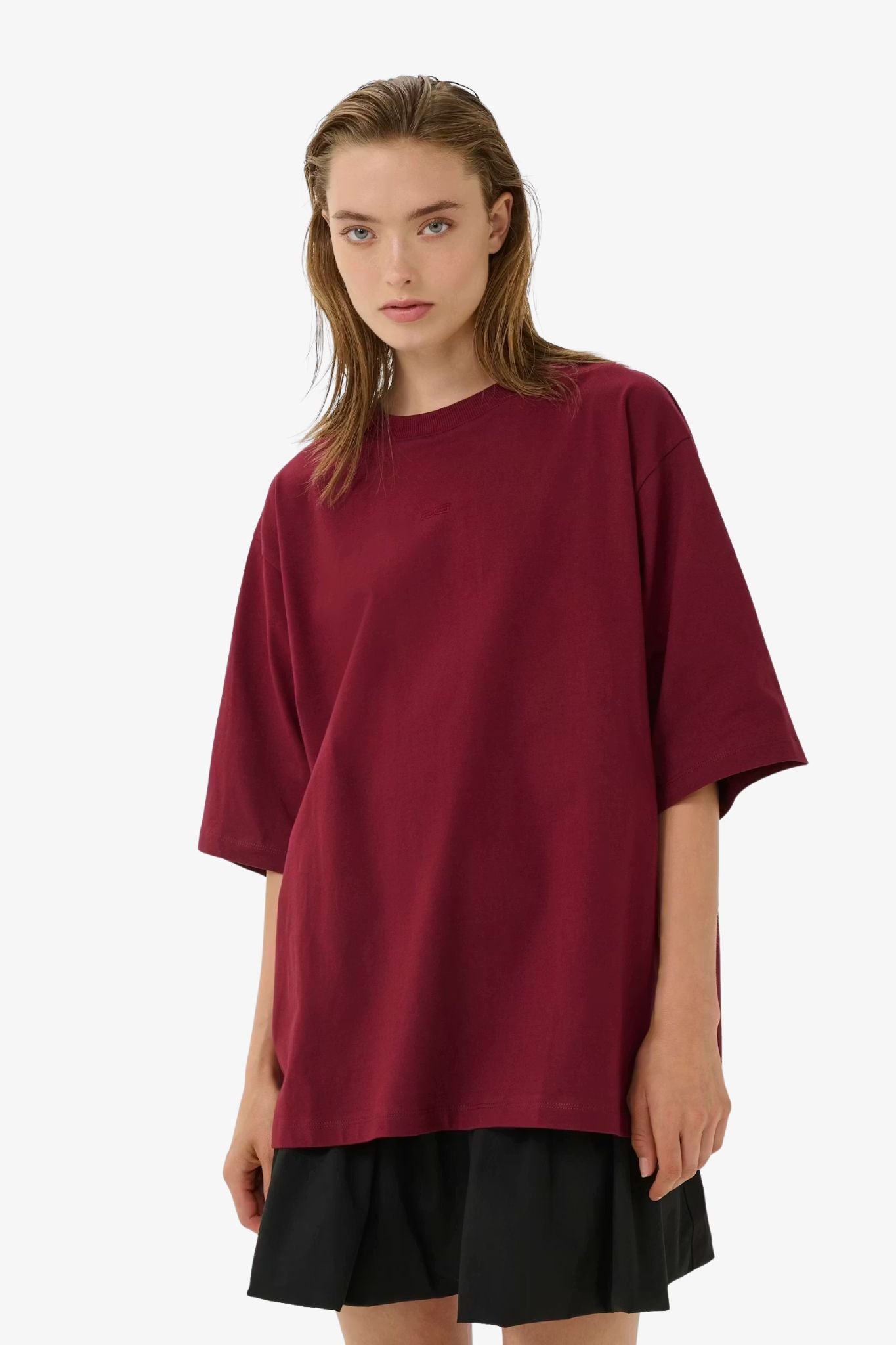This oversized T-shirt features a straight fit with dropped shoulders and a classic crew neckline, creating a relaxed yet modern silhouette.