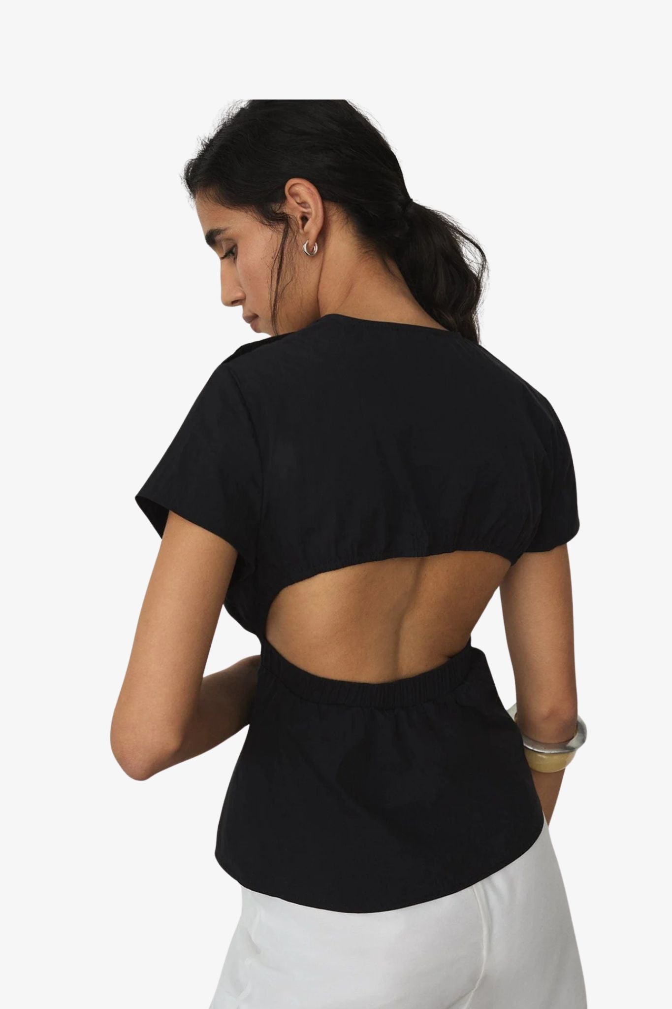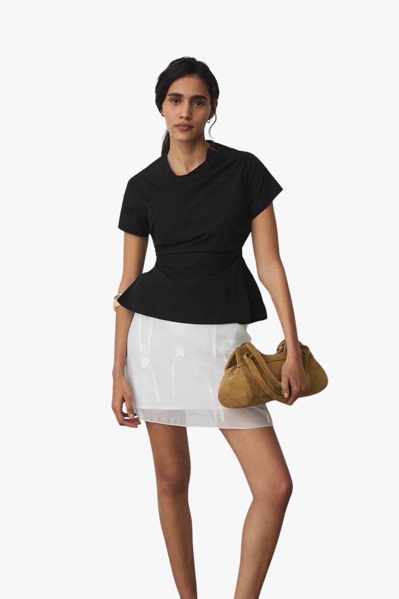 The Laagam Short-Sleeve Draped Wrap Blouse is a modern essential designed to sculpt and flatter. Crafted from a structured yet breathable cotton-nylon blend (75% cotton, 25% nylon), this top combines clean tailoring with soft draped detailing.