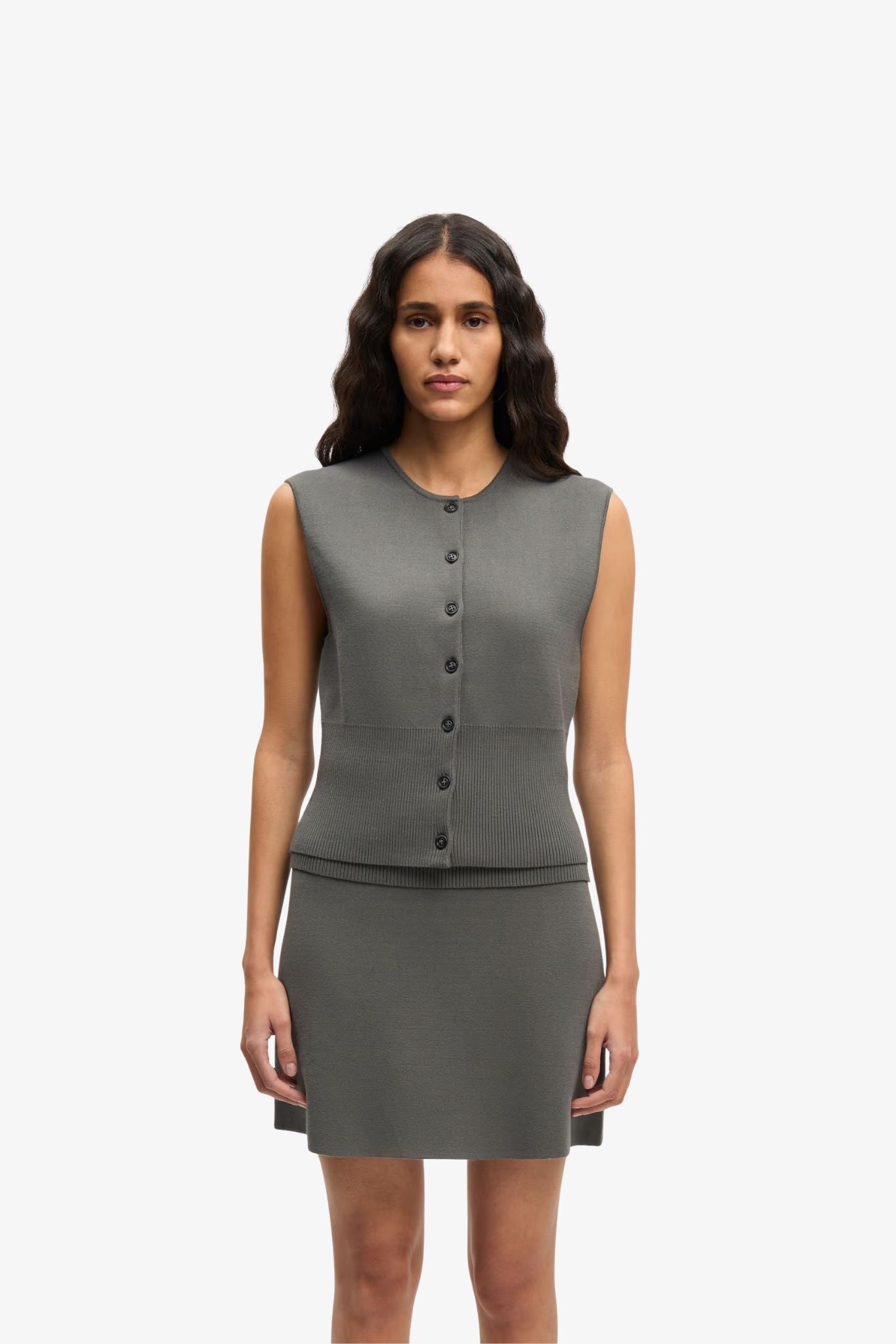A button closure at the front adds classic detailing, while the rib-knitted hem provides subtle structure and shape. The soft knit construction ensures comfort without compromising on elegance.