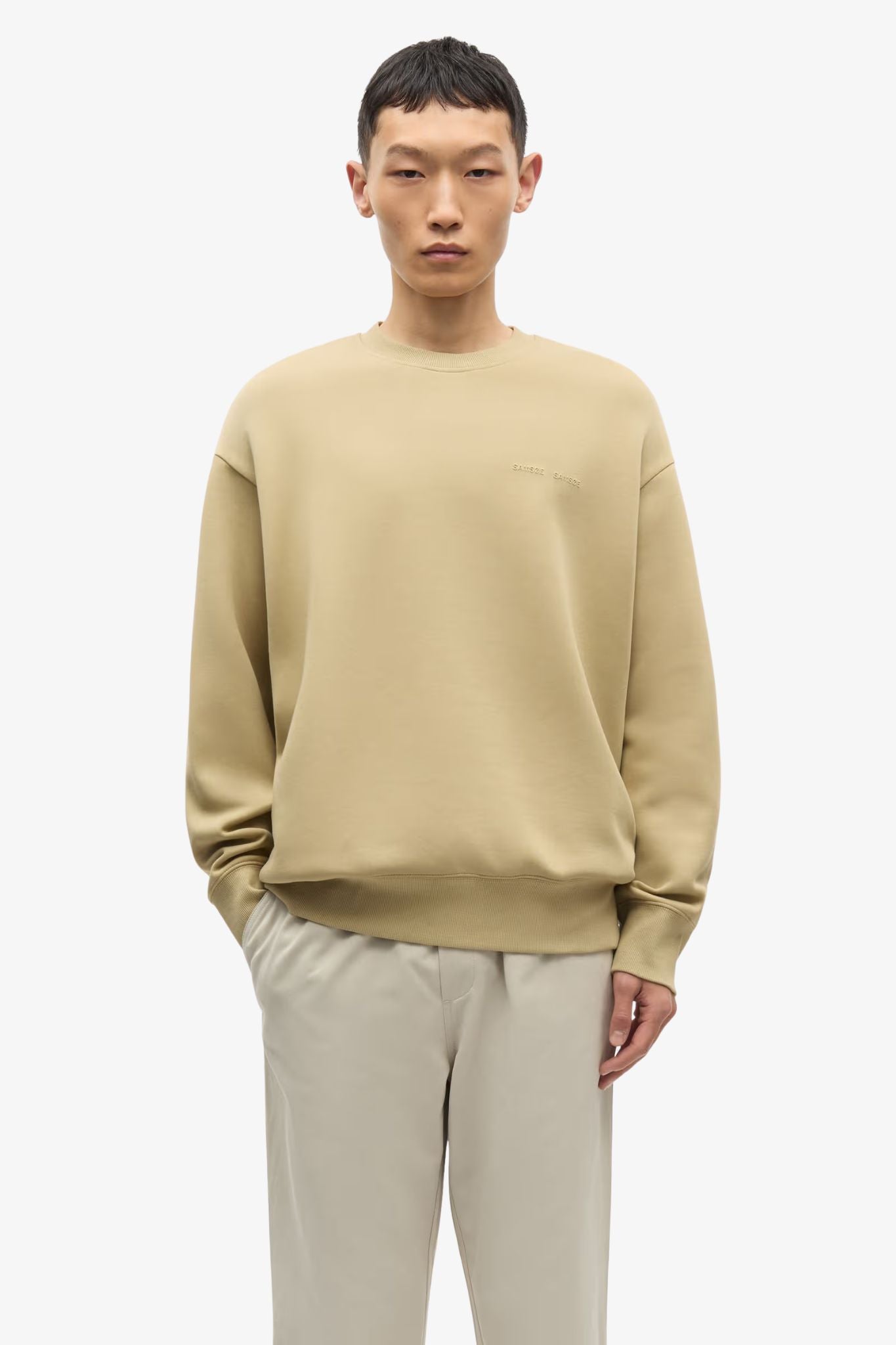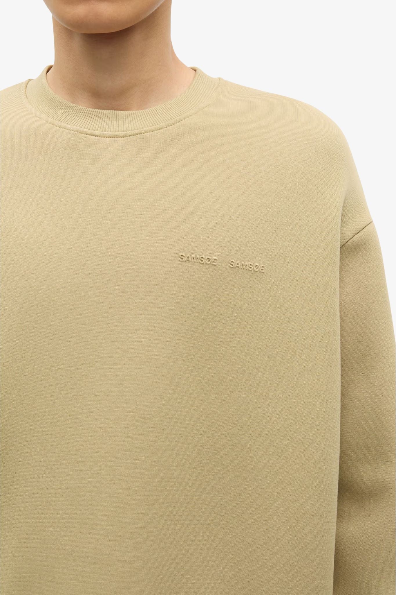 Long-sleeved jersey sweatshirt by Samsoe Samsoe Rib-knitted crewneck, cuffs, and hem. Tonal embroidered Samsøe Samsøe branding at the chest. Main material made from a blend of organic cotton and recycled polyester.
