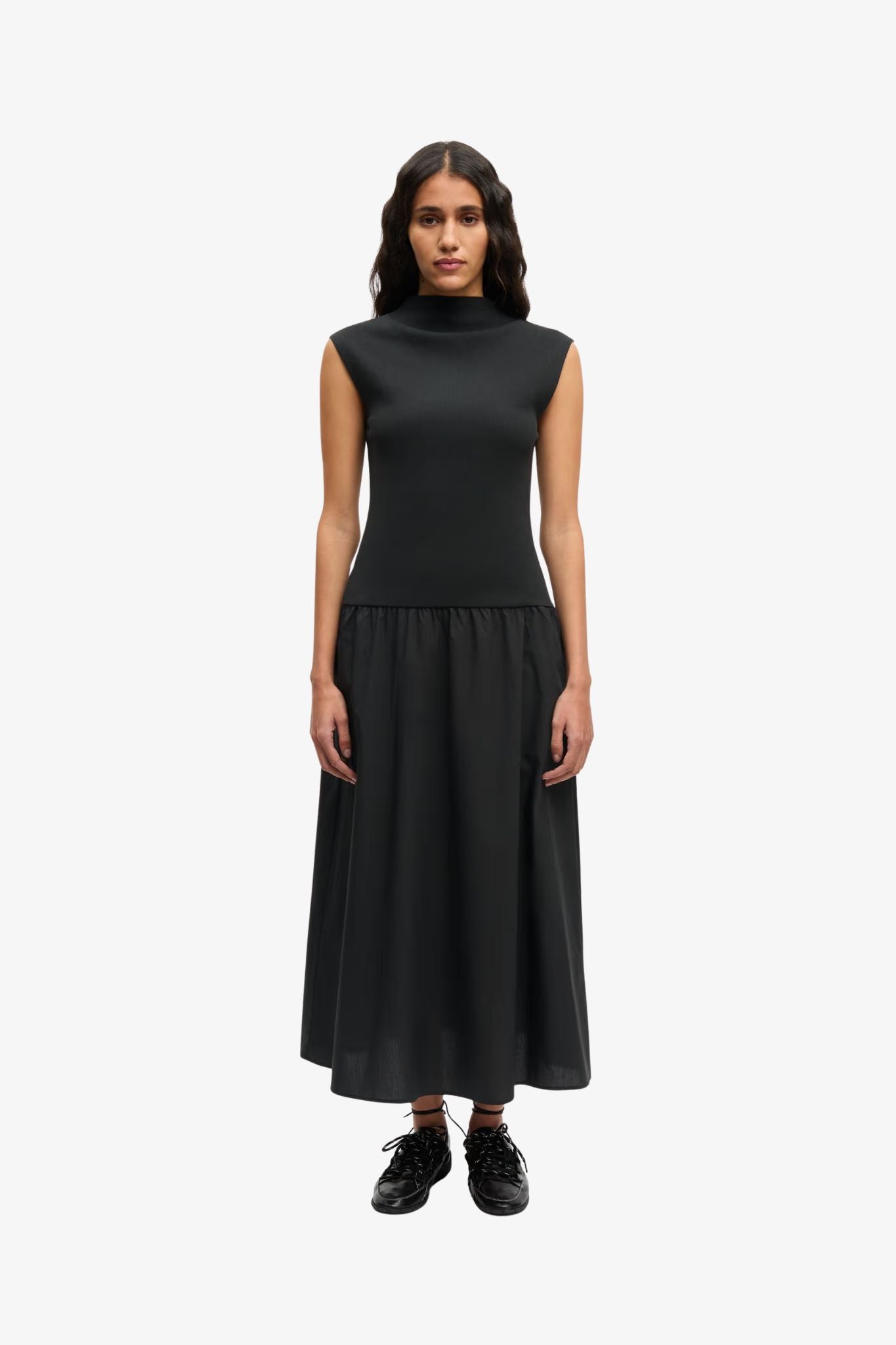 The high neckline and straight back add a clean, modern touch, while the combination of jersey and woven fabric offers both comfort and structure. The soft material ensures ease of movement, making it perfect for everyday wear as well as more elevated occasions.