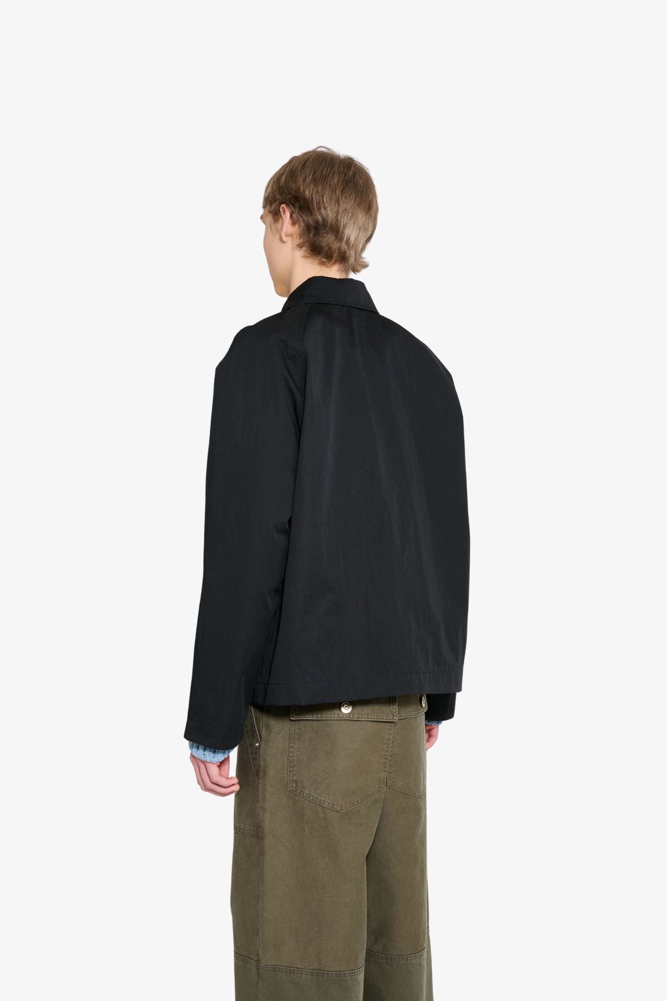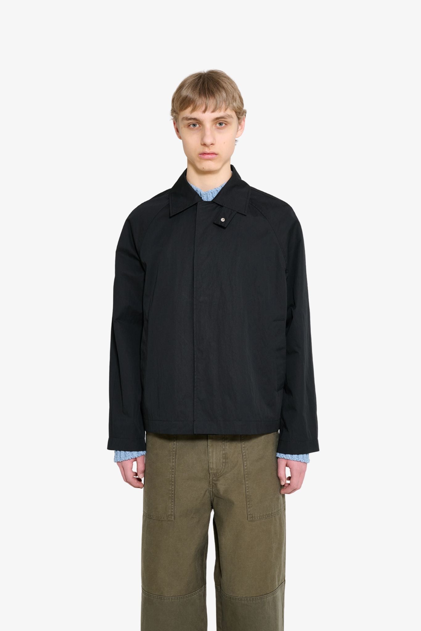 Designed with a modern cropped fit and classic raglan sleeves, it creates a relaxed yet refined silhouette. The silver metal snap button closure adds a clean industrial touch, while the integrated storm flap at the neck enhances protection and versatility.