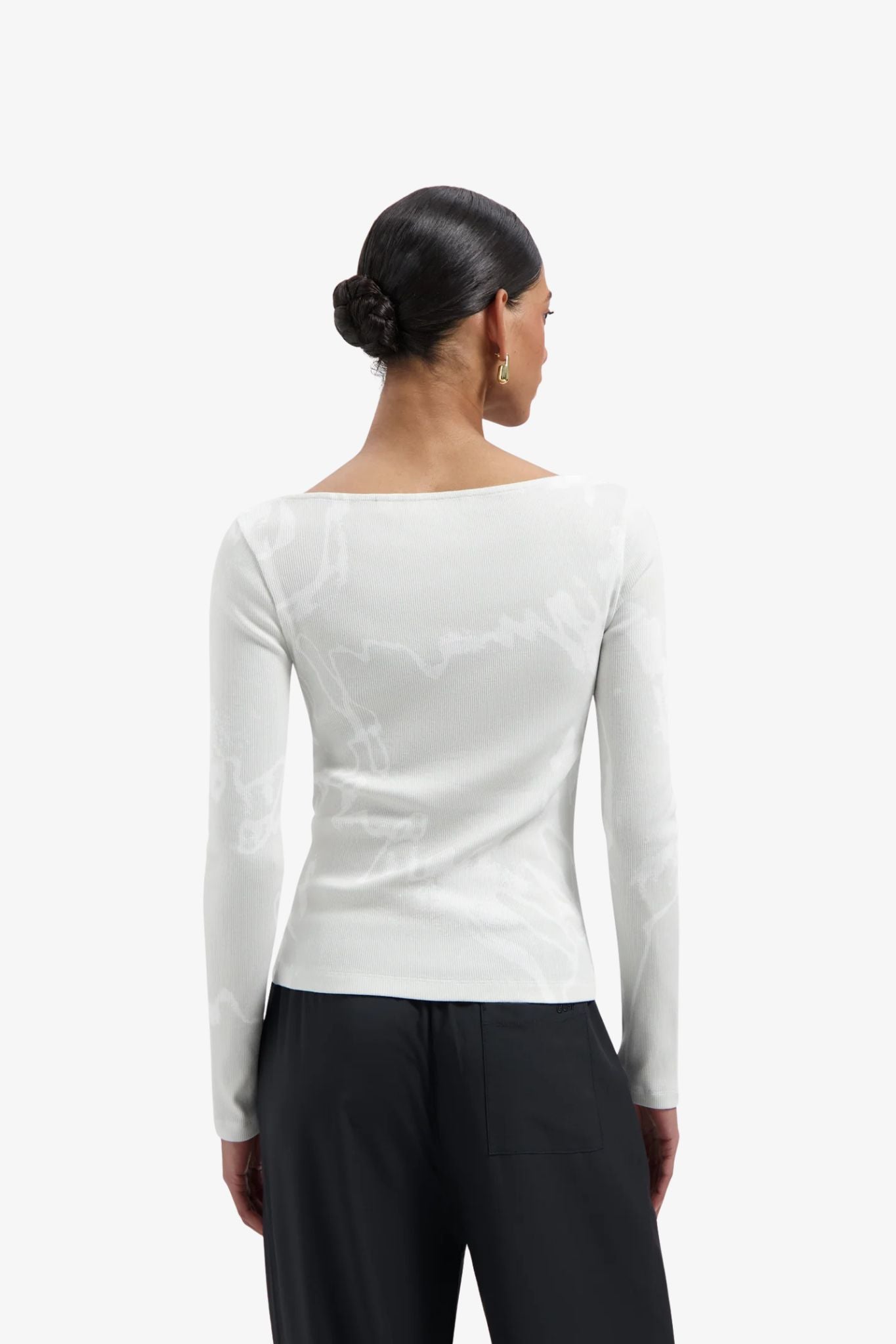 The Aop Boat Neck Top in Cement features an all-over print of playful graphics. With its long sleeves and breathable fabric, made from a portuguese cotton blend, this top offers a stylish modern look that's perfect for layering or on its own.