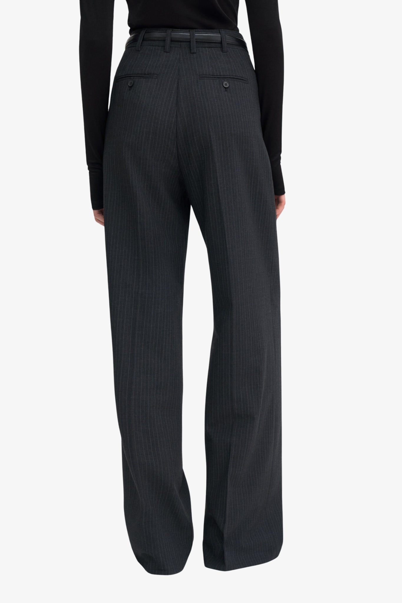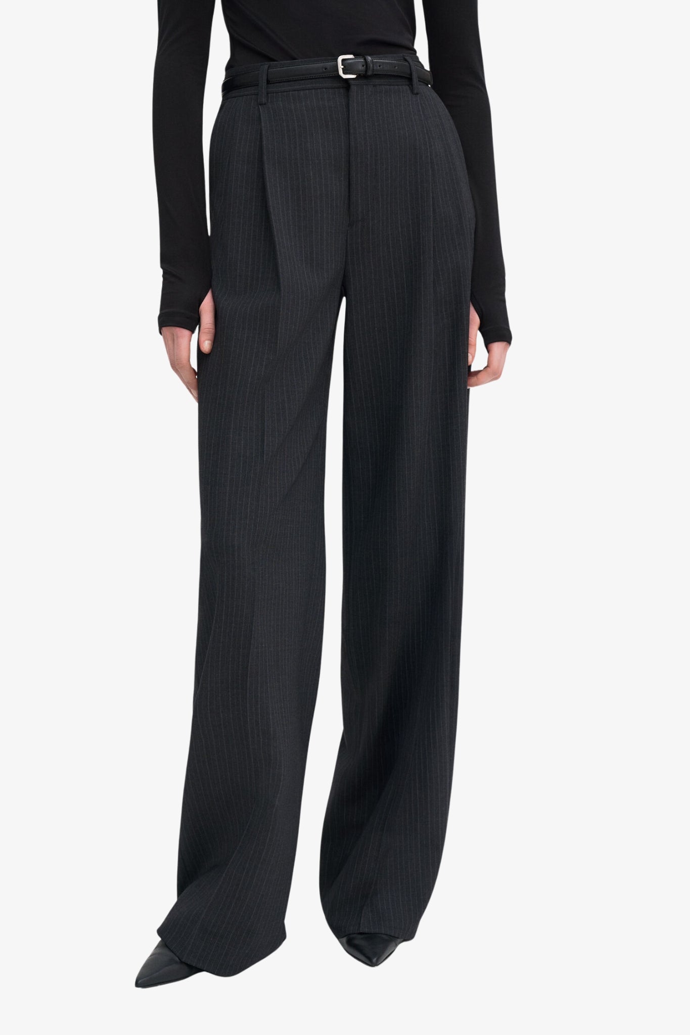 The Darcey Pinstripe Trousers embody tailored elegance with a high-fitted waist, sculptural pleats, and an expansive wide leg that extends to an extra-long length. Constructed from a mid-weight wool blend with subtle stretch, they offer refined structure and understated movement. Pair with the Hourglass Pinstripe Blazer to complete a cohesive, polished suit ensemble.