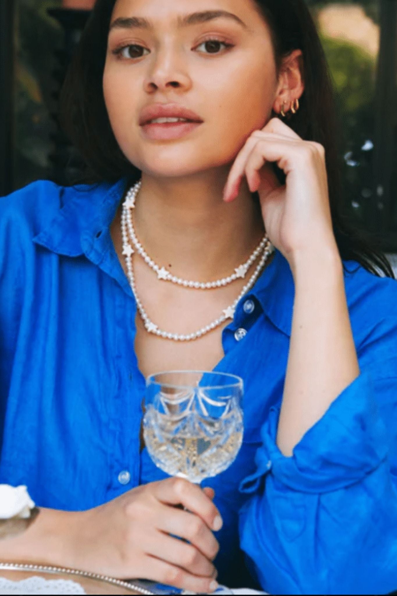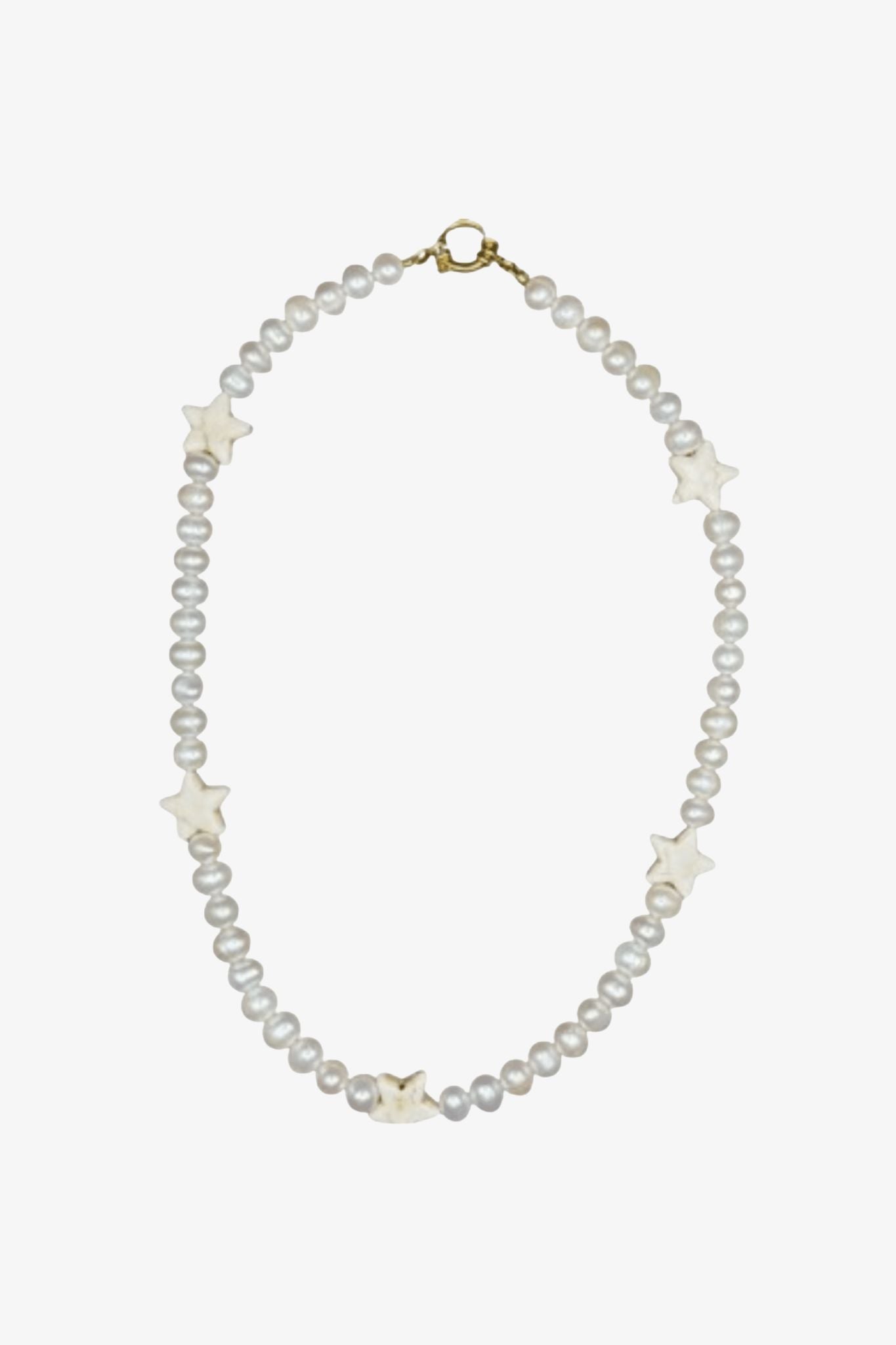 Deze prachtige sieradencollectie van Bonnie Studios biedt een unieke combinatie van natuurlijke schoonheid en modern ontwerp. De Bill ketting is gemaakt van elegante zoetwaterparels, die in elk licht stralen en een tijdloze klasse uitstralen. Gecombineerd met speelse howlietsterren, maakt dit item een subtiele maar krachtige modeverklaring.