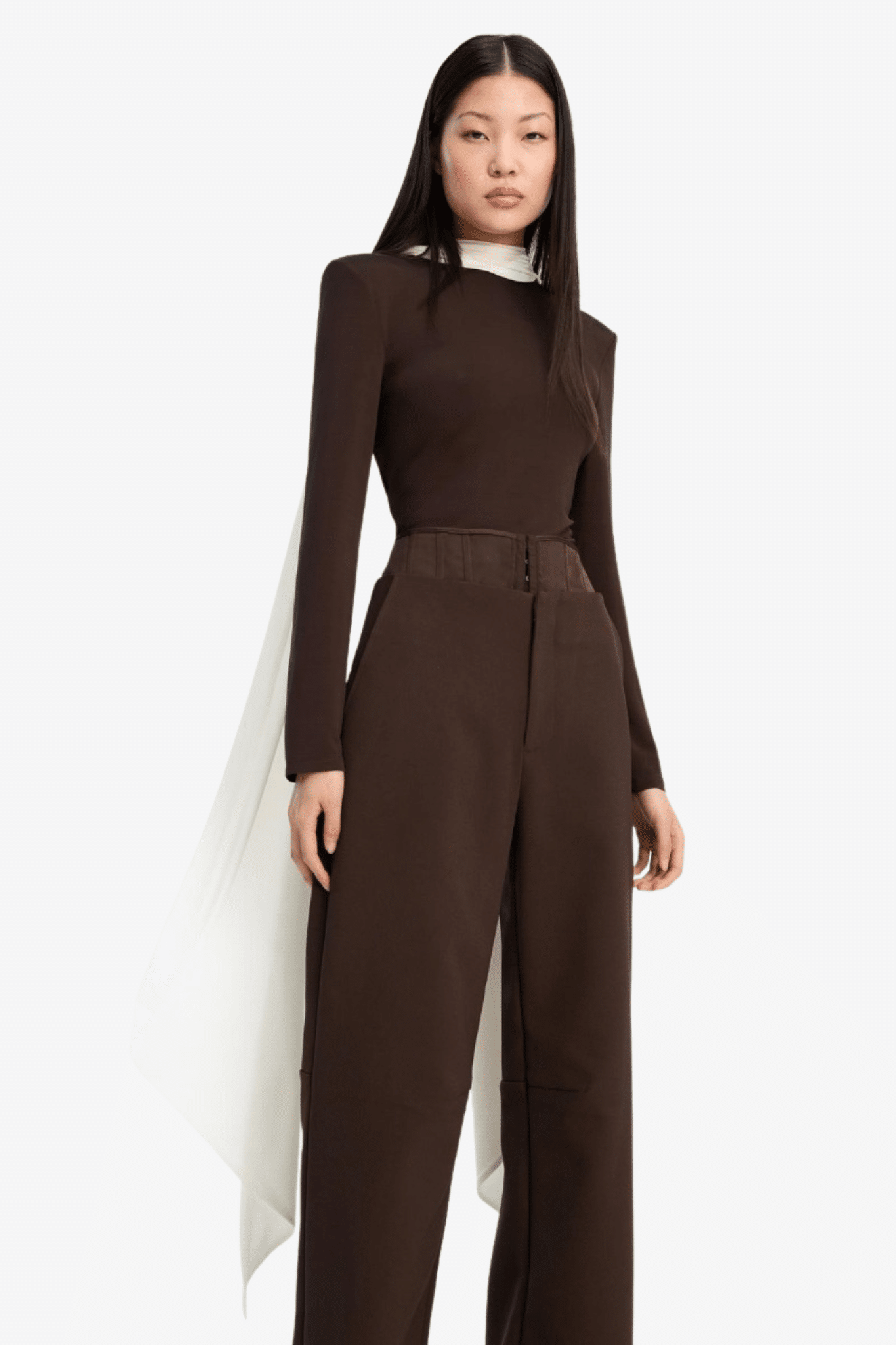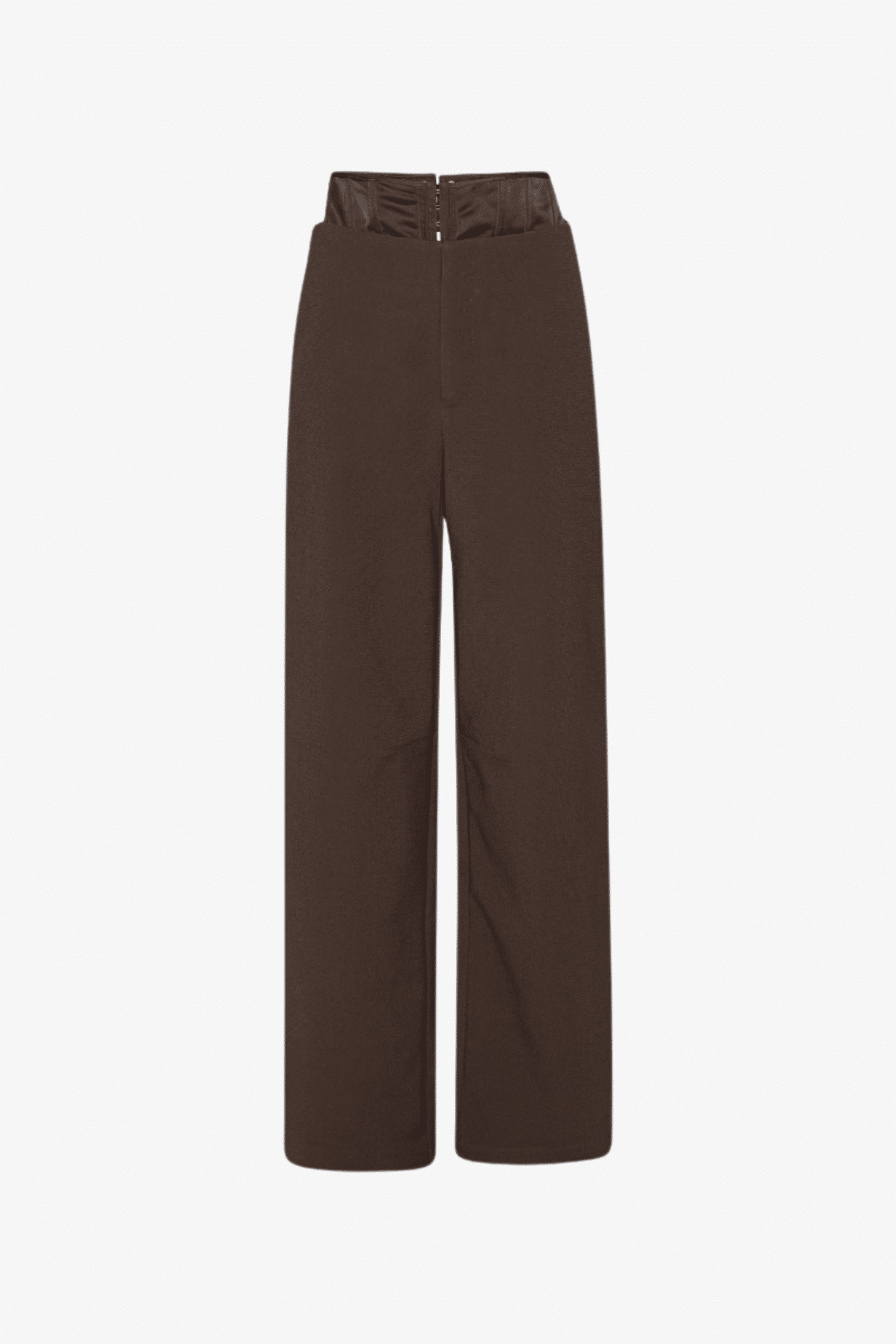 Ontdek de stijlvolle en elegante Korset Suiting Pants in Donkerbruin. Deze broeken zijn voorzien van wijde pijpen en zijn ontworpen met een strak en gestructureerd korset-geïnspireerd tailleontwerp in contrasterend satijn. De taille heeft opvallende haak-en-oogsluitingen aan de voorkant en een verstelbaar stropdasdetail aan de achterkant voor een perfecte pasvorm.