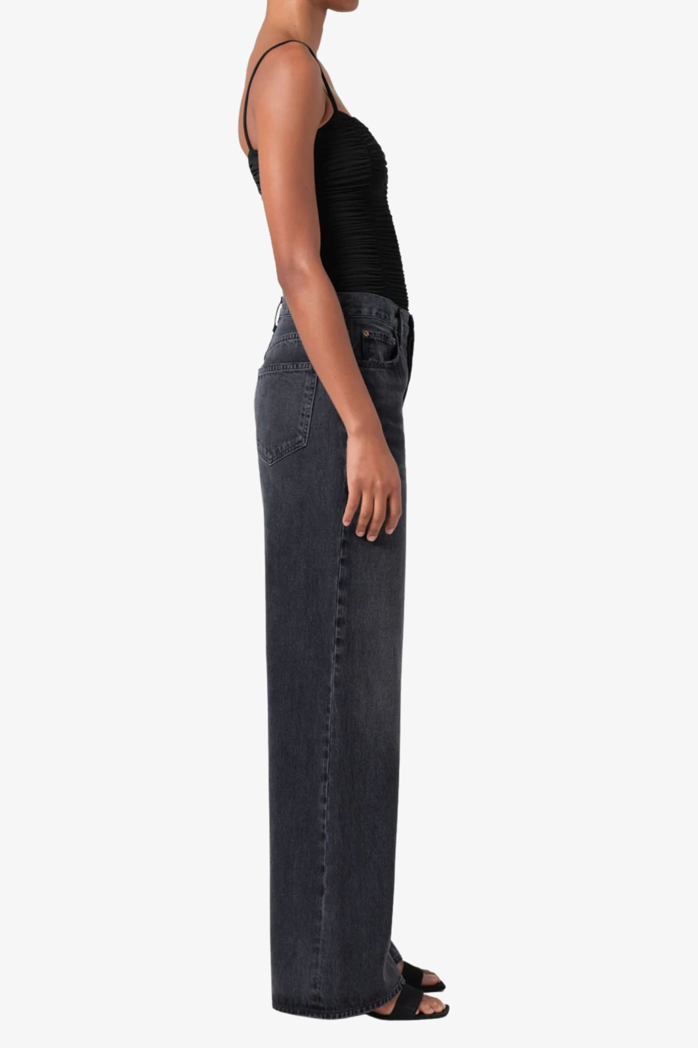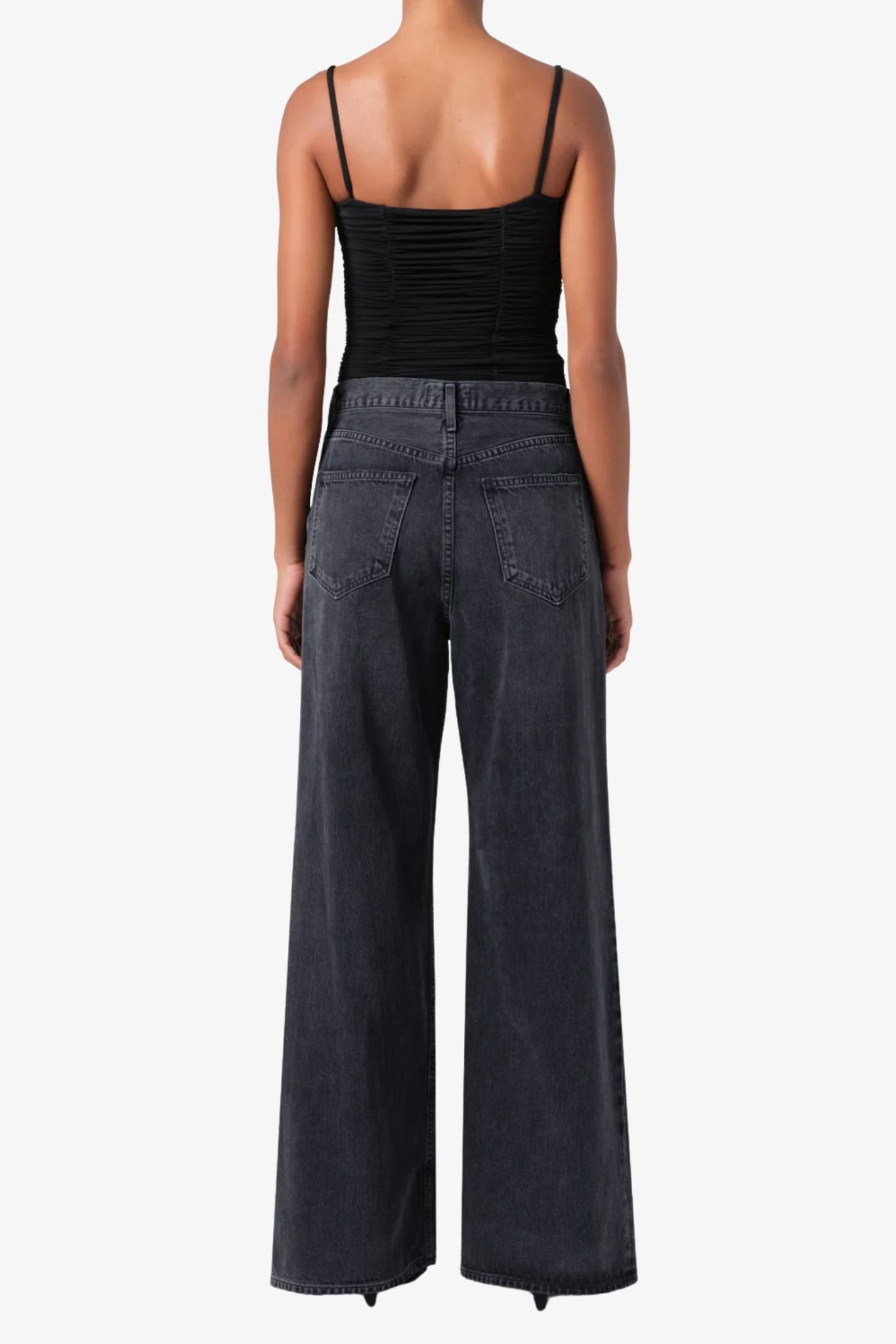 The Dame Jean is designed to flatter, featuring a waist-accentuating high rise, a relaxed fit through the hips, and a statement wide leg. Crafted from 100% regenerative cotton in washed black denim, it offers a clean, classic look. Style it with a sleek tee or ribbed knit for an effortless, everyday ensemble.