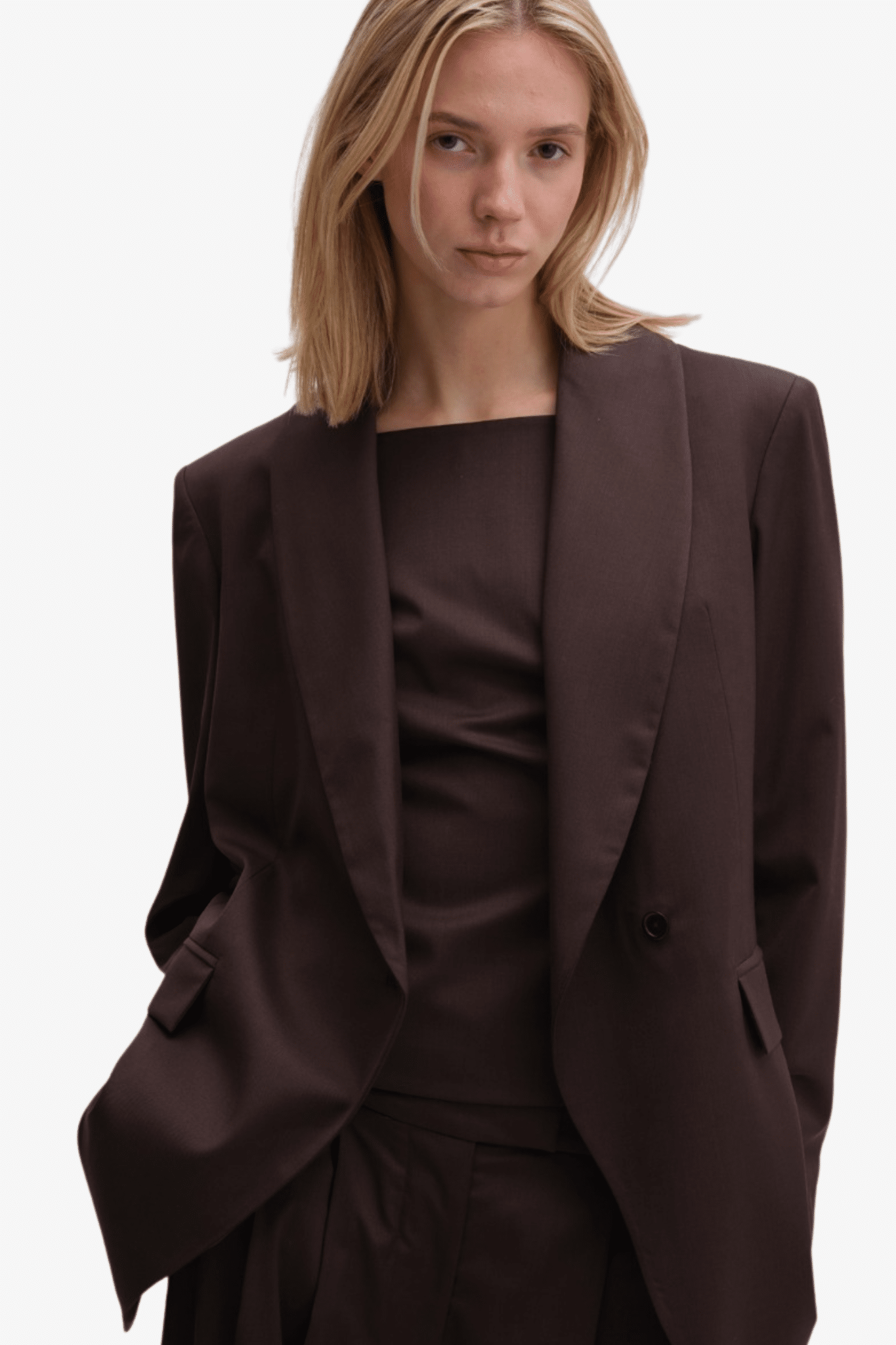 De blazer heeft een rechte zoom met een split aan de achterkant voor extra bewegingsvrijheid en comfort, terwijl de volledige voering zorgt voor een hoogwaardige afwerking. Gemaakt van duurzame materialen garandeert deze blazer zowel comfort als stijl. Combineer deze blazer moeiteloos met de bijpassende donkerbruine midi-rok met plooien, een off-shoulder kostuumtop, of een coconbroek met plooien voor een complete en modieuze outfit.