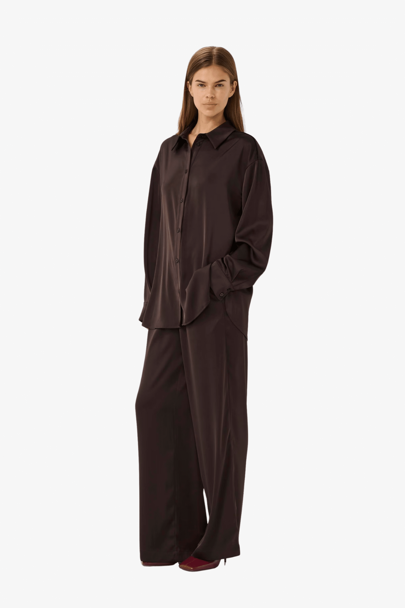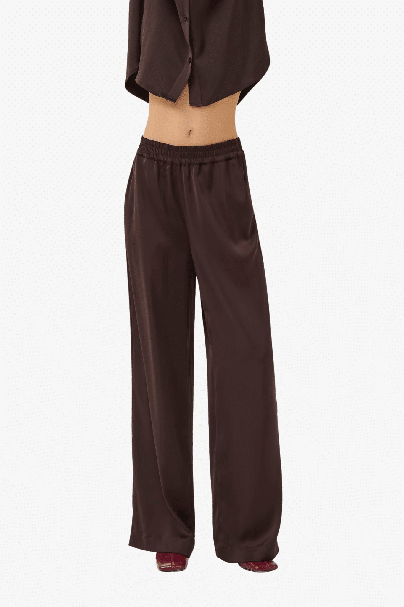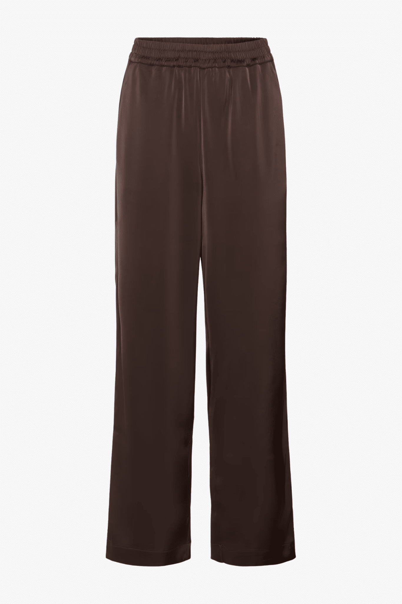 Met hun veelzijdige bruine kleur zijn deze broeken ideaal om te combineren met diverse tops en accessoires. Draag ze casual met sneakers of gekleed met hakken voor diverse gelegenheden. Het model is 179 cm en draagt een maat S/36, wat helpt bij het inschatten van de juiste pasvorm.