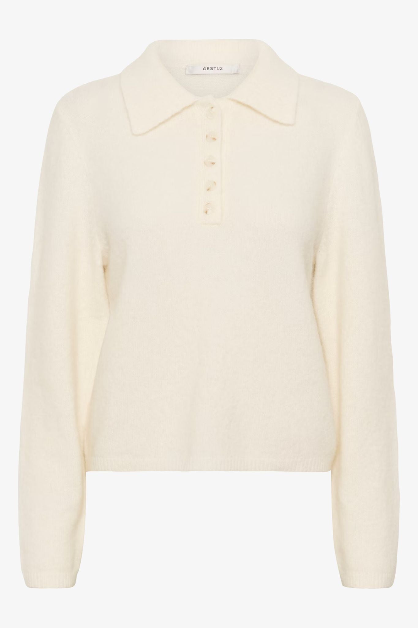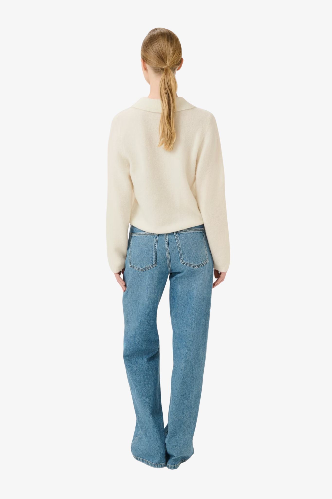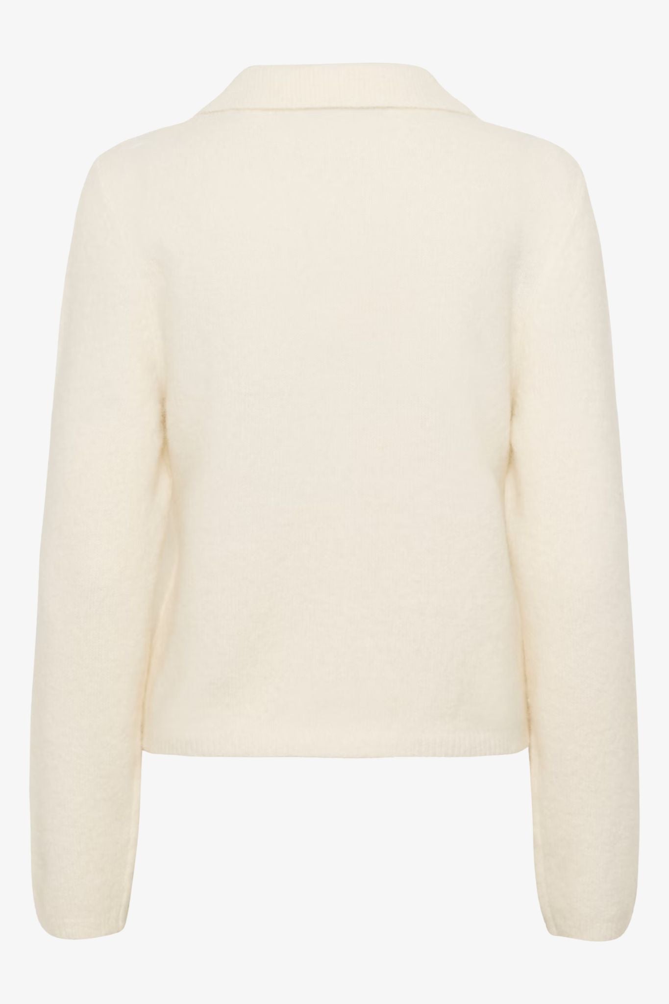 Zachte gebreide trui met een ontspannen pasvorm, klassieke polokraag en volledige knoopsluiting. Afgewerkt met lange mouwen en geribde boorden voor extra comfort en structuur.