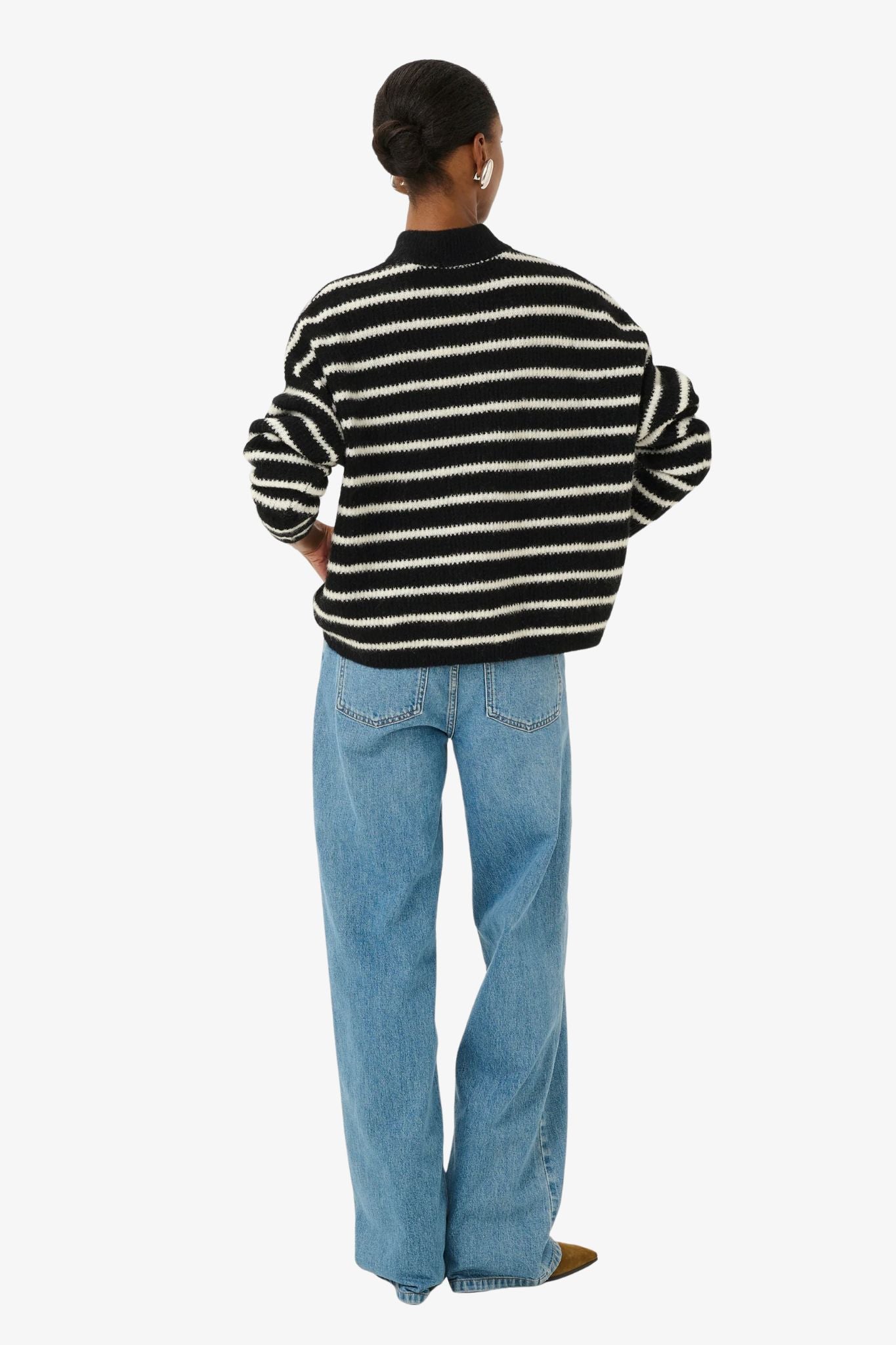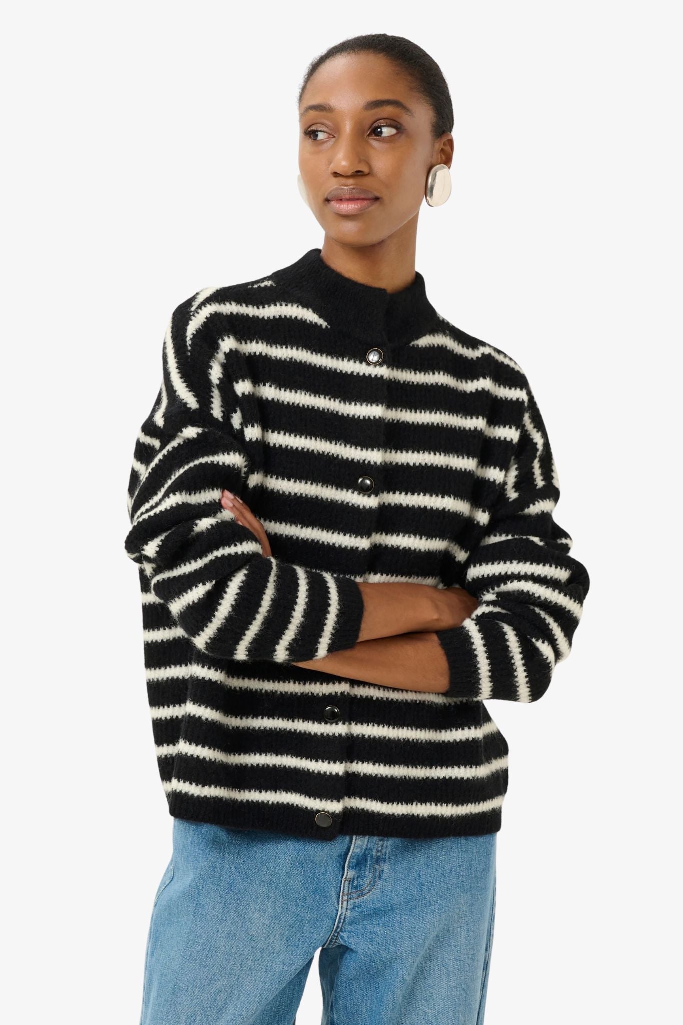 Striped short-sleeve cardigan from Gestuz with a fuzzy textured finish, button-down front, mock neck, and straight fit. A modern take on knitwear with distinctive horizontal stripes.