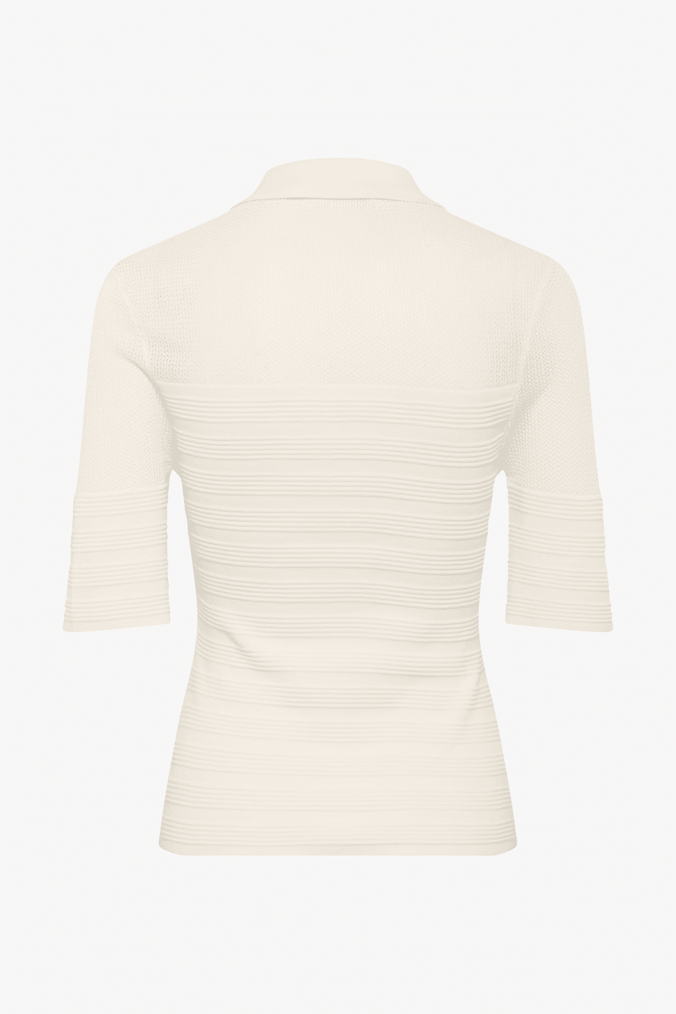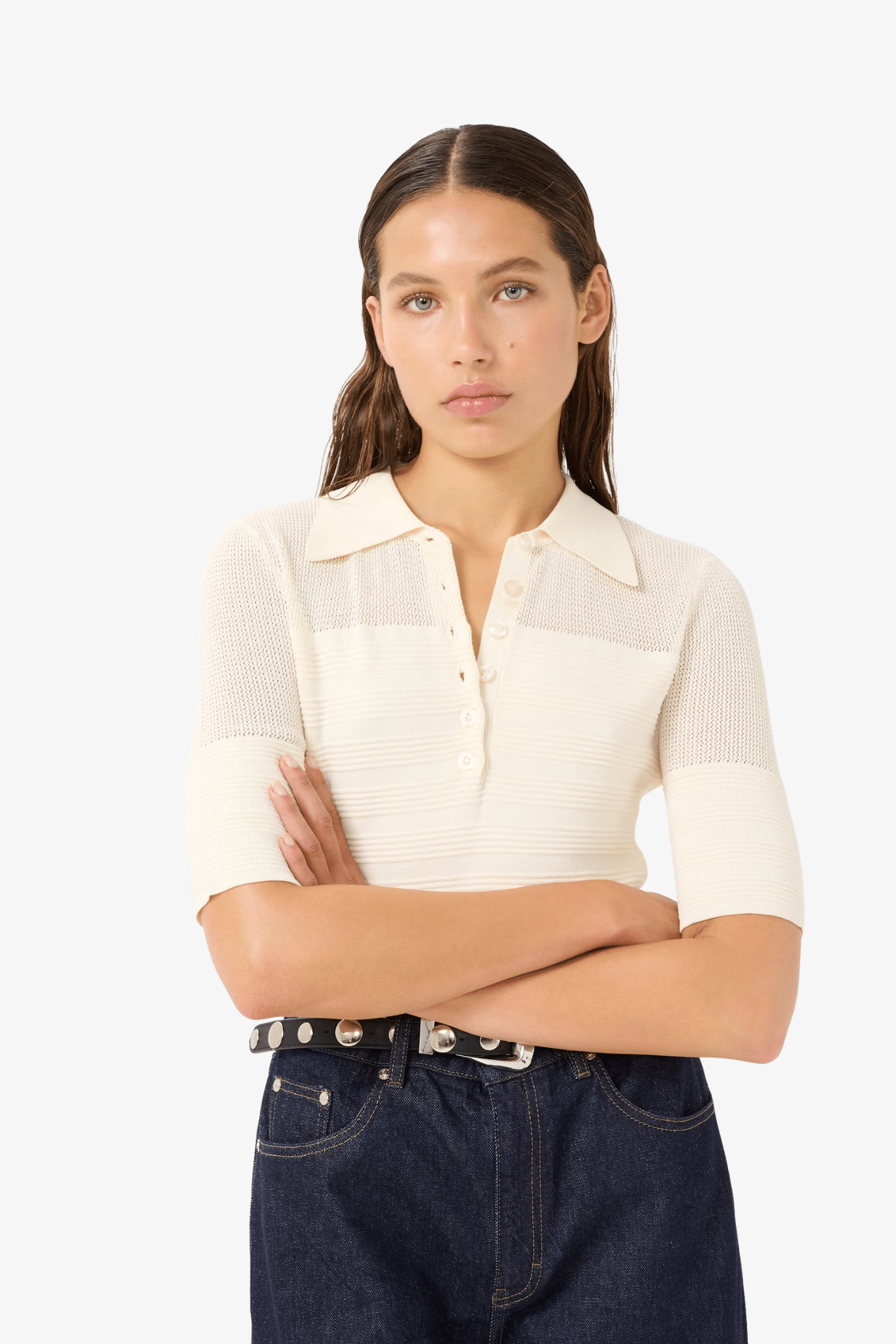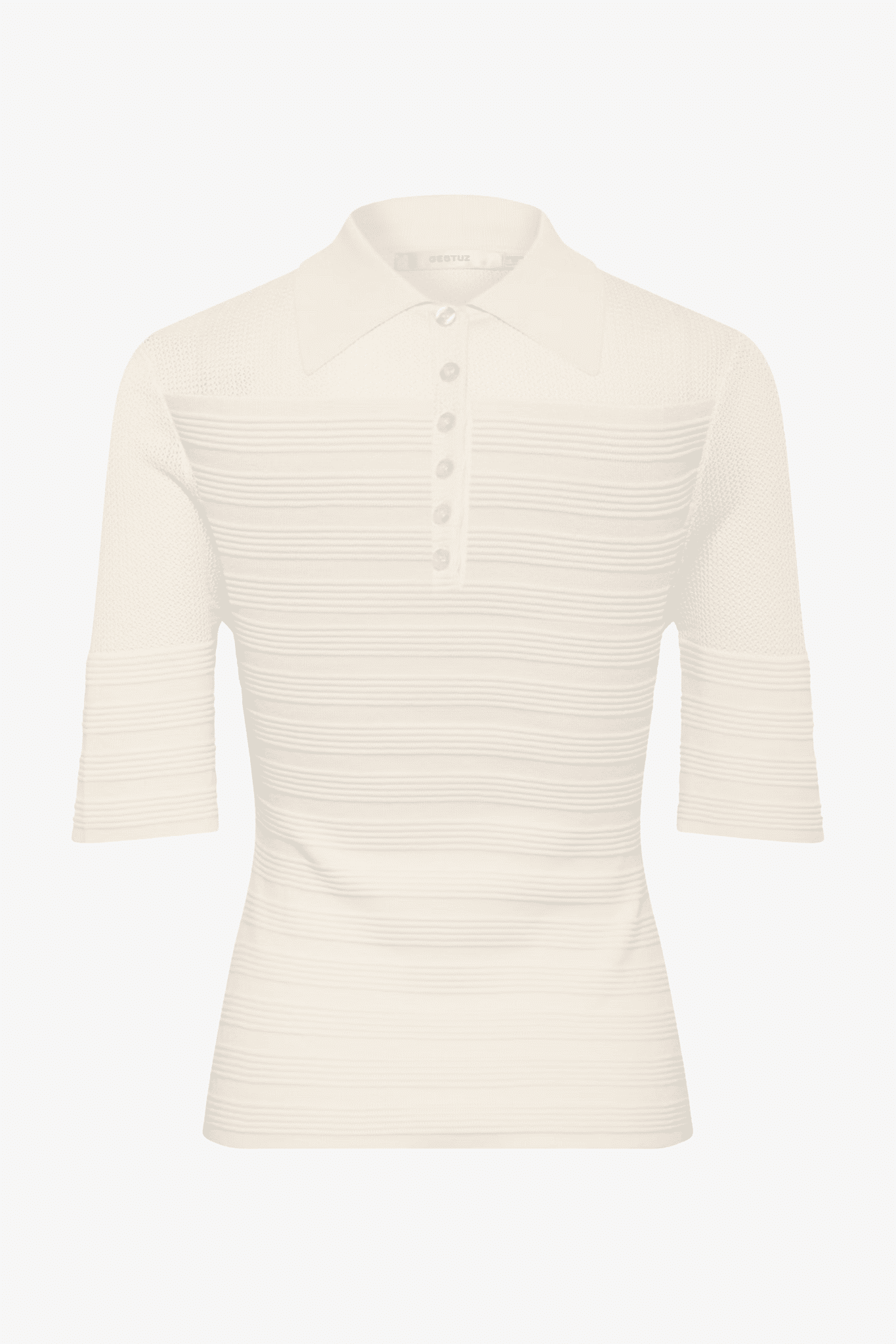 Ontdek de nauwsluitende gebreide top voor dames van Gestuz, een stijlvolle toevoeging aan je garderobe. Deze top met polokraag en knoopsluiting is perfect voor zowel casual als formele gelegenheden. De mouwen tot de elleboog en de unieke transparante panelen over schouders en mouwen zorgen voor een moderne, gestructureerde uitstraling waarmee je zeker de aandacht trekt.