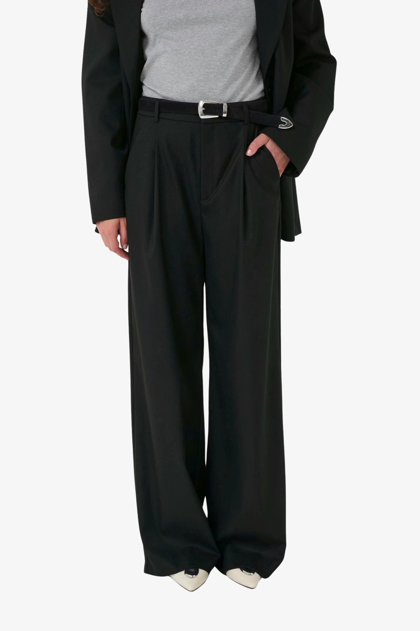 These wide, formal trousers from Gestuz feature soft pleats at the front, a mid-rise waist, and belt loops. They are finished with side pockets and a smart back pocket for a polished look. The model is 176 cm tall and is wearing a size S/36. Sizes 36/S/27: waist 74 cm and inseam 81 cm.