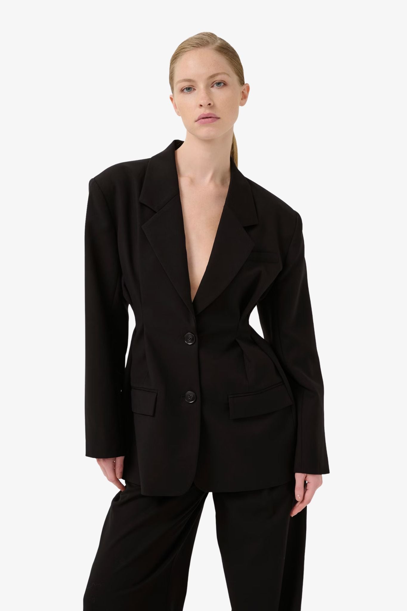 Getailleerde, oversized blazer met klassieke revers en sluiting met twee knopen. Het design wordt benadrukt door taillenaden die zorgen voor een geaccentueerd silhouet.