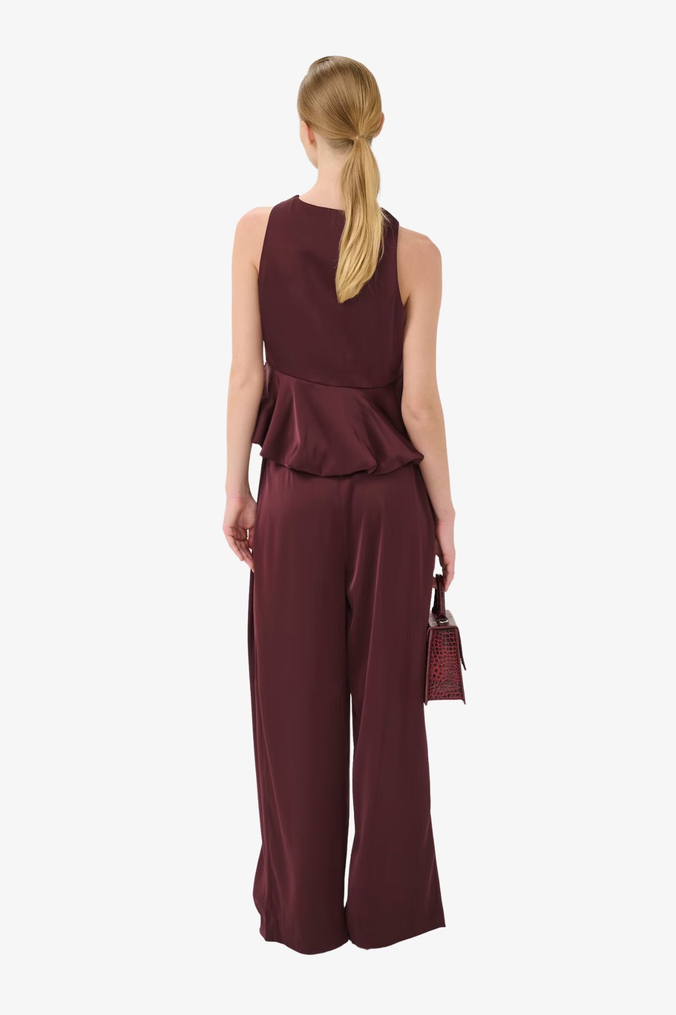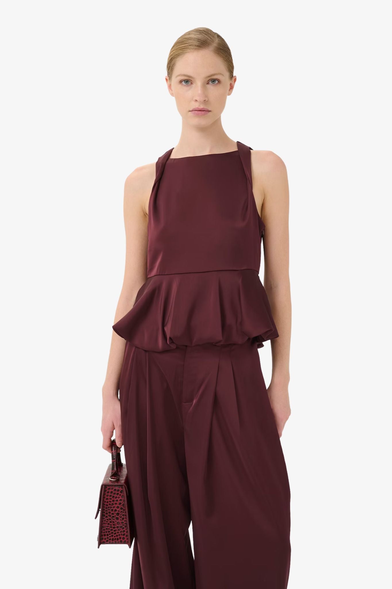Dit elegante satijnen topje combineert minimalistische lijnen met verfijnde details. De opvallende halslijn wordt geaccentueerd door subtiele plooien op de schouders, terwijl de gestructureerde peplumzoom aan de onderkant een verfijnd silhouet creëert. Het stuk is ontworpen voor een nauwsluitend draagcomfort en eindigt op heuplengte. Zonder mouwen en gemaakt van een luxe polyester-elastaanmix die elegantie en bewegingsvrijheid combineert.