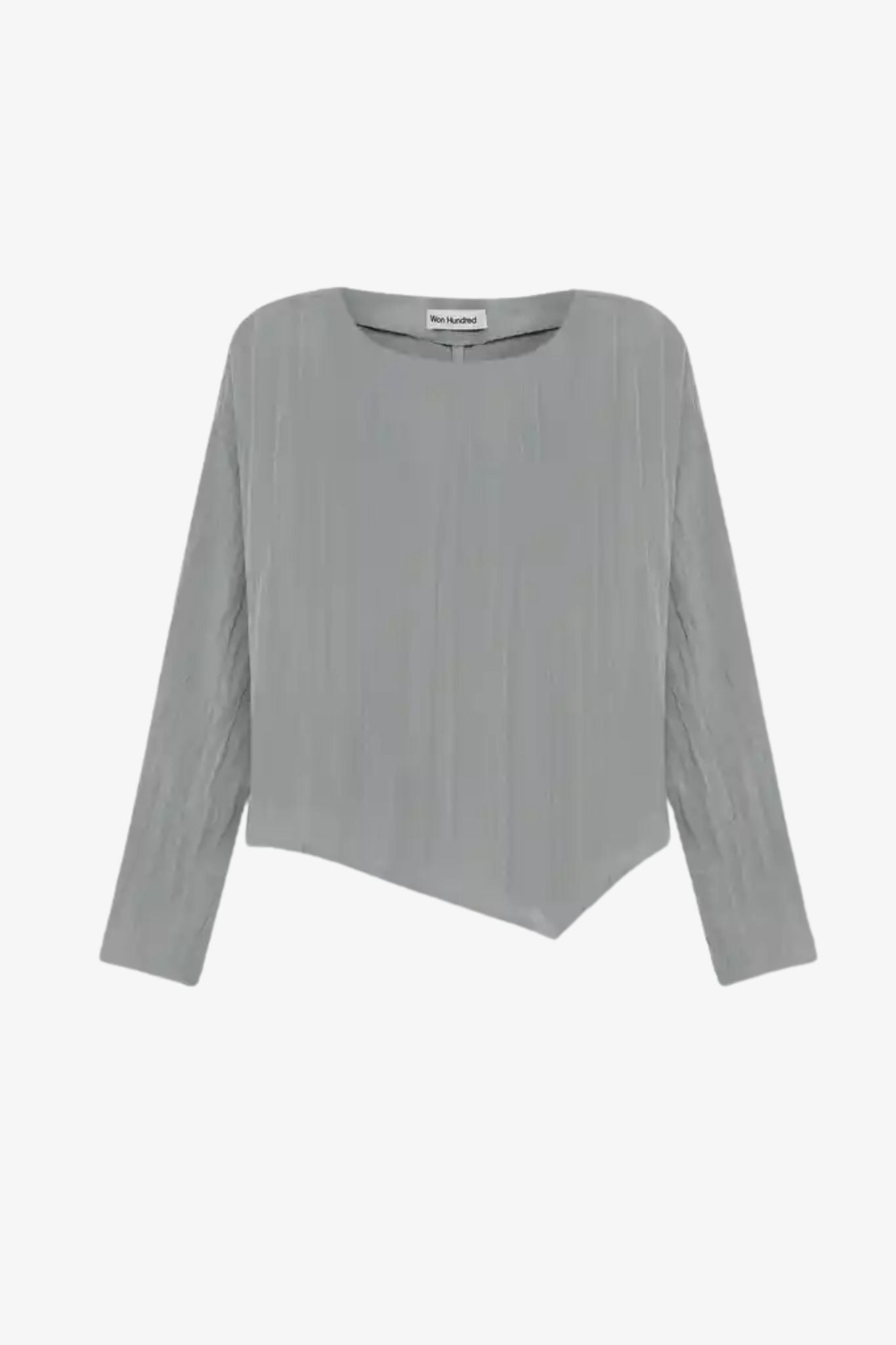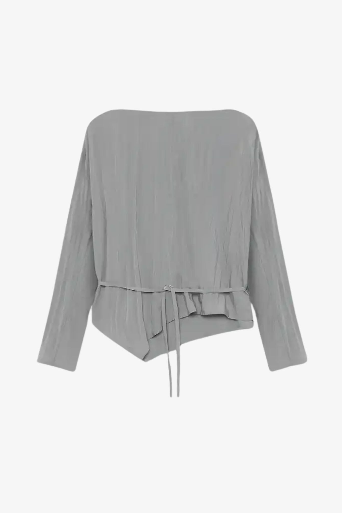 The Hailee Shirt is crafted from a light, drapey textured fabric, featuring an open, asymmetrical neckline. It has a straight fit when untied, and the hem is asymmetrical, making it the perfect match for your Won Hundred jeans.