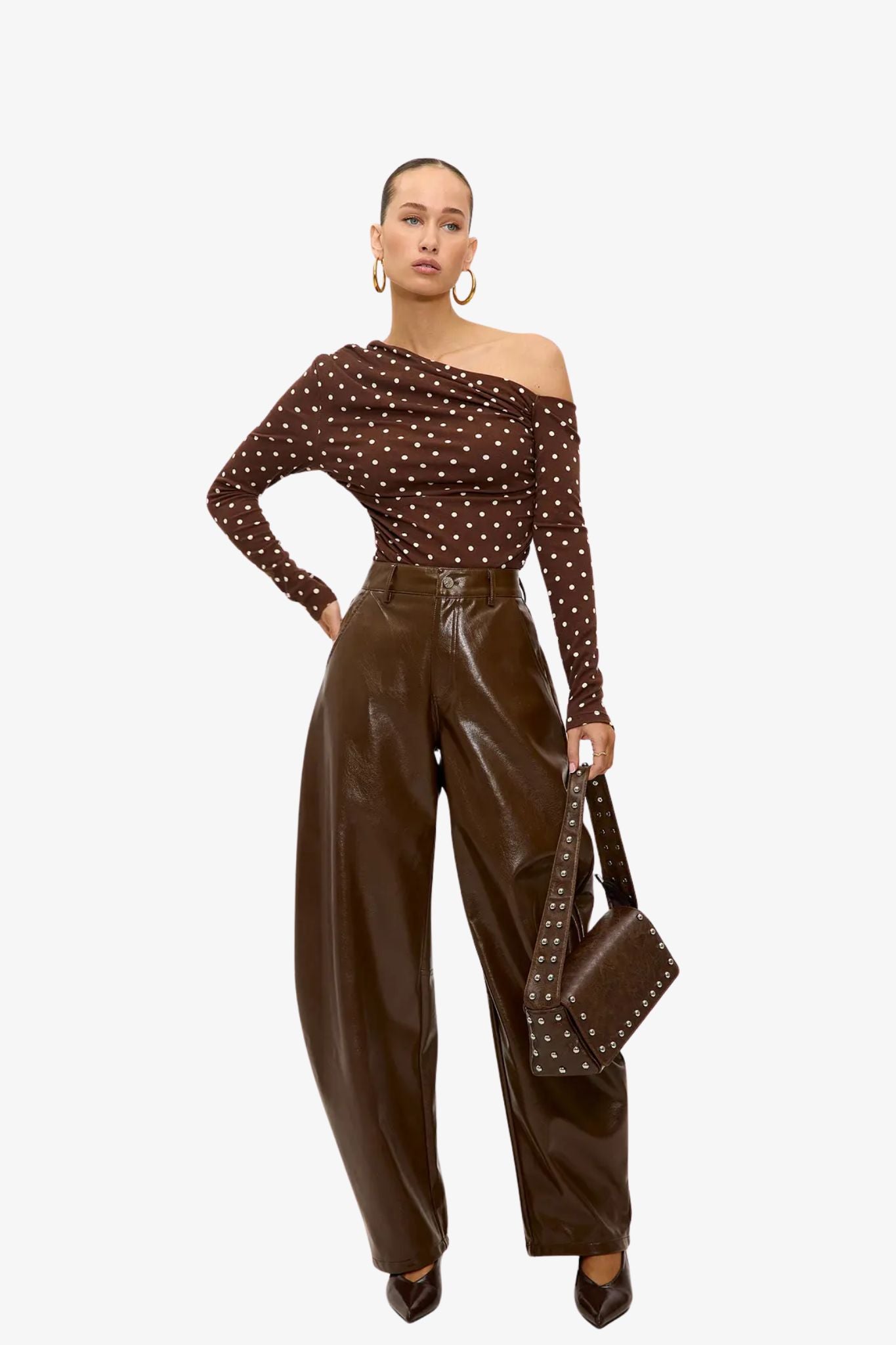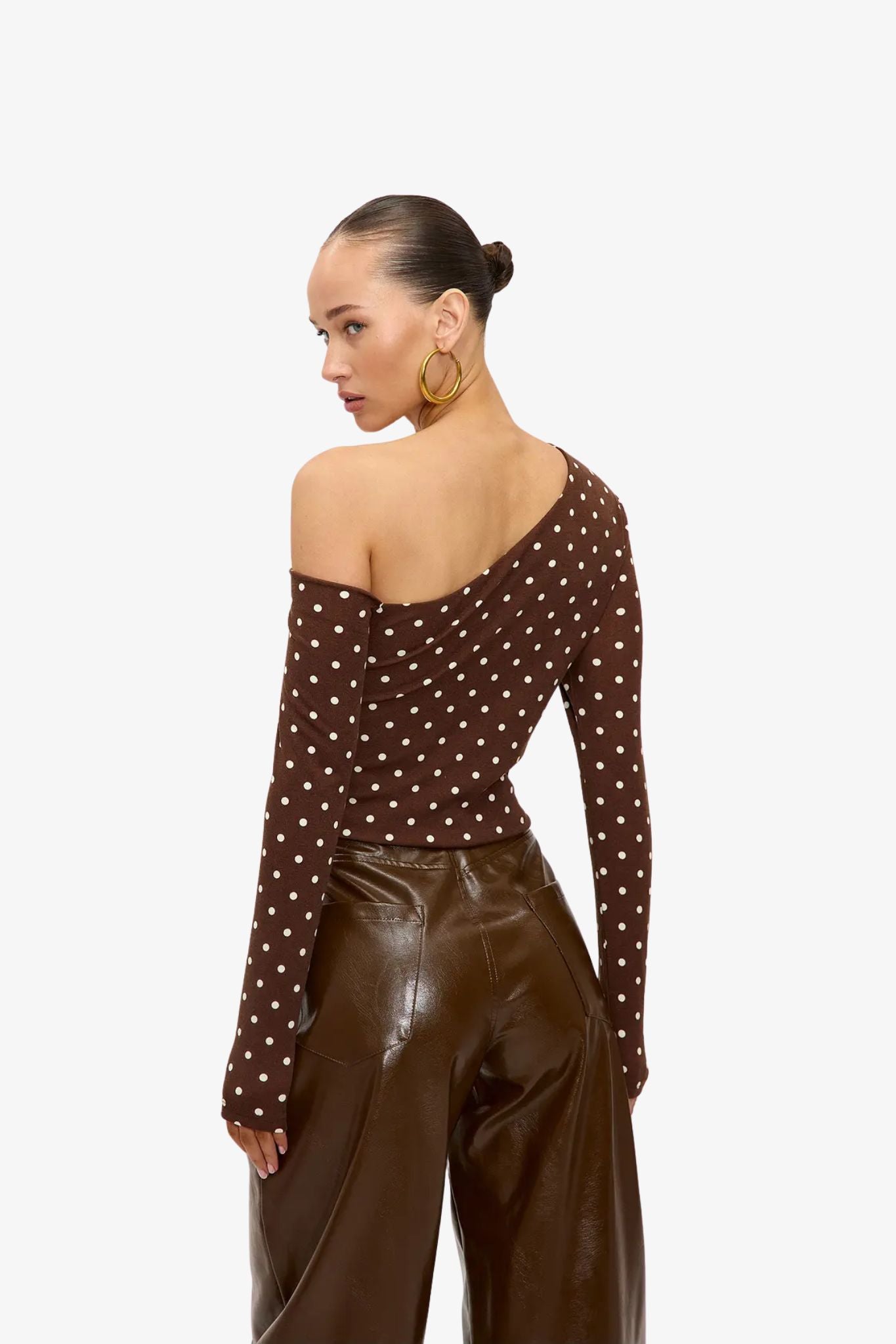 Donkerbruine off-shoulder top met een speelse polkadot print die een vintage-geïnspireerde uitstraling creëert. Het asymmetrische one-shoulder design met lange mouwen brengt een moderne twist op deze klassieke print. Gemaakt van een stretchy polyester blend voor optimaal comfort en een nauwsluitende pasvorm. Perfect gecombineerd met leren accessoires voor een verfijnde, statement-making look.