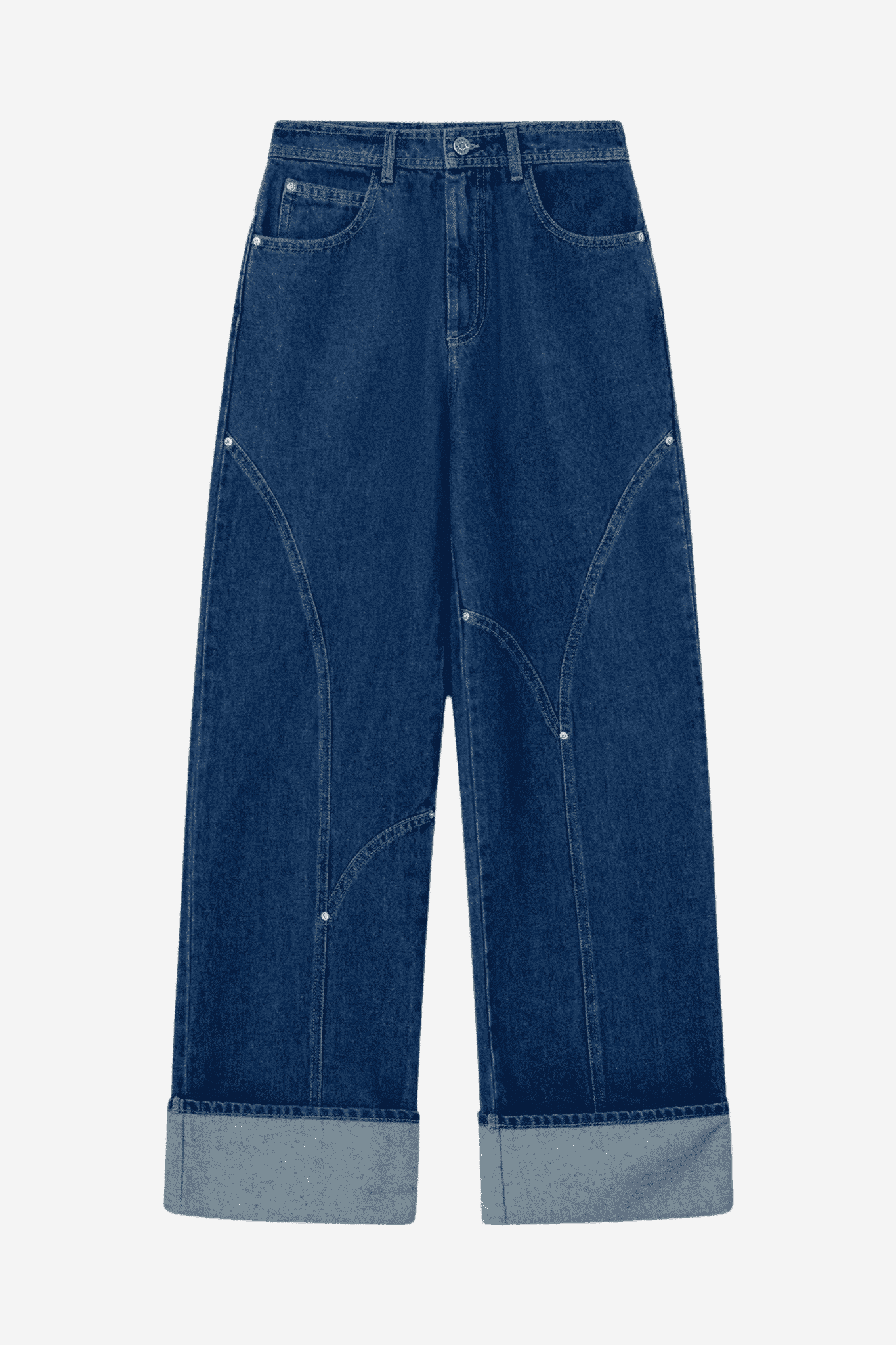 Ontdek de perfecte balans tussen stijl en comfort met de denim jeans met hoge taille van Laagam. Deze jeans is ontworpen met wijd uitlopende pijpen en unieke gebogen stiksels, die zowel de voor- als de achterkant sieren. De omgeslagen onderkant voegt een vleugje verfijning toe aan deze casual middenblauwe jeans. Met functionaliteit in gedachten heeft deze broek twee handige zakken aan de voorkant. De jeans sluit met een metalen knoop en biedt verder een karakteristieke look dankzij de gebogen naden bij de rits.