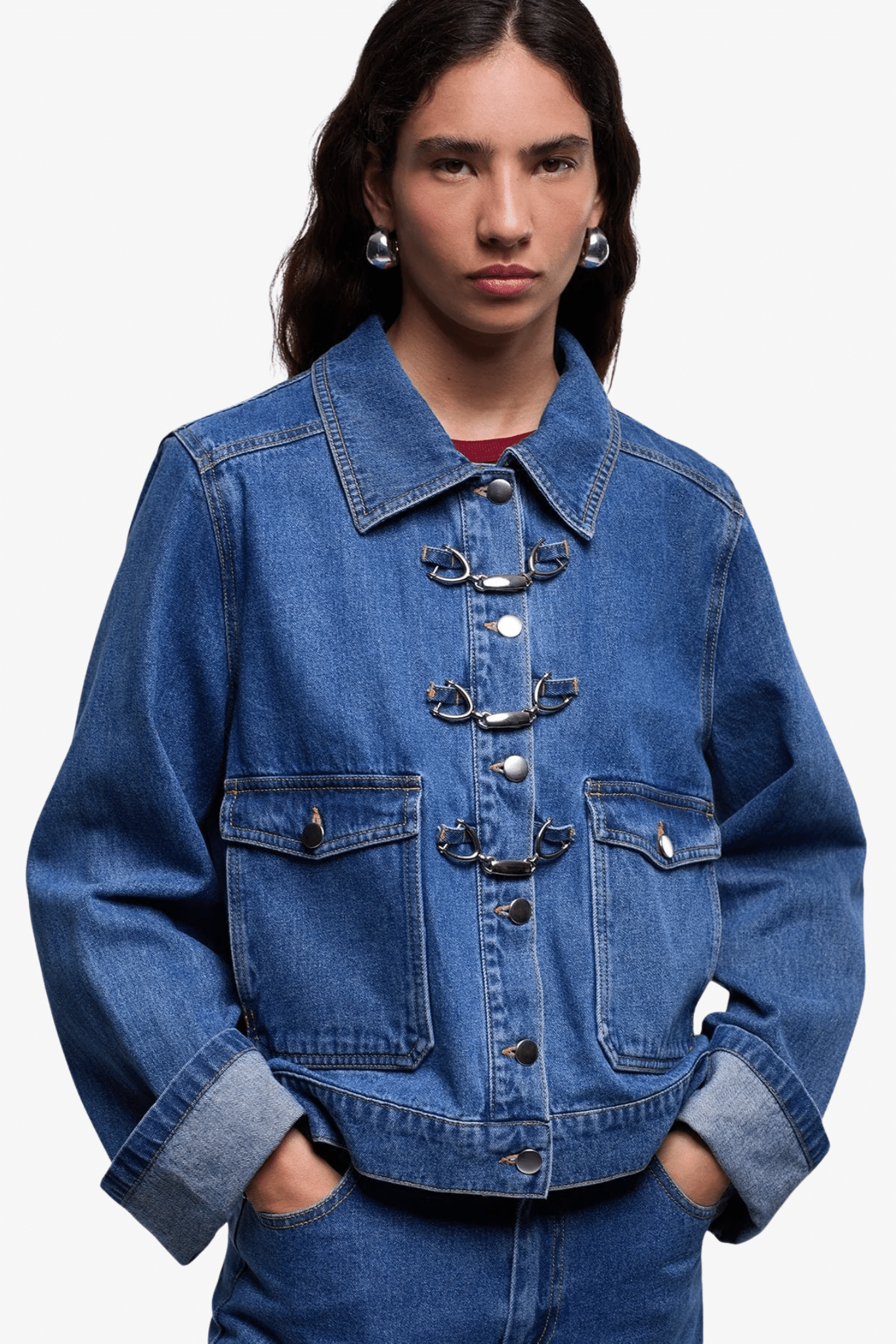 Voorzien van twee handige steekzakken met opgestikte paspels, biedt dit jasje niet alleen stijl, maar ook functionaliteit. Het schouderstuk, met gedetailleerde stiksels voor- en achter, geeft extra structuur en een verfijnde uitstraling. De opvallende metallic zilveren knoopsluiting met drie metalen gespen aan de voorkant, voegt een elegant detail toe aan de klassieke indigo denimkleur.