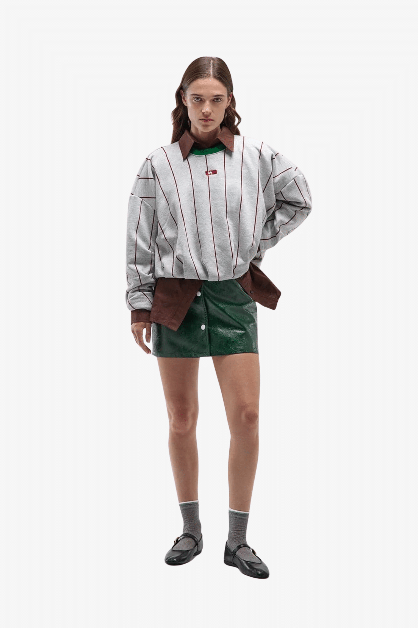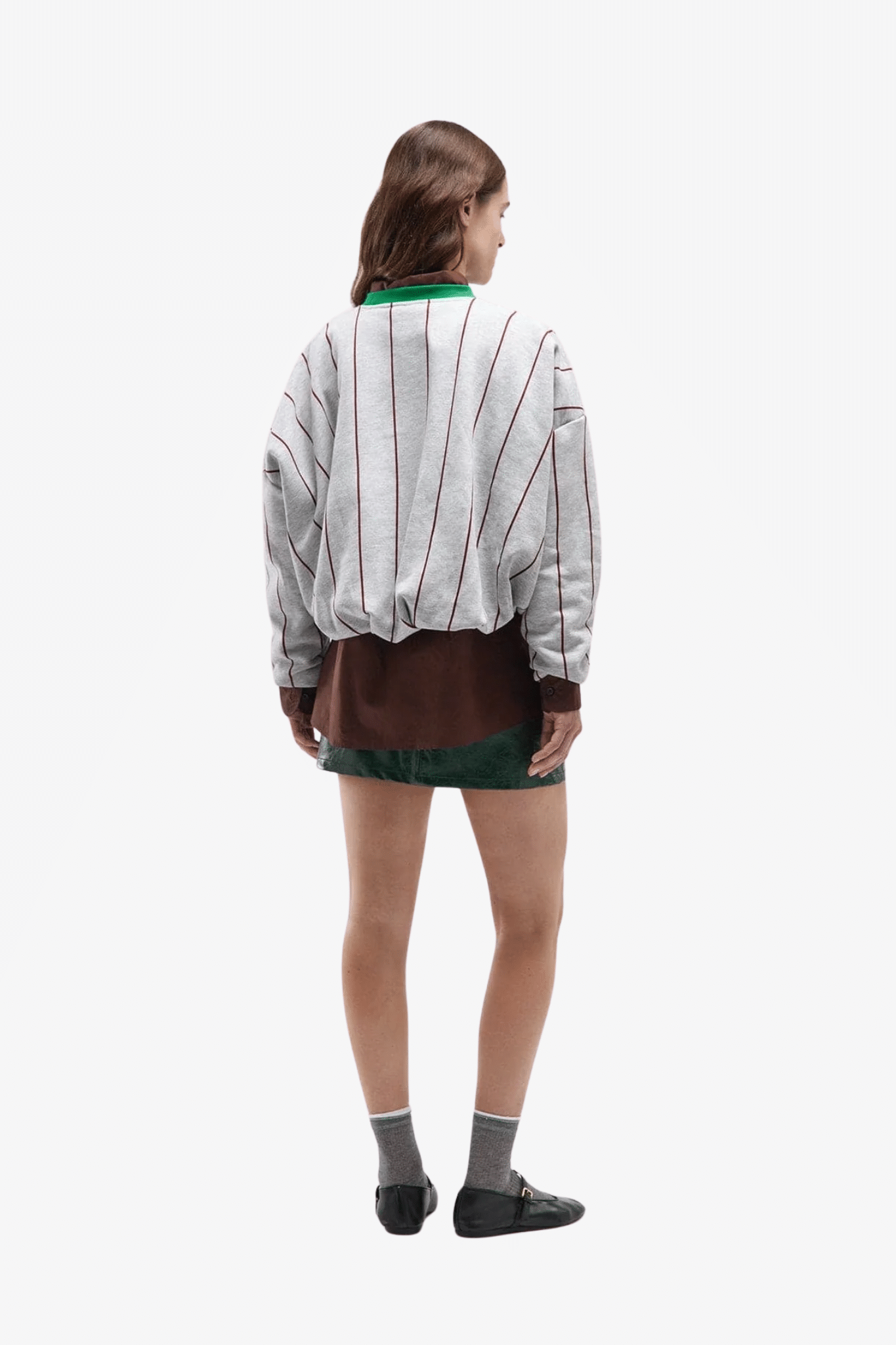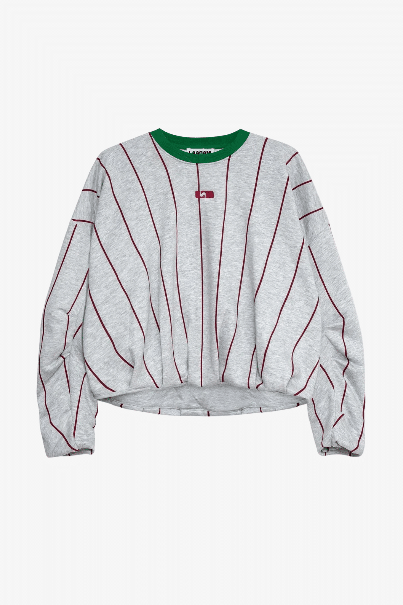 De Laagam oversized sweater is een bijzondere trui met een stijlvol strepenpatroon. Deze grijze sweater biedt een comfortabele pasvorm door de lange mouwen en het geplooide volume bij mouwen en taille, wat een speelse twist geeft. De contrasterende ronde hals en het subtiele geborduurde logo op de voorkant maken deze trui een stijlvolle keuze voor diverse gelegenheden.