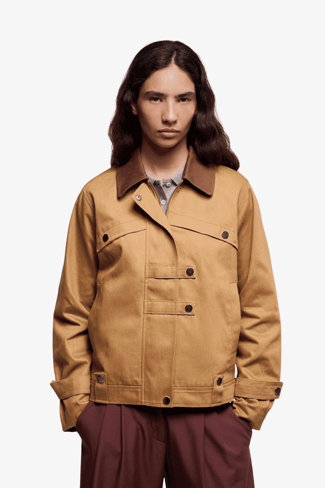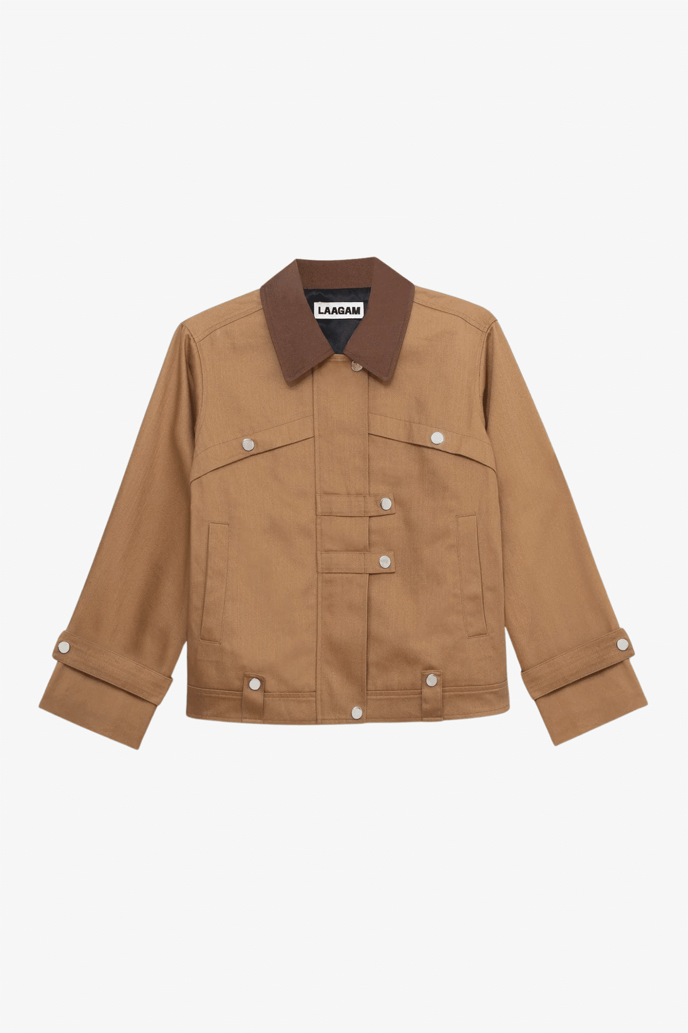 Ontdek het stijlvolle en duurzame damesjasje van Laagam, perfect voor elke gelegenheid. Dit modieuze bruine jasje heeft een gekruiste knoopsluiting met metalen drukknopen, die zowel functioneel als trendy zijn. De donkere kraag in dezelfde stof en decoratieve lussen voegen een verfijnde touch toe.