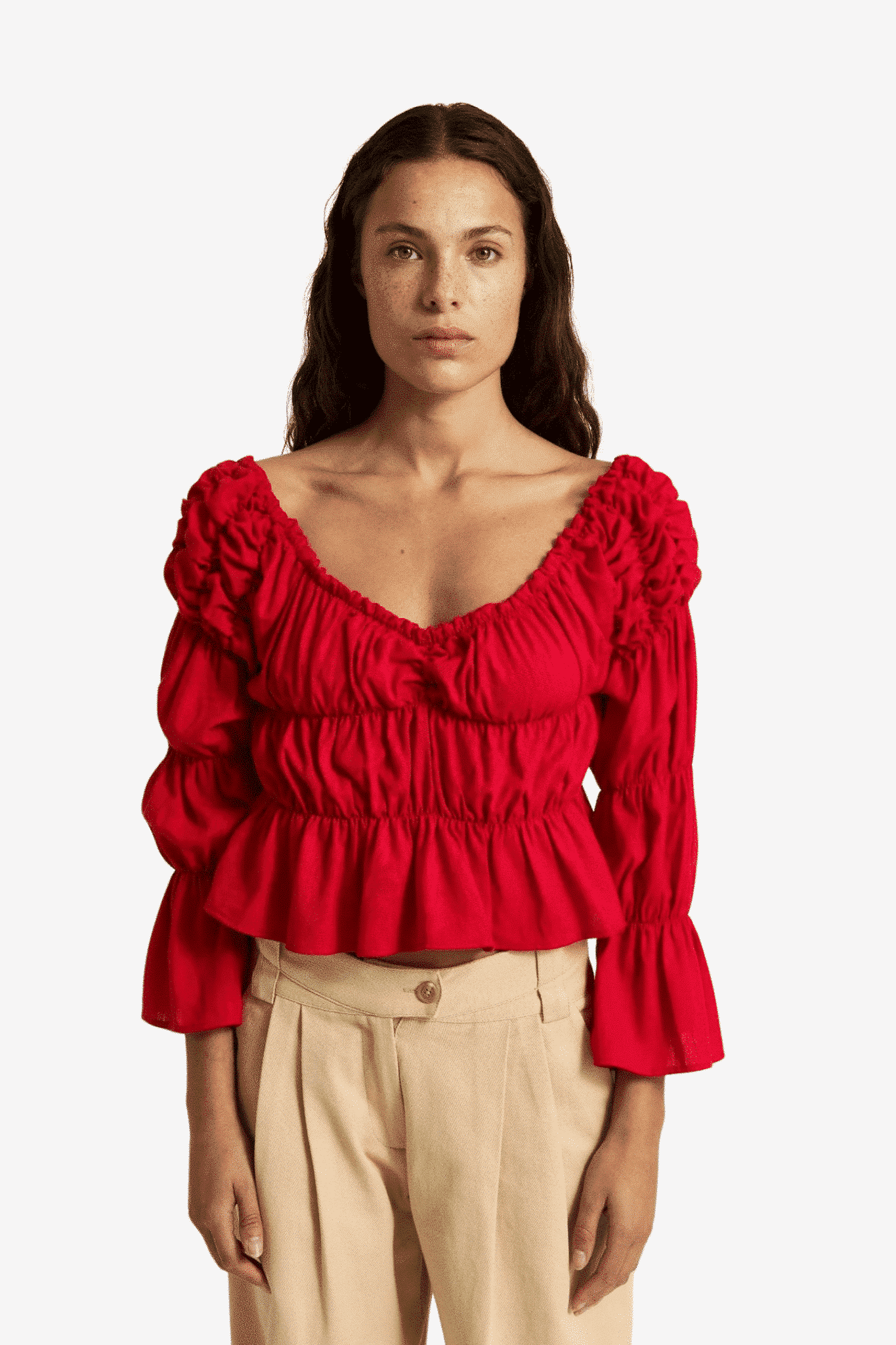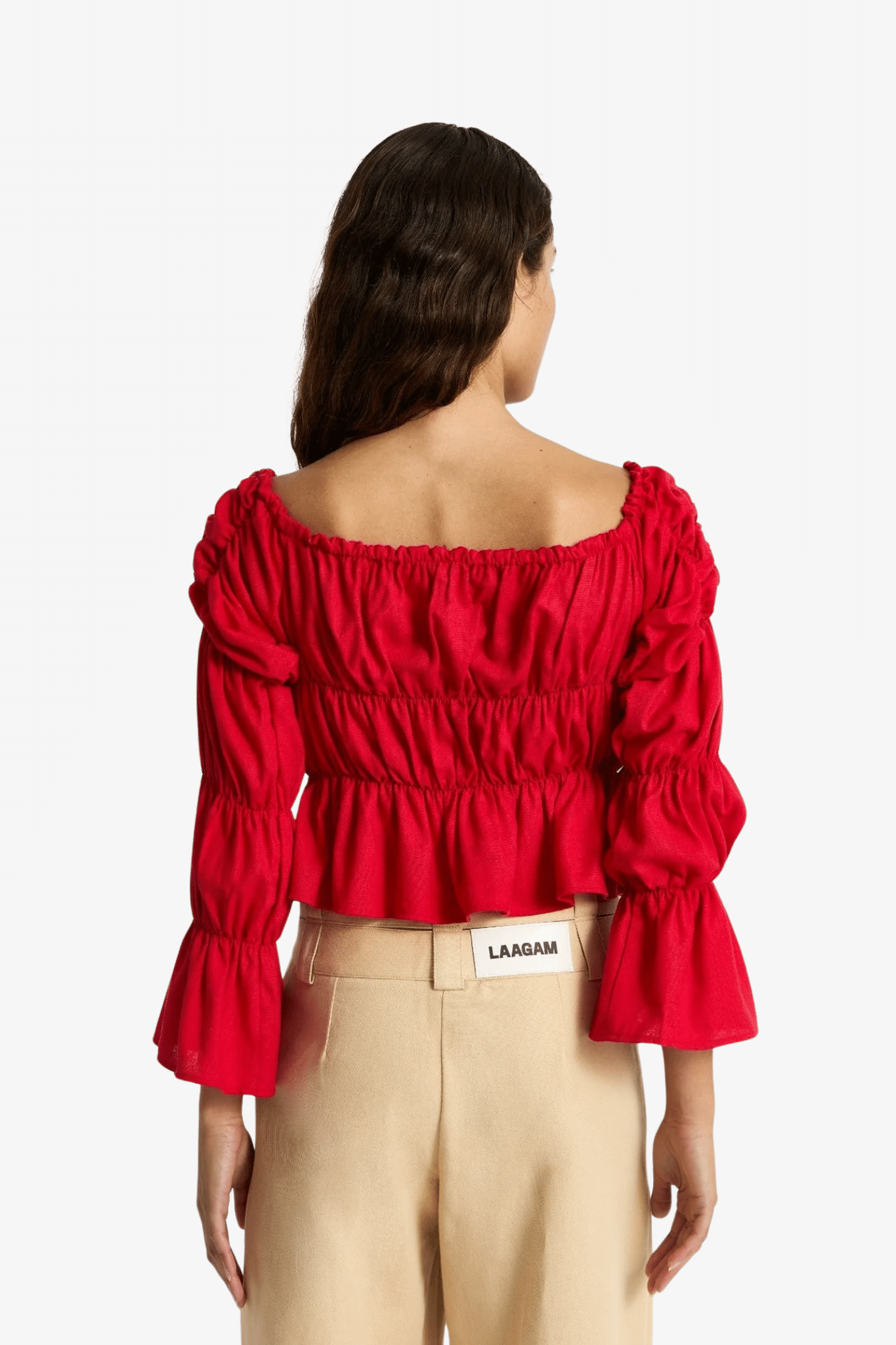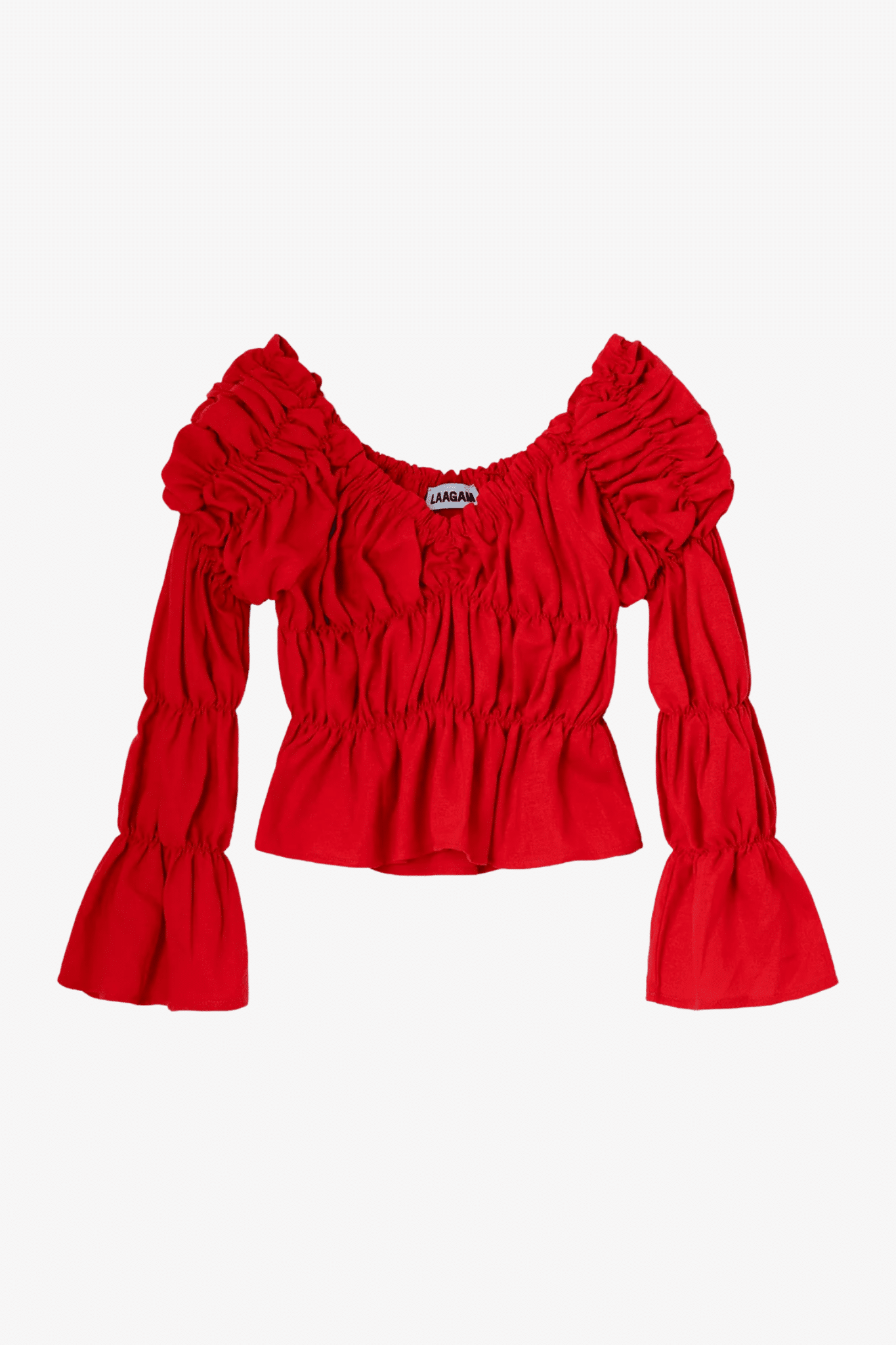 Ontdek de veelzijdigheid van de Laagam geplooide linnen blouse, een elegante blouse voor dames in een opvallende rode kleur. Deze blouse is ontworpen met lange mouwen en stijlvolle uitlopende manchetten voor een chique uitstraling. De ruches aan de zoom voegen een speelse touch toe.