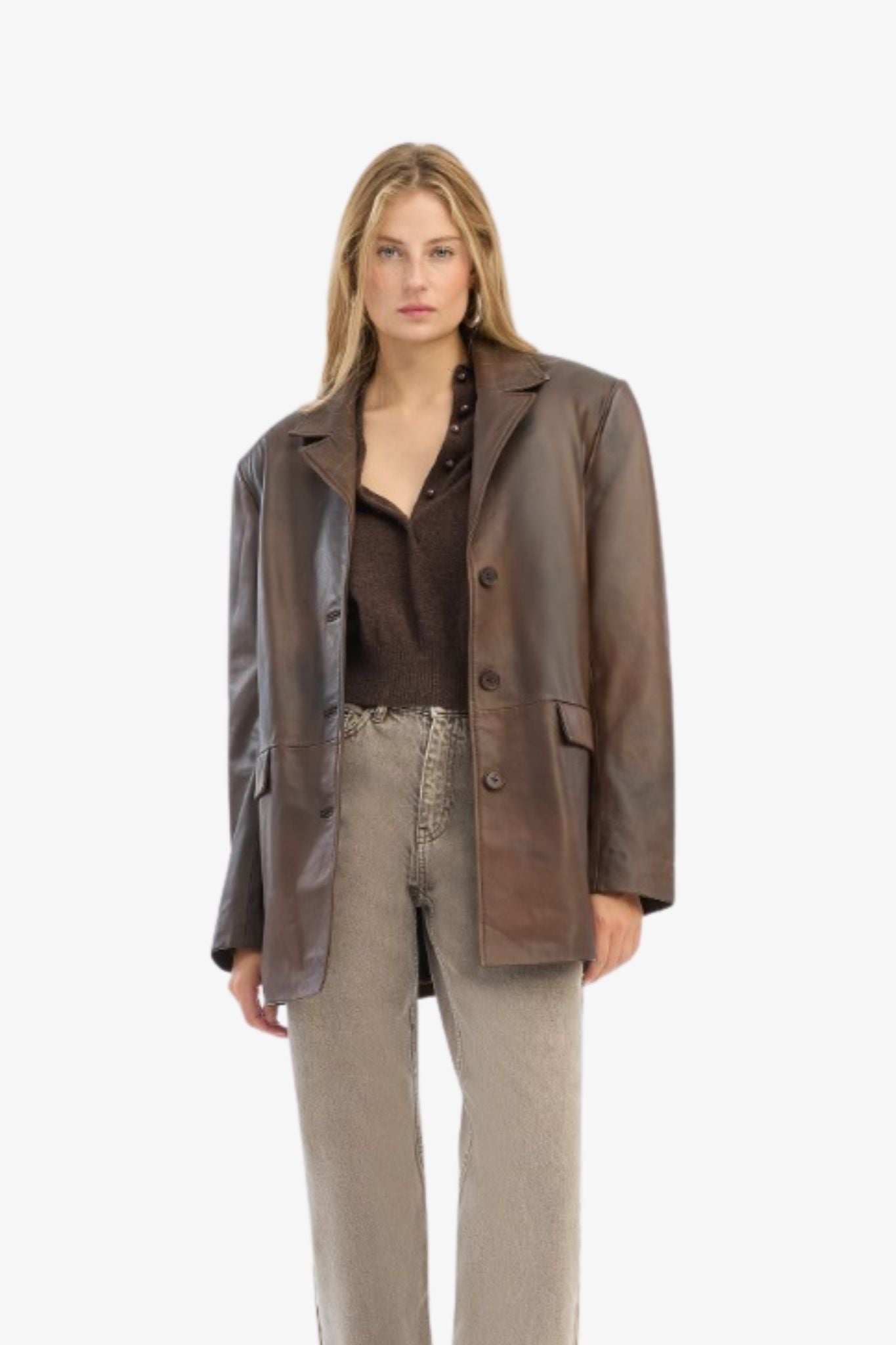 Elevate your wardrobe with the Leather Oversized Blazer in Dark Brown from Rotate. Crafted from smooth lamb leather, this blazer combines a timeless tailored feel with a modern oversized silhouette for effortless sophistication.