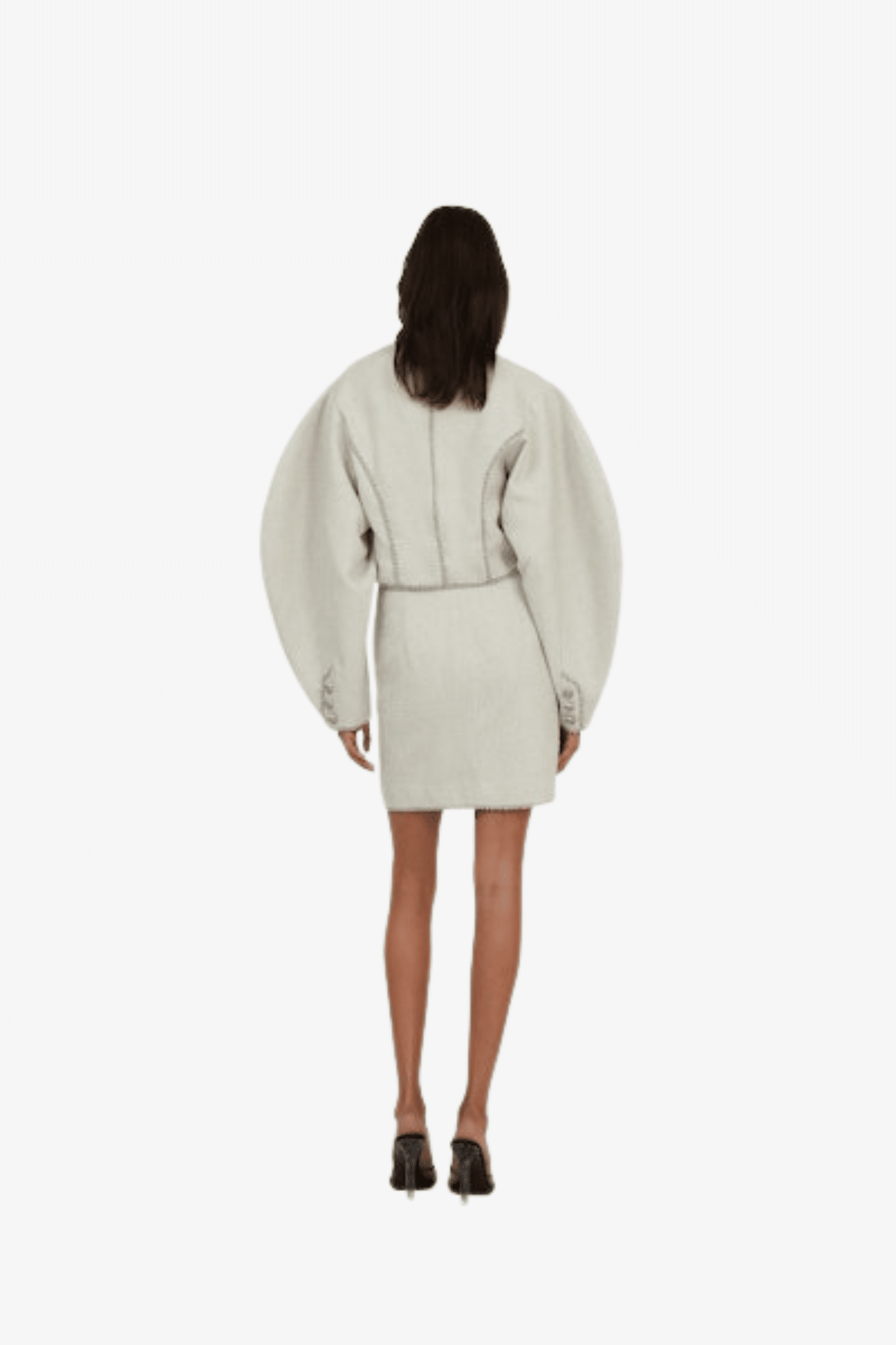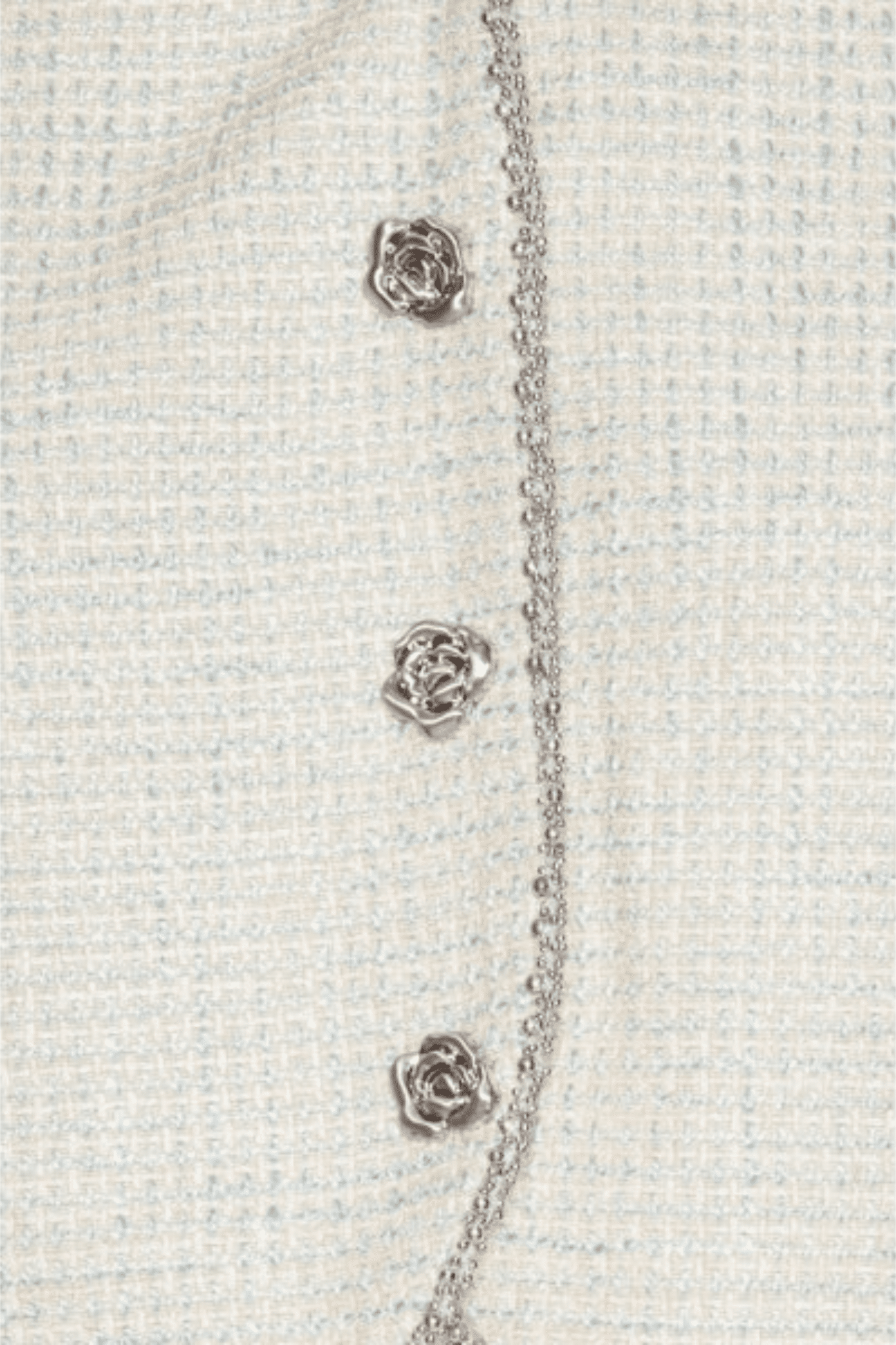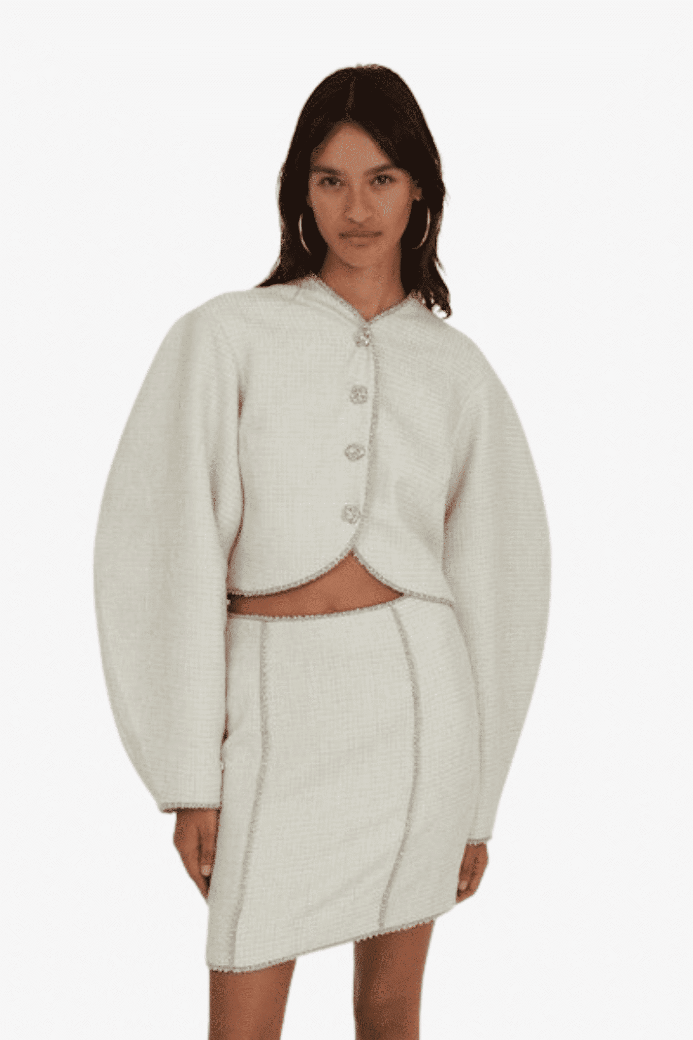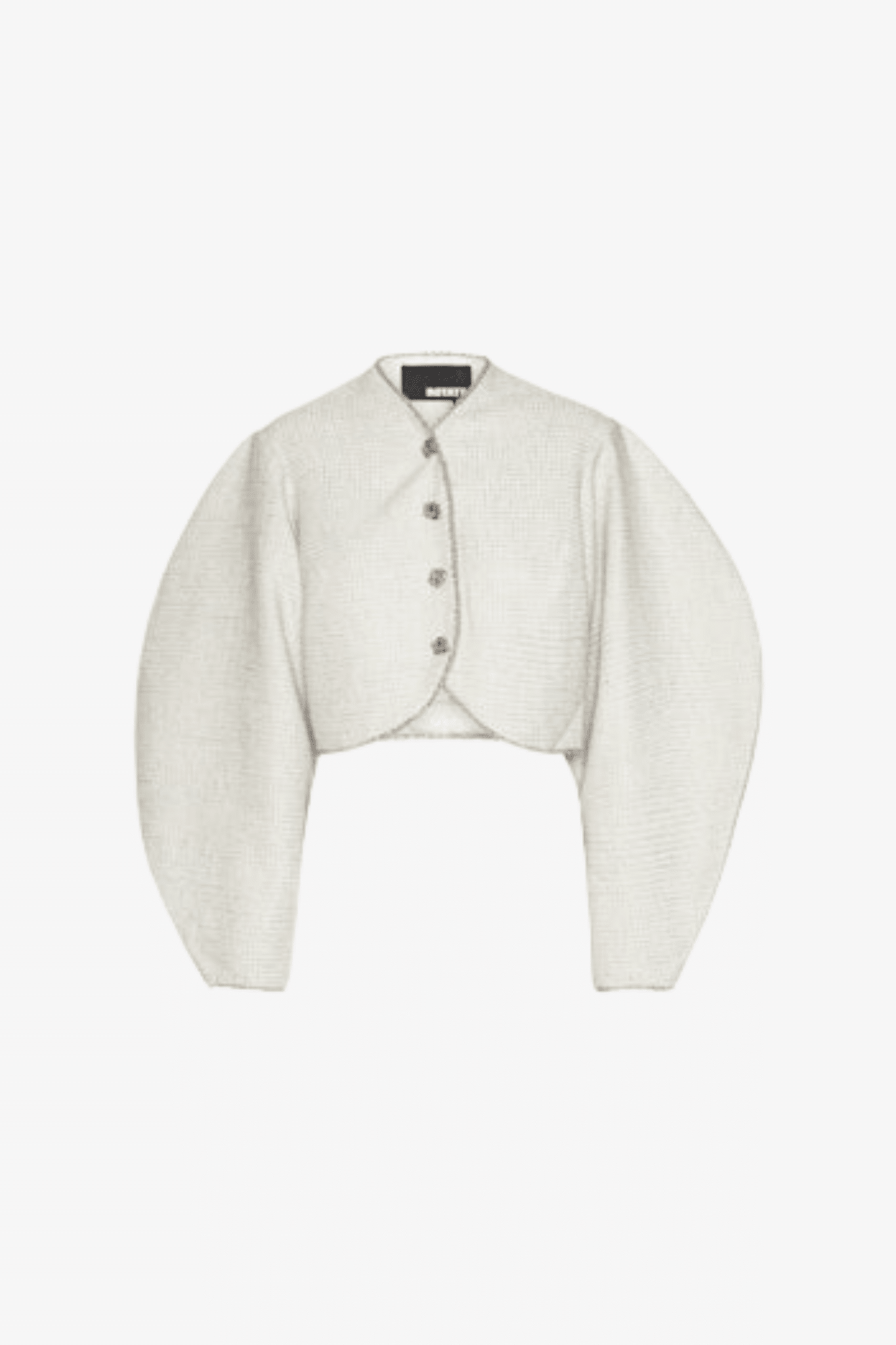 Ontdek de elegante charme van dit cropped damesjasje van Rotate, perfect voor elke fashion-forward garderobe. Het jasje beschikt over een stijlvol knoopsluiting aan de voorkant, waardoor je je look moeiteloos kunt aanpassen. De lange ballonmouwen zijn voorzien van knopen bij de manchetten voor een verfijnde afwerking. Vier decoratieve knopen aan de voorkant voegen een vleugje glamour toe, terwijl subtiele contrastranden langs de naden een gepolijste uitstraling bieden.